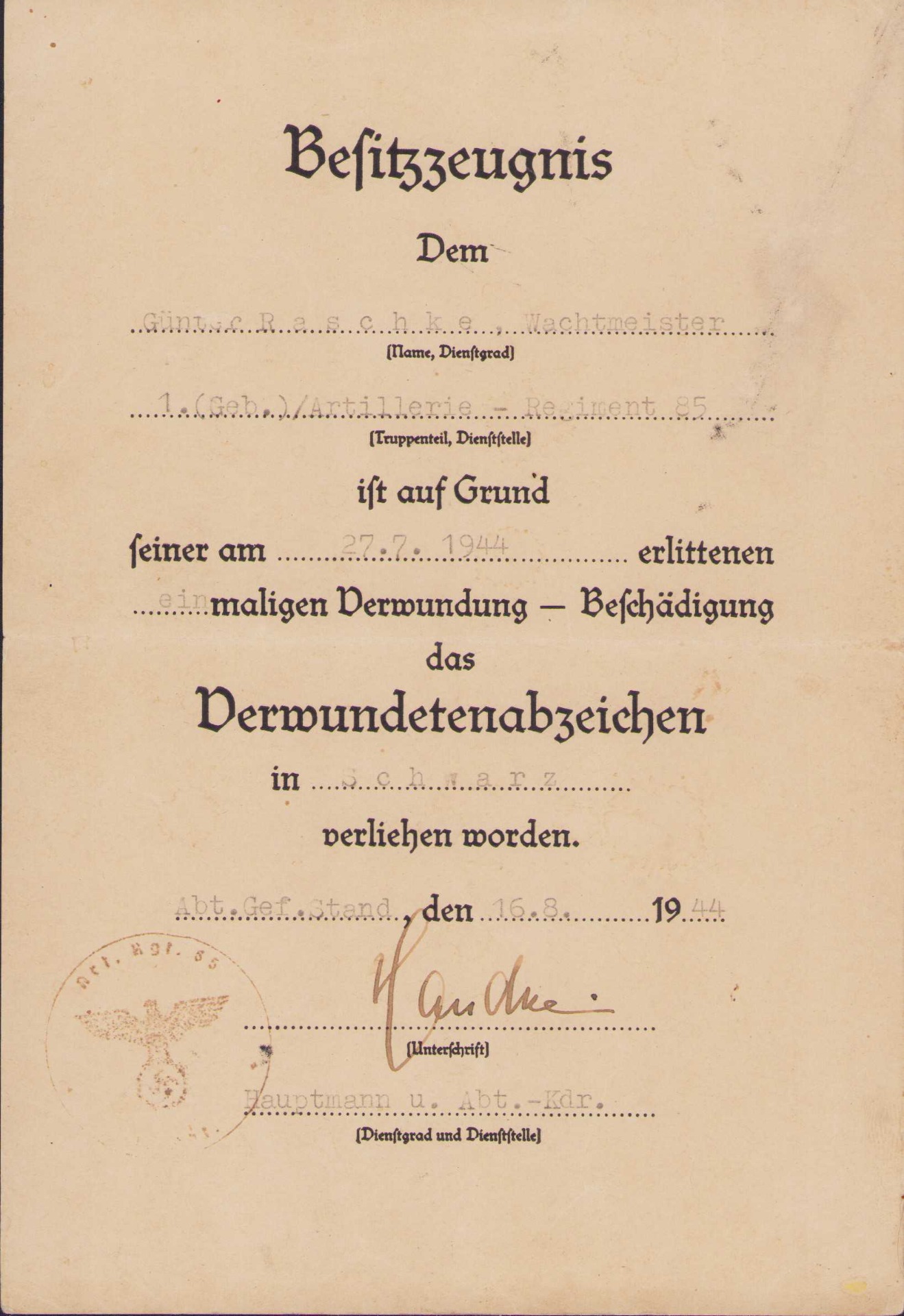 The document shows overall normal signs of wear. It named to Wachtmeister Günter Raschke who served in the 1.Batterie Gebirgs-Artillerie Regiment 85. This regiment was formed in December 1940 and was part of the 101.leichte Infanterie-Division. It saw its first combat in Croatia and after that in Kiev and Charkow. In July 1942 the I. and II.Abteilungen became Gebirgs-Abteilungen. The division was renamed in the 101.Jäger-Division in June of that same year.