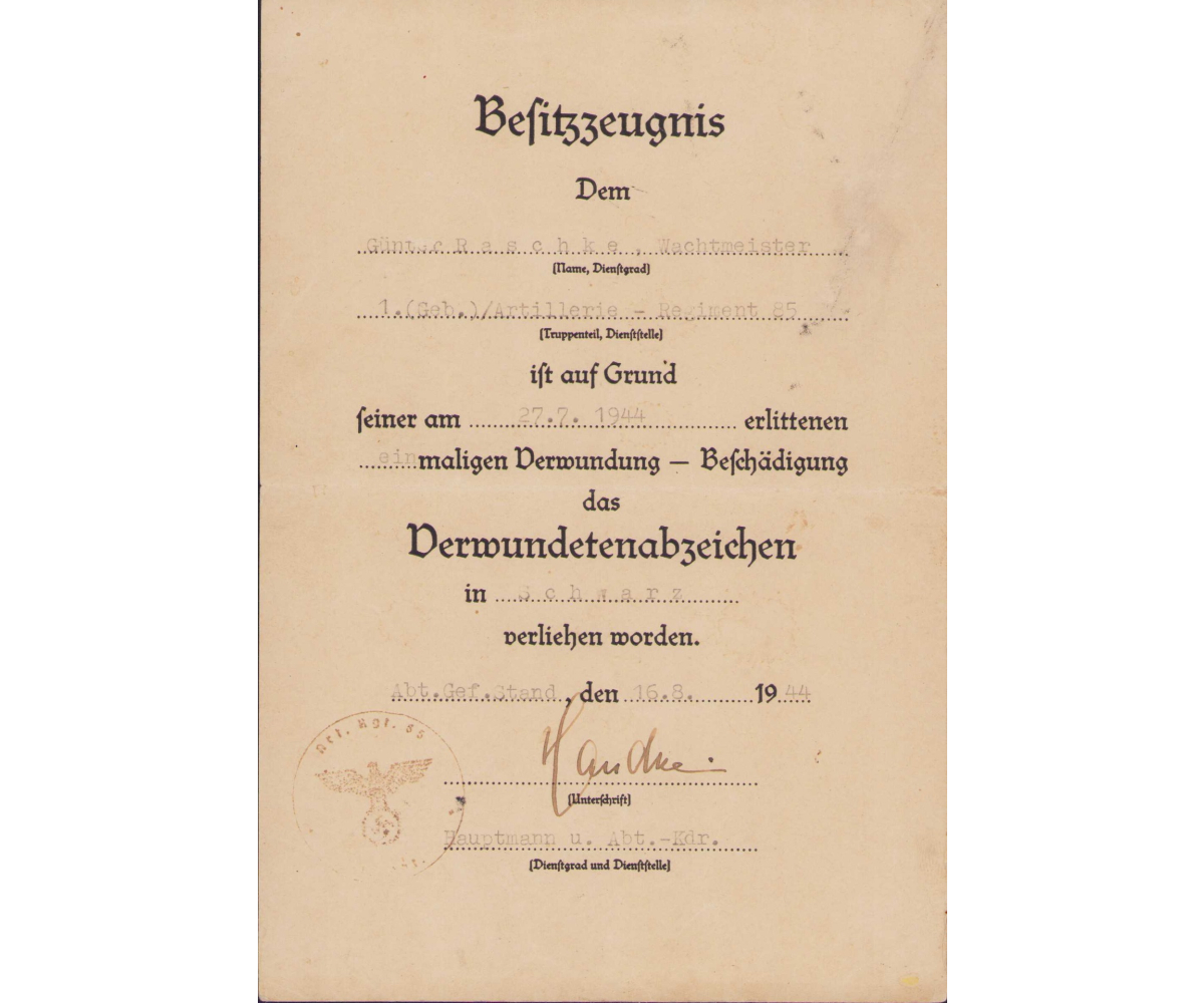 The document is dated 16th of August 1944 and he was awarded the medal for the wound he got on the 27th of July 1944. The document is signed by Hauptmann und Abteilung Kommandeur Günther Handke. Handke was wearer of the Deutsches Kreuz in Gold and Ehrenblattspange des Heeres und SS (1945)