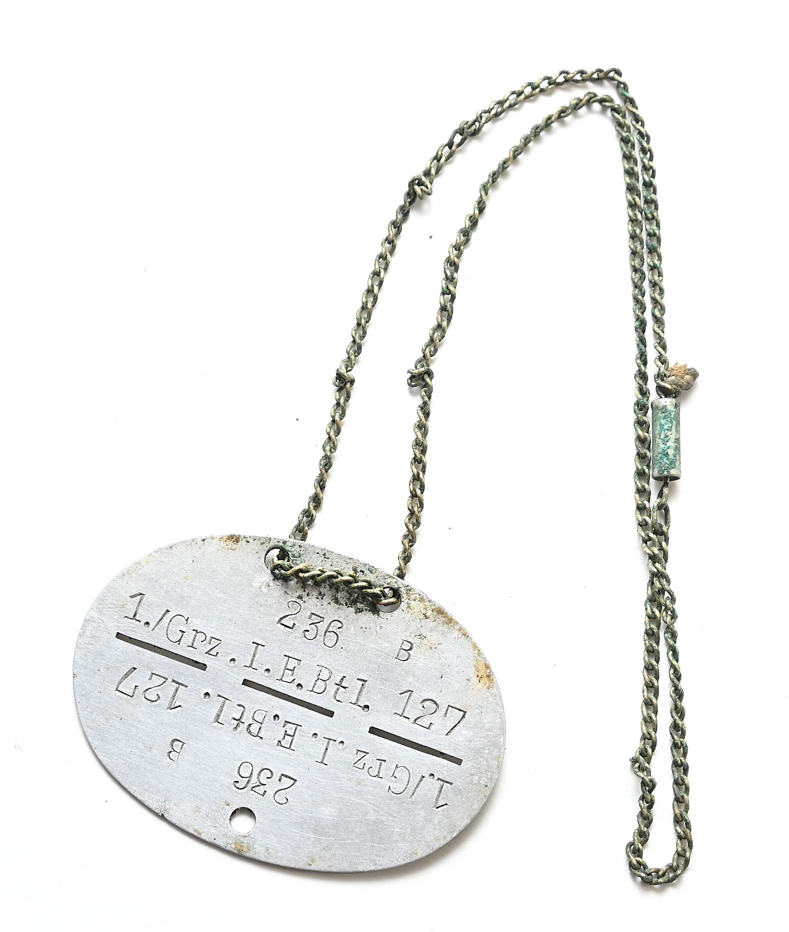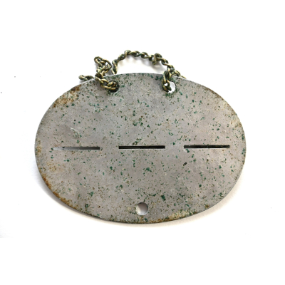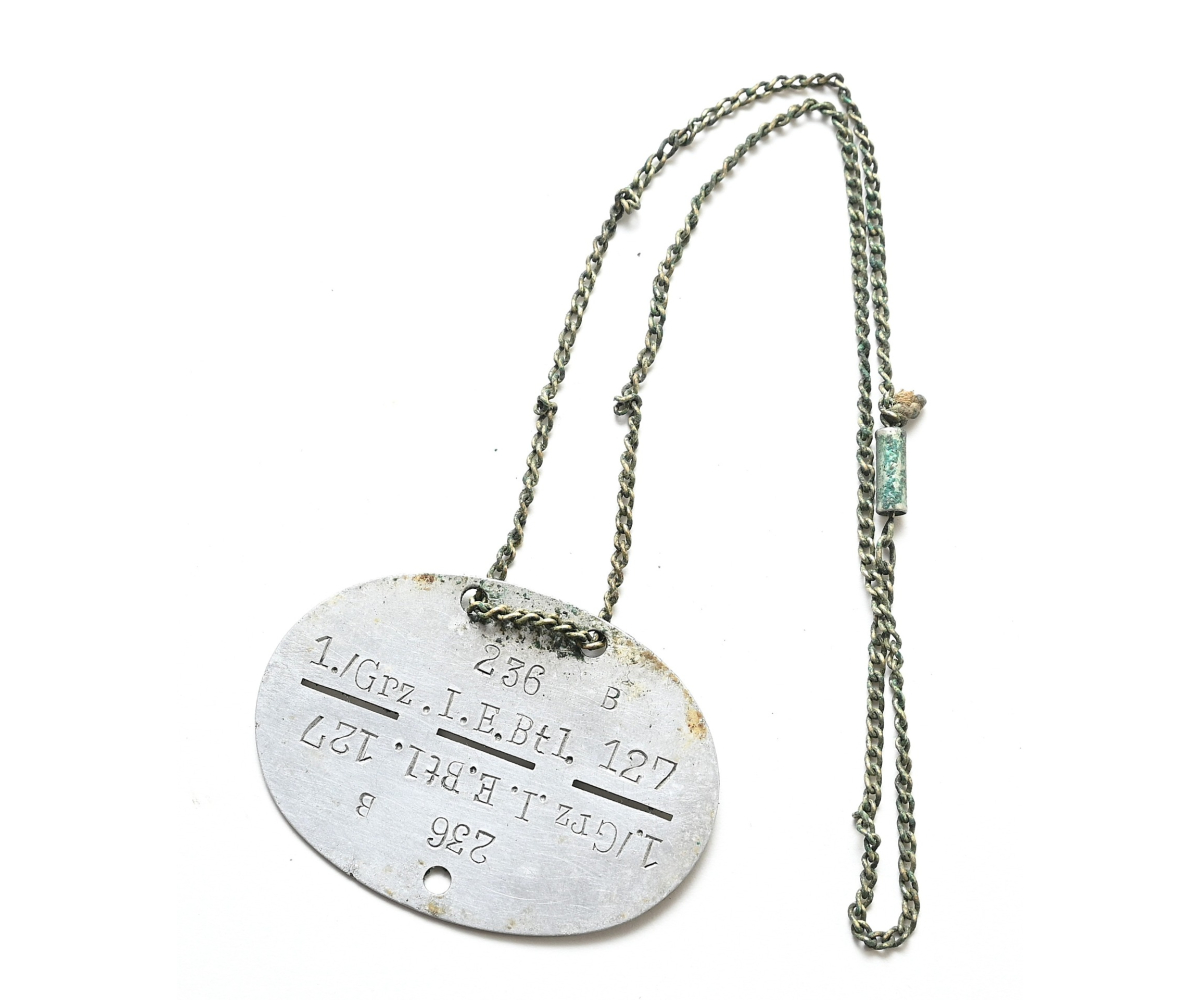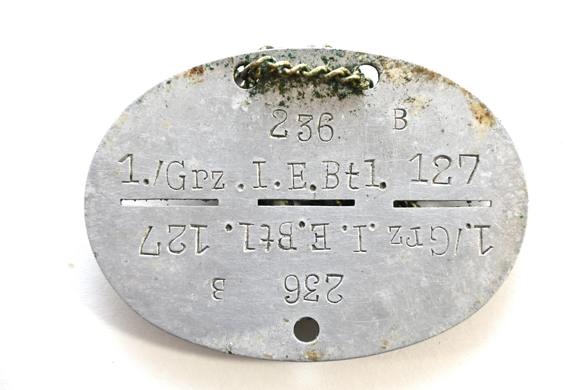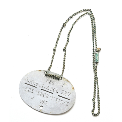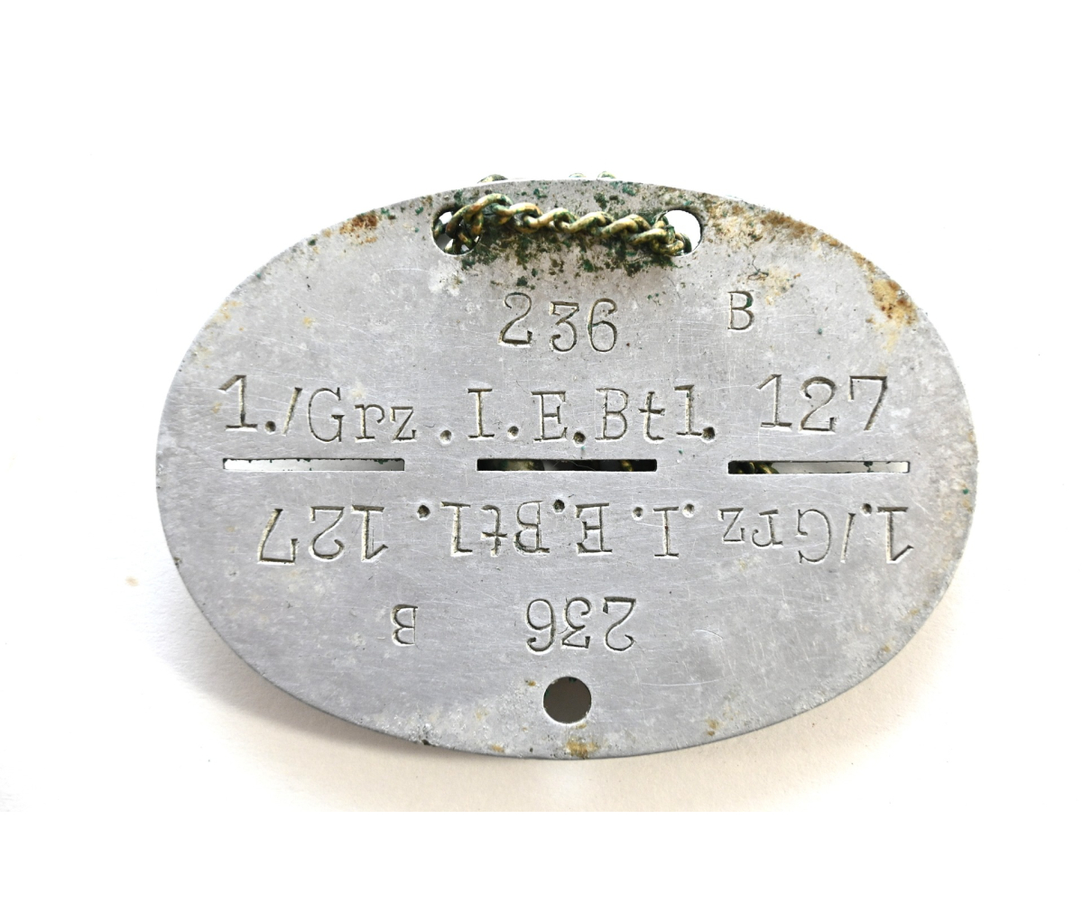 The dog tag or 'Erkennungsmarke' shows signs of wear. The soldier of the tag served within the 1.Kompanie Grenz Infanterie Ersatz Bataillon 127. The bataillon was formed in August 1939 in Idar-Oberstein. In Dezember 1939 the bataillon was used to form the II.Bataillon Infanterie Regiment 332 which was part of the 197.Infanterie-Division.