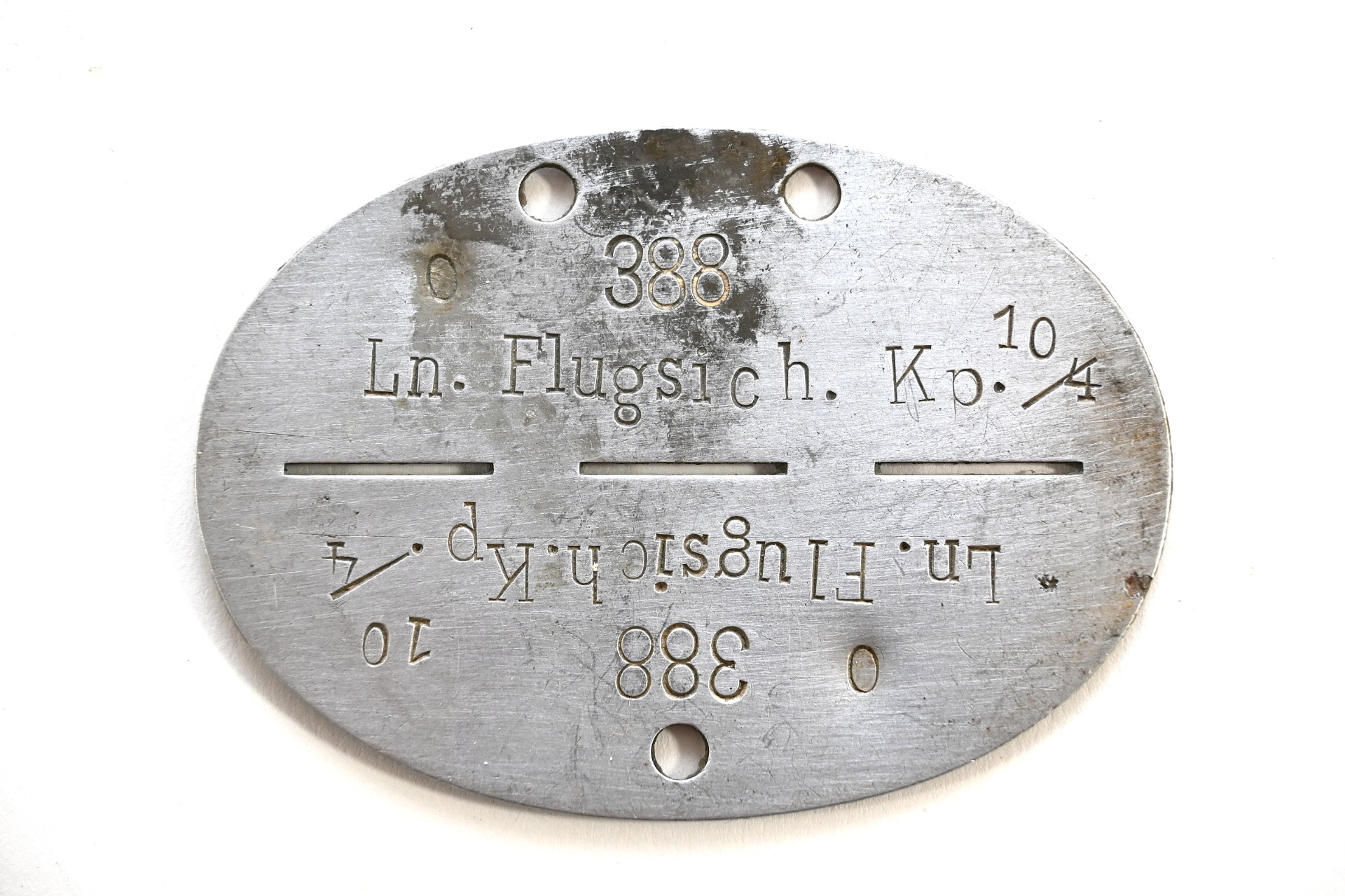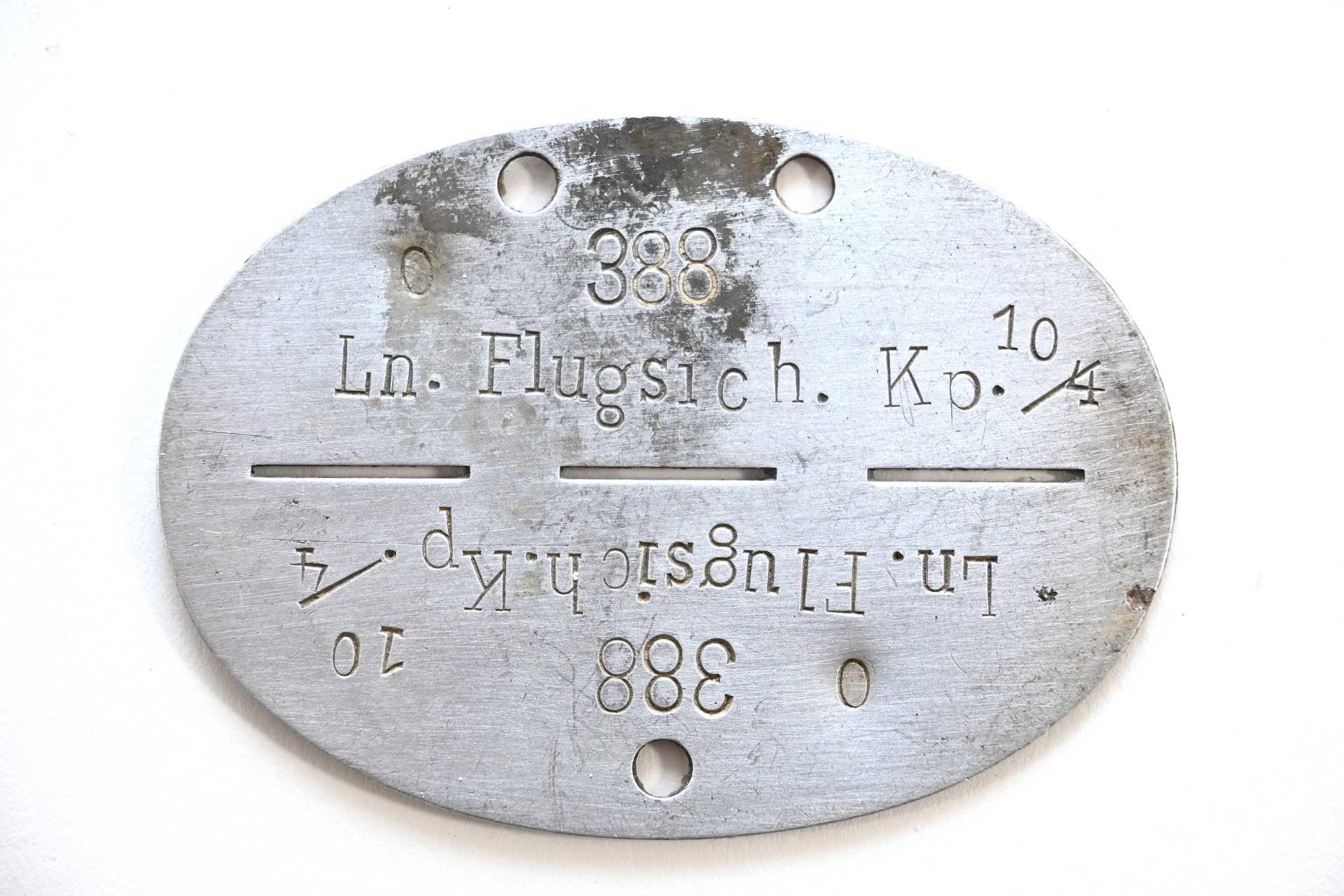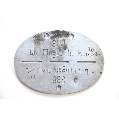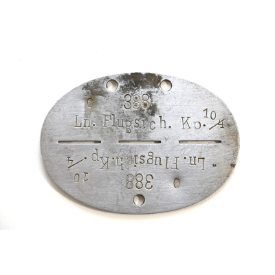 The tag or 'Erkennungsmarke' shows overall normal signs of wear. It belonged to a soldier who served in the 10.Flugsicherungs Kompanie Luftnachrichten Regiment 4. However in 1939 it only existed on paper and was not formed. No for a least a couple of years. In July 1943 it was formed, but in Oktober 1944 it was used to form the 15.Funkhorch Kompanie Luftnachrichten Regiment 353.