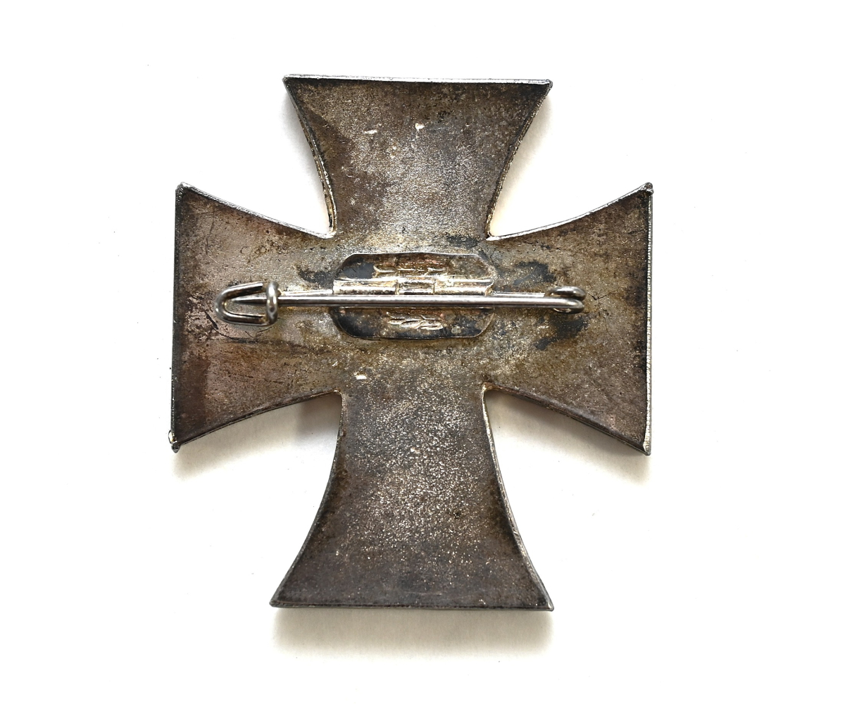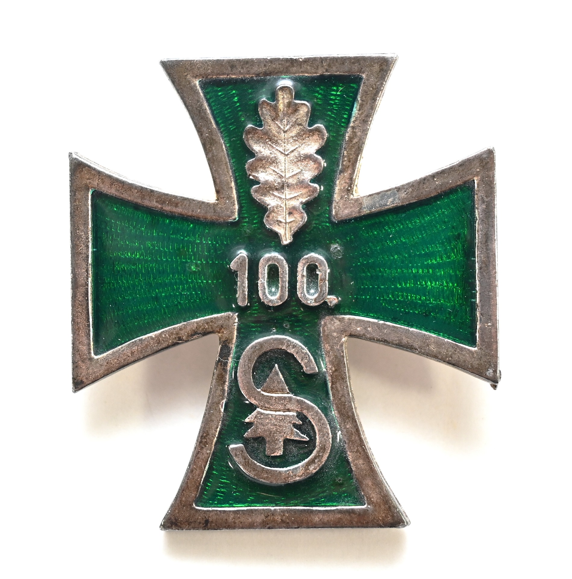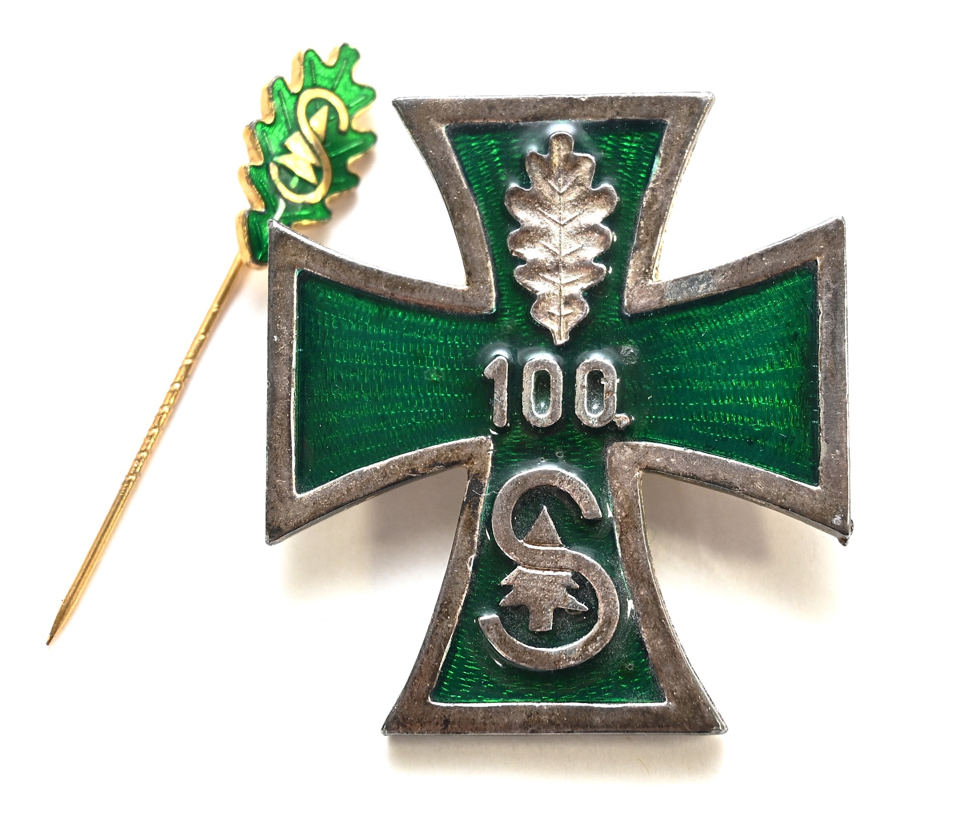 The large cross shows overall normal signs of wear. It's complete with working needle on the back. This cross was issued postwar to veterans who served within the 100.Jäger-Division. The 'S' refers to Leutnant-General Werner Sanne. It came together with its matching award document.