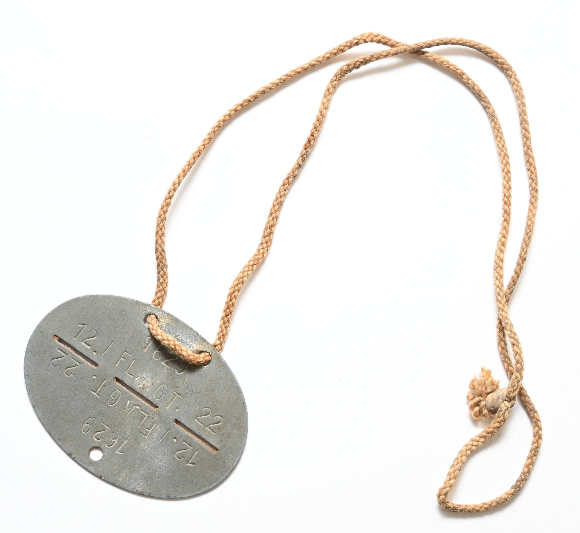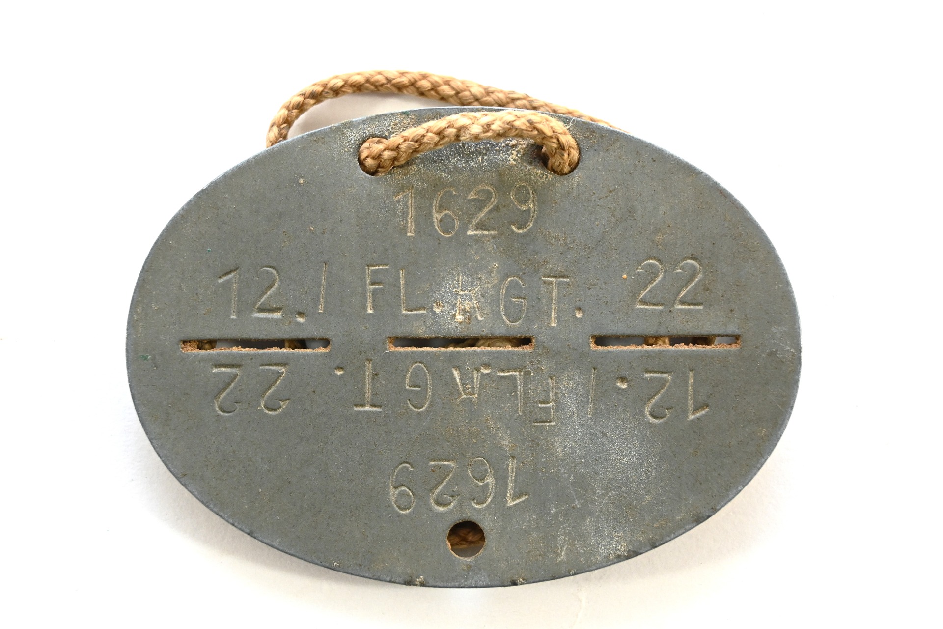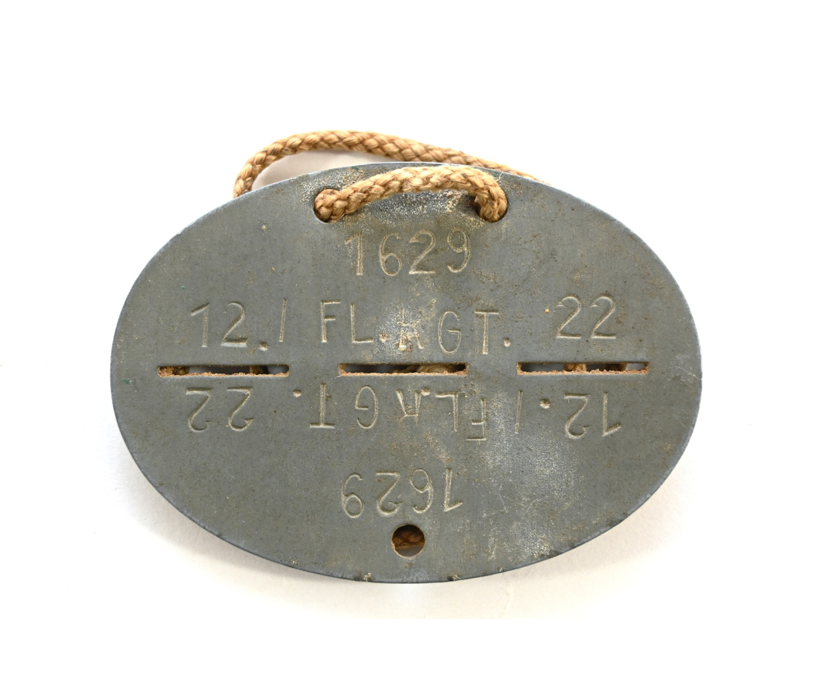 The tag or 'Erkennungsmarke' shows overall normal signs of wear. It belonged to a soldier who served/was drafted in the 12.kompanie Flieger Regiment 22. This regiment was formed in April 1939. In November 1940 it moved to Warschau and in April 1941 to Gent, Belgium. In August 1942 it was renamed into Flieger Regiment 22 and in June 1944 it was renamed into Luftgau-Feld-Regiment Belgien-Nordfrankreich (mot. ) 22. The regiment was disbanned in September 1944 and the remnants where absorbed by the 3. or 5.Fallschirm-Division.