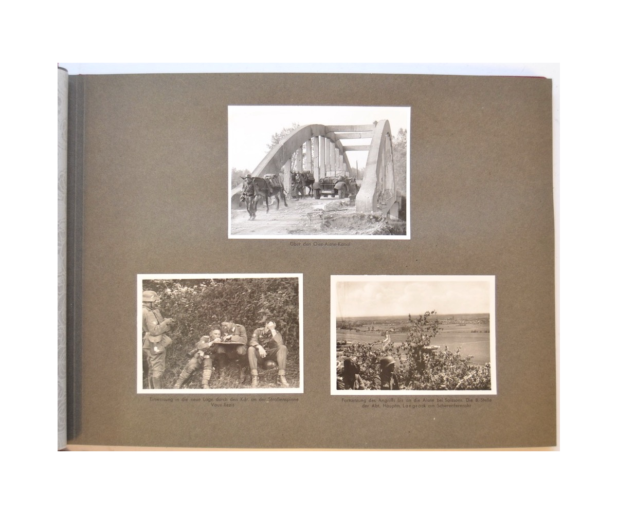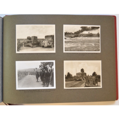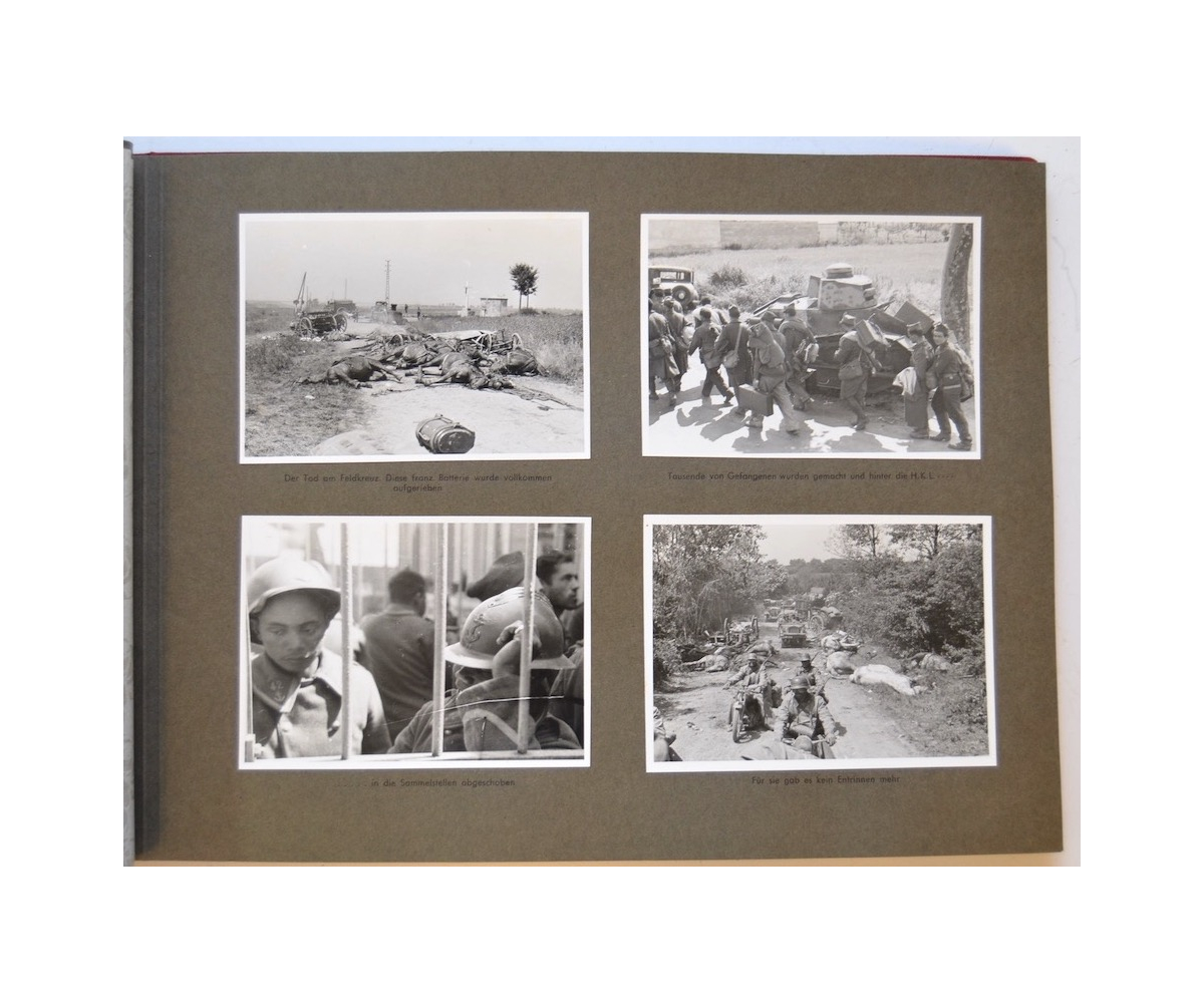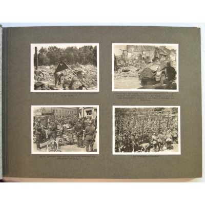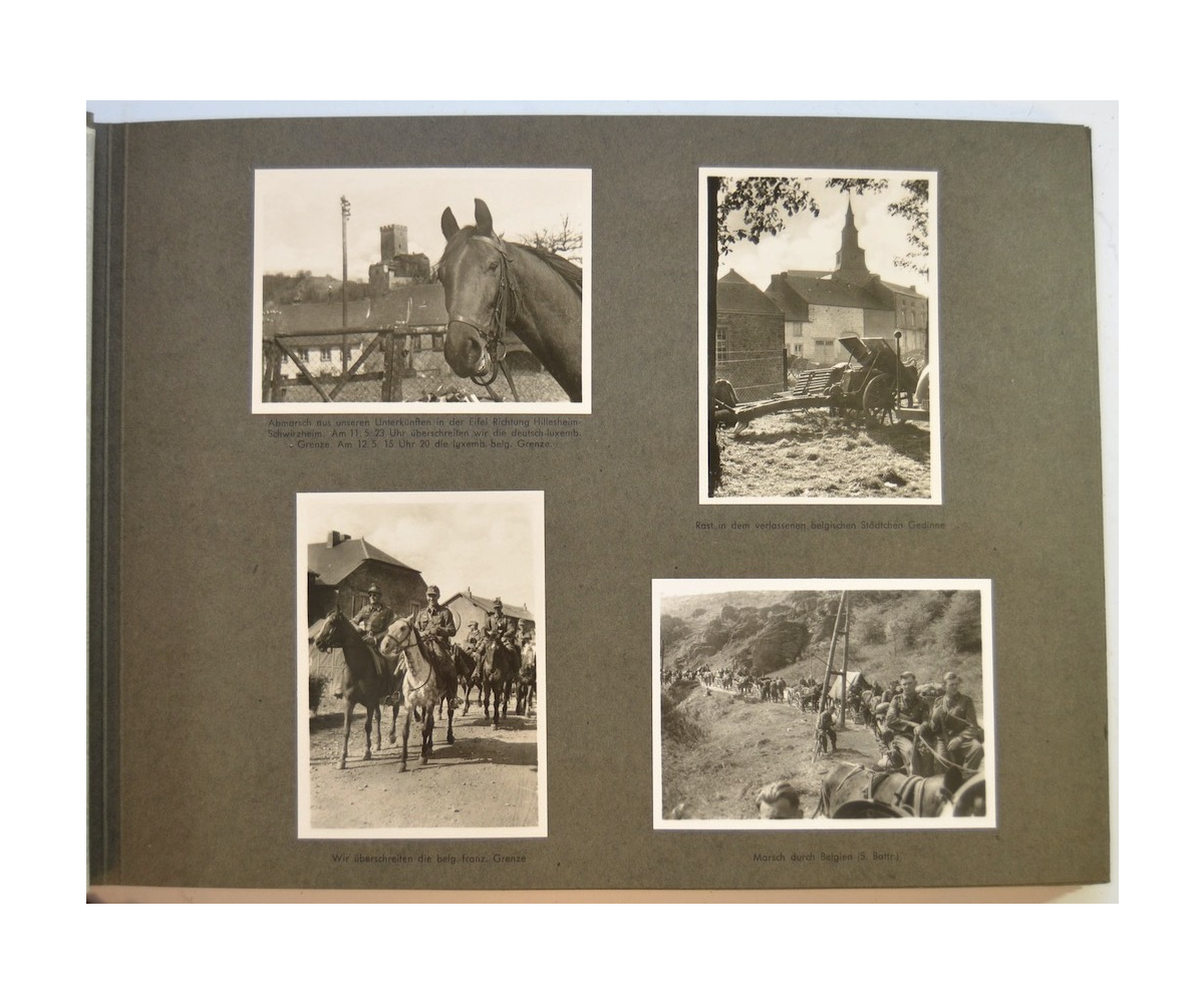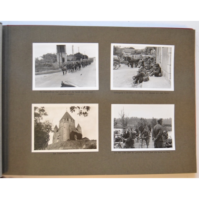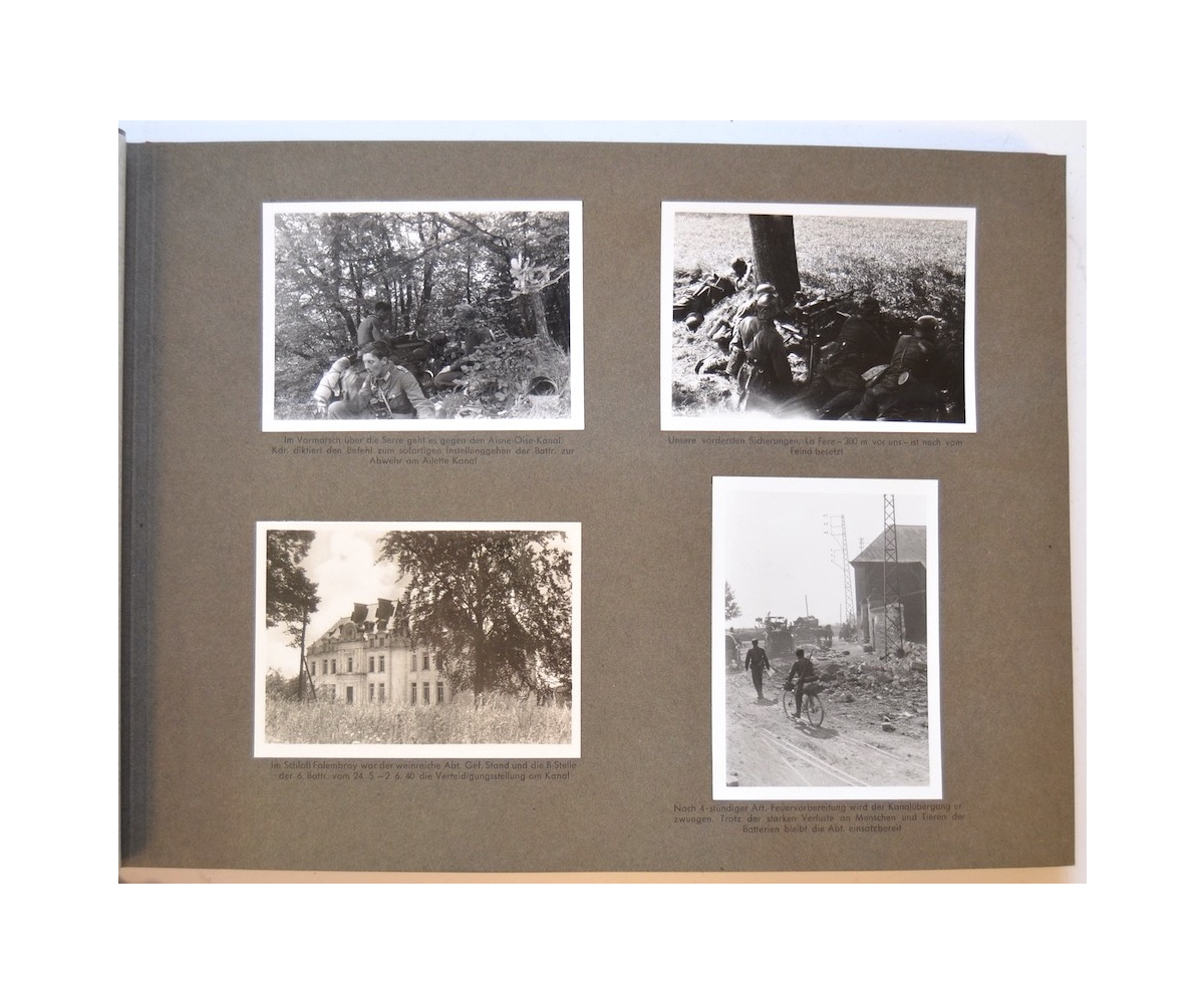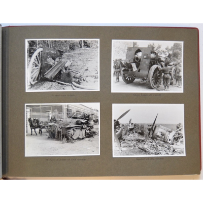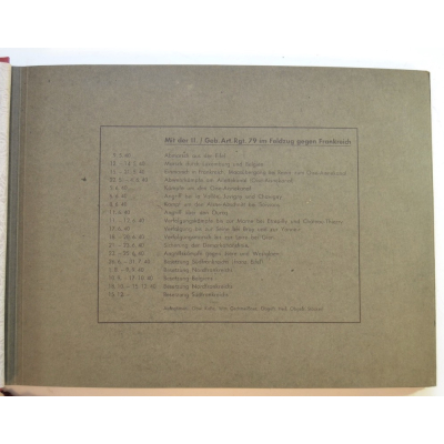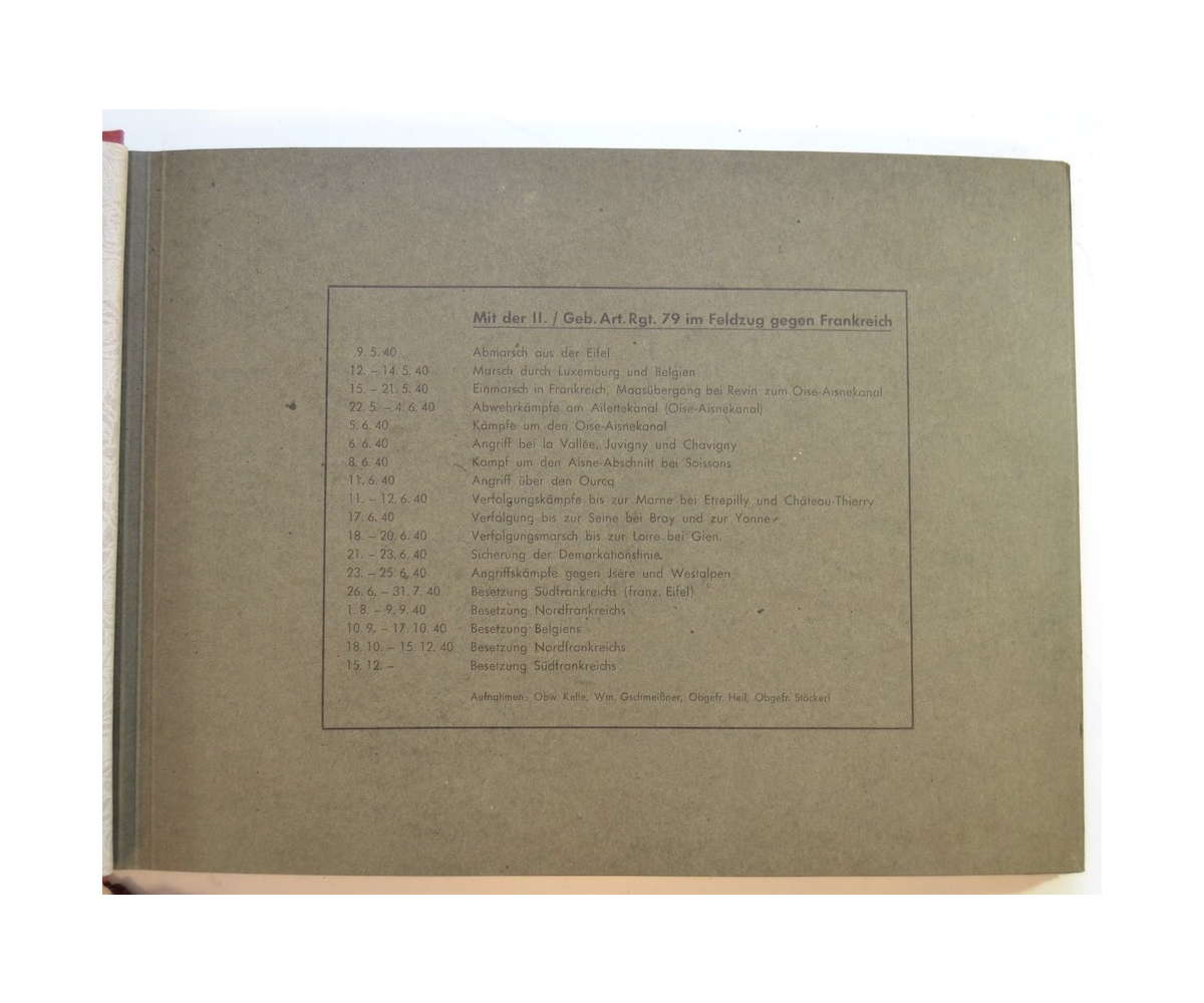 The album shows overall normal signs of wear. It's solid and complete with all pages. The album contains a total of 90 'Bilder' or pictures. Each picture has it's own description. The pictures are taken from the second kompanie of Gebirgs-artillerie Regiment 79 during the 'feldzug' (campaign) against France from May 9, 1940 until (and during) the occupation circa December 15, 1940.
