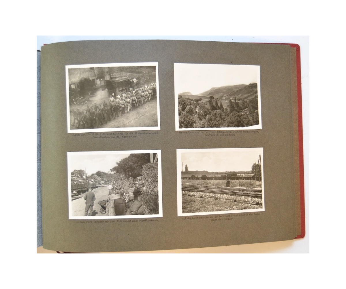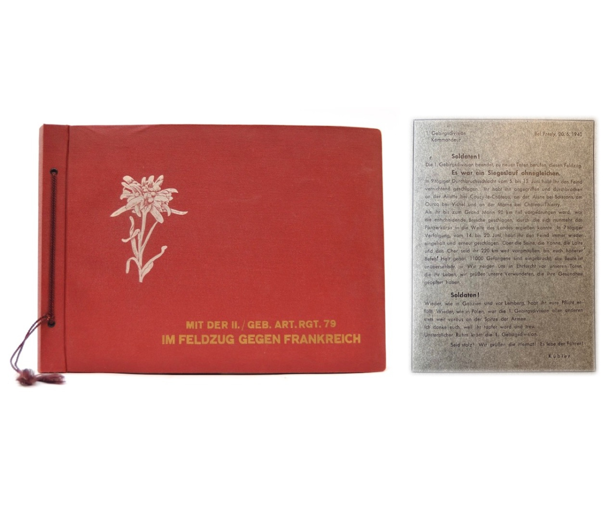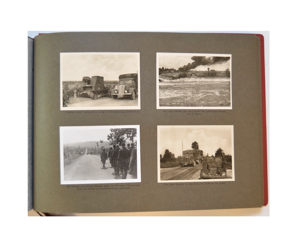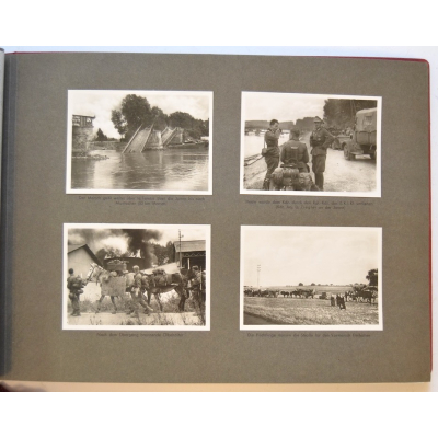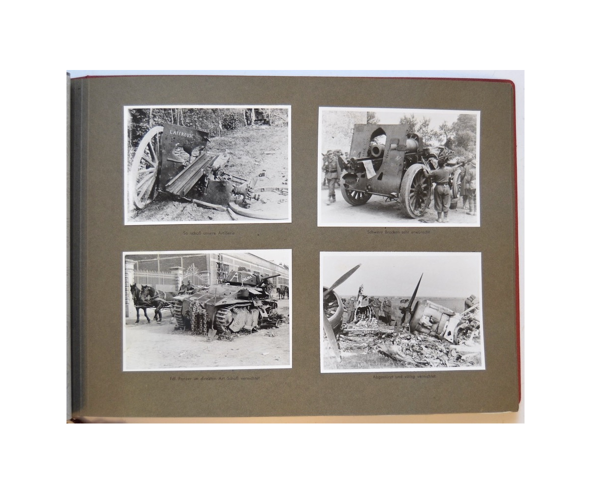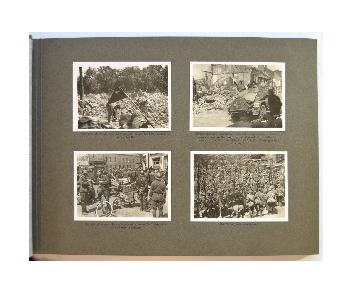 The album shows overall normal signs of wear. It's solid and complete with all pages. The album contains a total of 90 'Bilder' or pictures. Each picture has it's own description. The pictures are taken from the second kompanie of Gebirgs-artillerie Regiment 79 during the 'feldzug' (campaign) against France from May 9, 1940 until (and during) the occupation circa December 15, 1940.