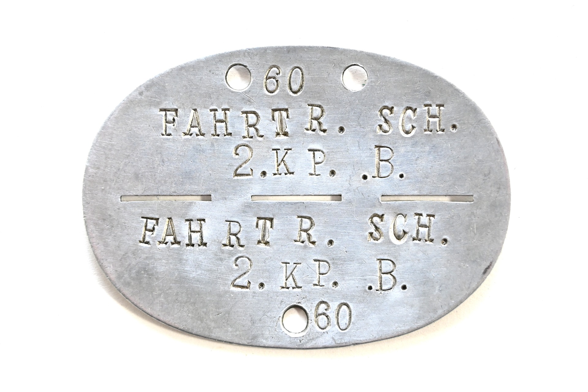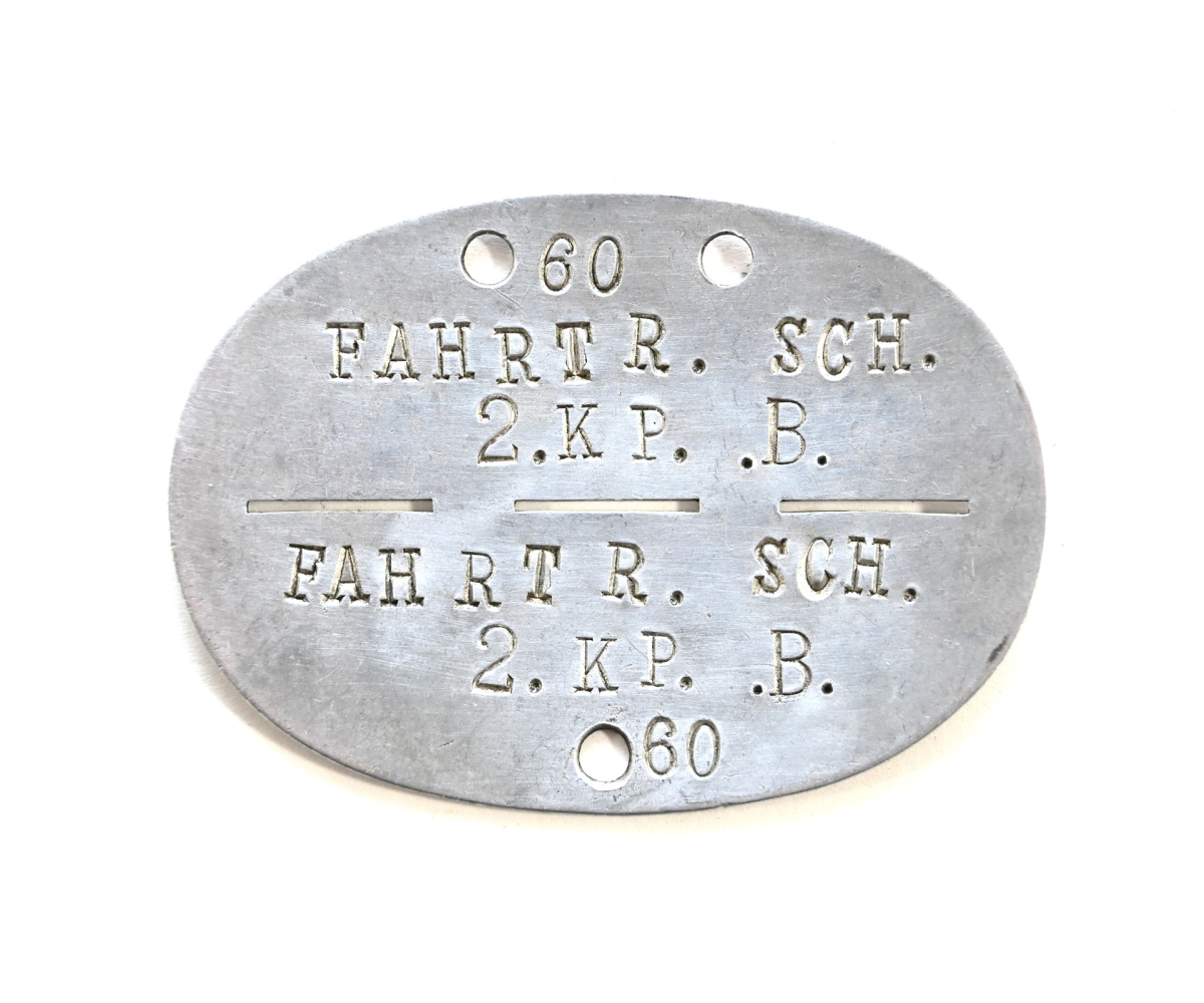 The tag or 'Erkennungsmarke' shows overall normal signs of wear. It belonged to a soldier who was drafted or served in the 2.Kompanie Fahrtruppenschule. Which schule this exactly was, we don't know. It could be Fahrtruppenschule Hannover.