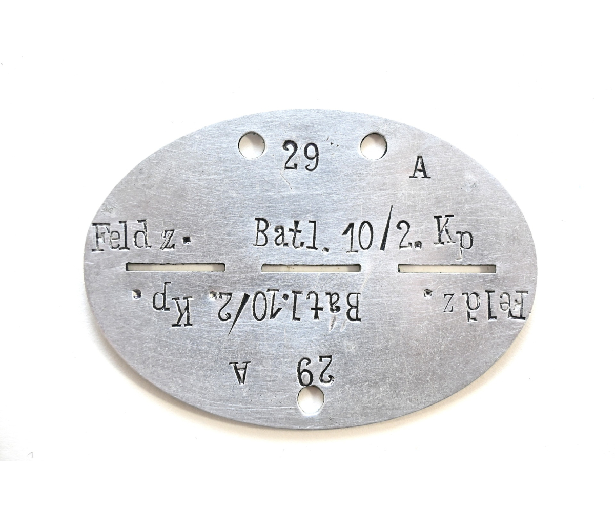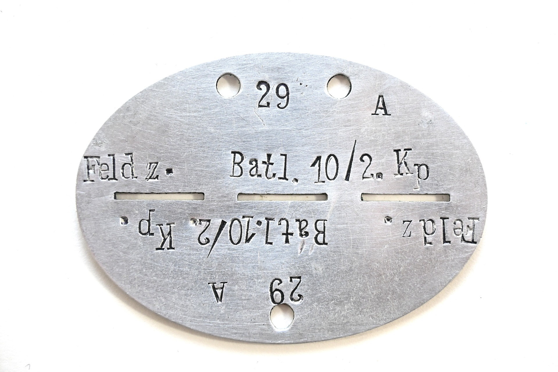 The tag or 'Erkennungsmarke' shows overall normal signs of wear. It belonged to a soldier who served within the 2.Kompanie Feldzeug Bataillon 10. This unit was formed in October 1940 in Euskirchen and was put into action for the first time in West France in 1940. In late 1944, early 1945 it operated under Heeresgruppe G on the Western front. A Feldzeug unit was a military technical and logistics unit.
