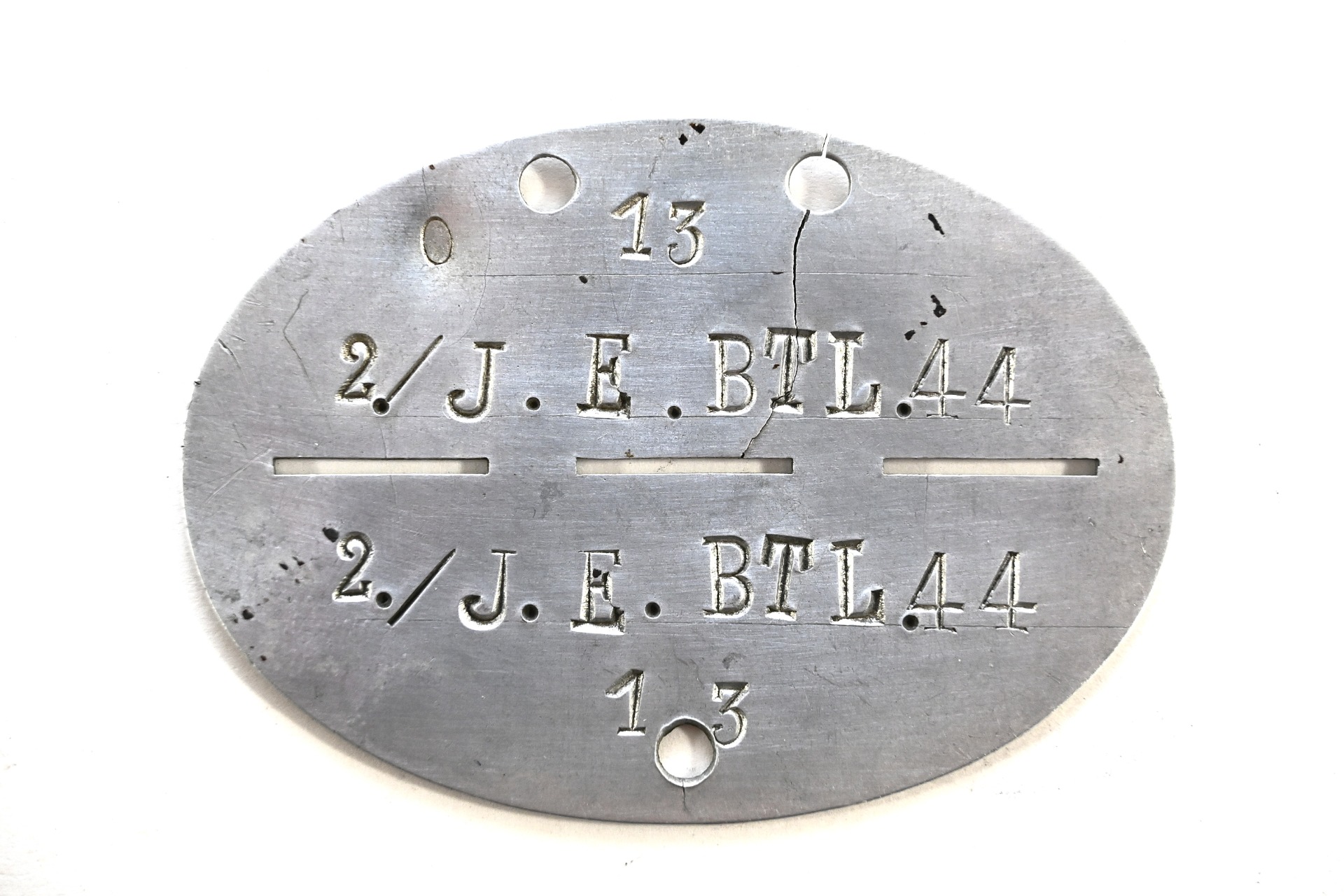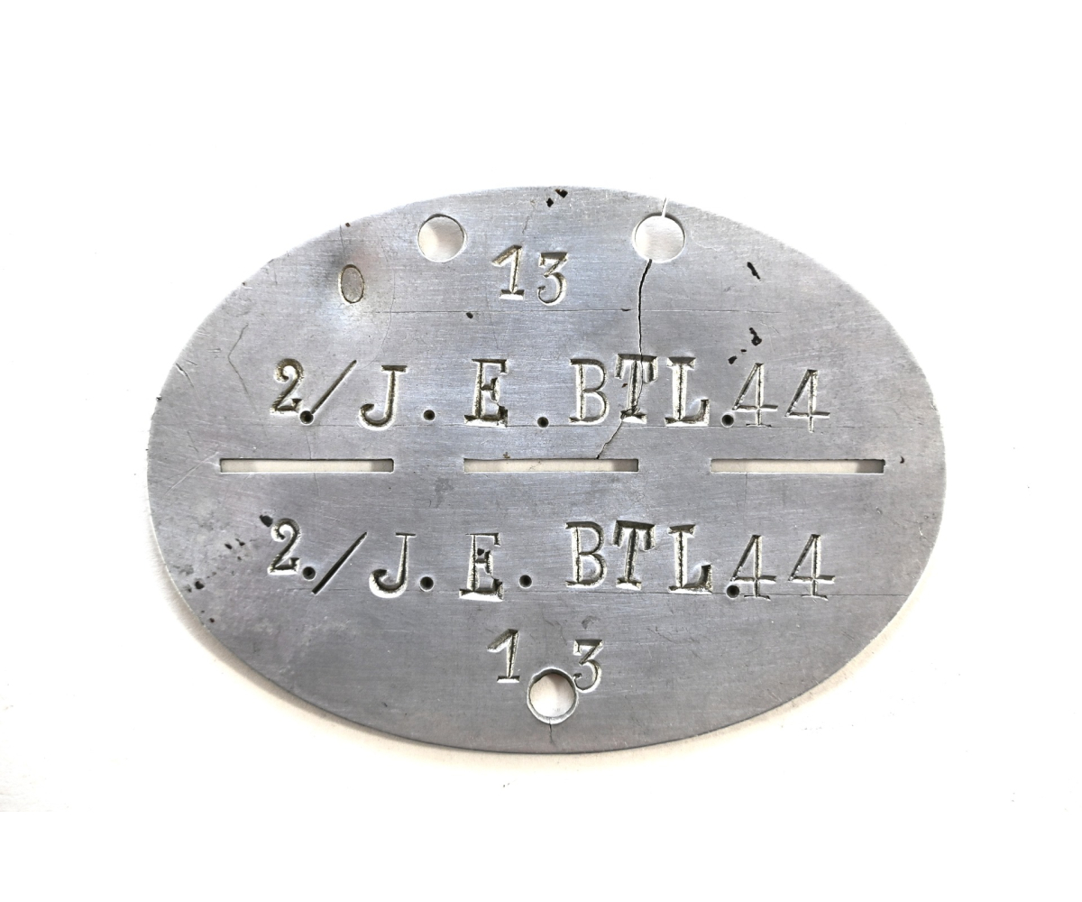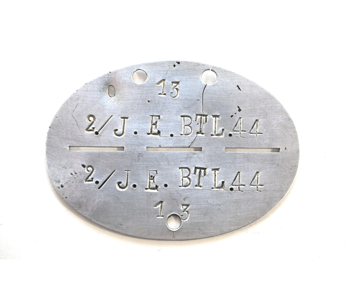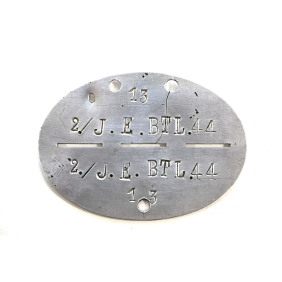 The tag or 'Erkennungsmarke' shows overall normal signs of wear. It belonged to a soldier who was drafted in the 2.Kompanie Infanterie Ersatz Bataillon 44. This bataillon was formed in late August 1939. It trained and supplied soldiers for Infanterie Regiment 44 which was part of the 11.Infanterie-Division. This division participated in the invasion of Belgium and France, stayed on the French coast until it moved to the east in March 1941 to prepare for the invasion of Russia that took place in June 1941. It operated mainly in the areas of Wolchow, Leningrad and Pleskau.