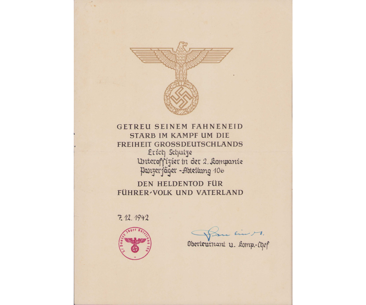 The commemorative document shows overall normal signs of wear. It's named to an Unteroffizier Erich Schulze who served in the 2.Kompanie Panzerjäger Abteilung 106. This unit was part of the Divisionseinheiten der 106.Infanterie-Division. The abteilung was formed in December 1940. The division and her units operated the entire war on the eastern front and fought in areas like Wilna, Gshatsk, Smolensk, Charkow and more.