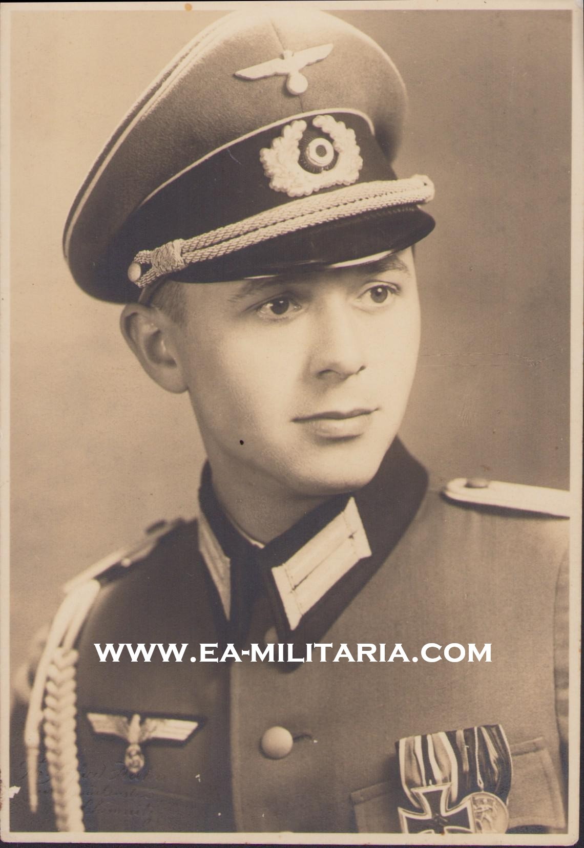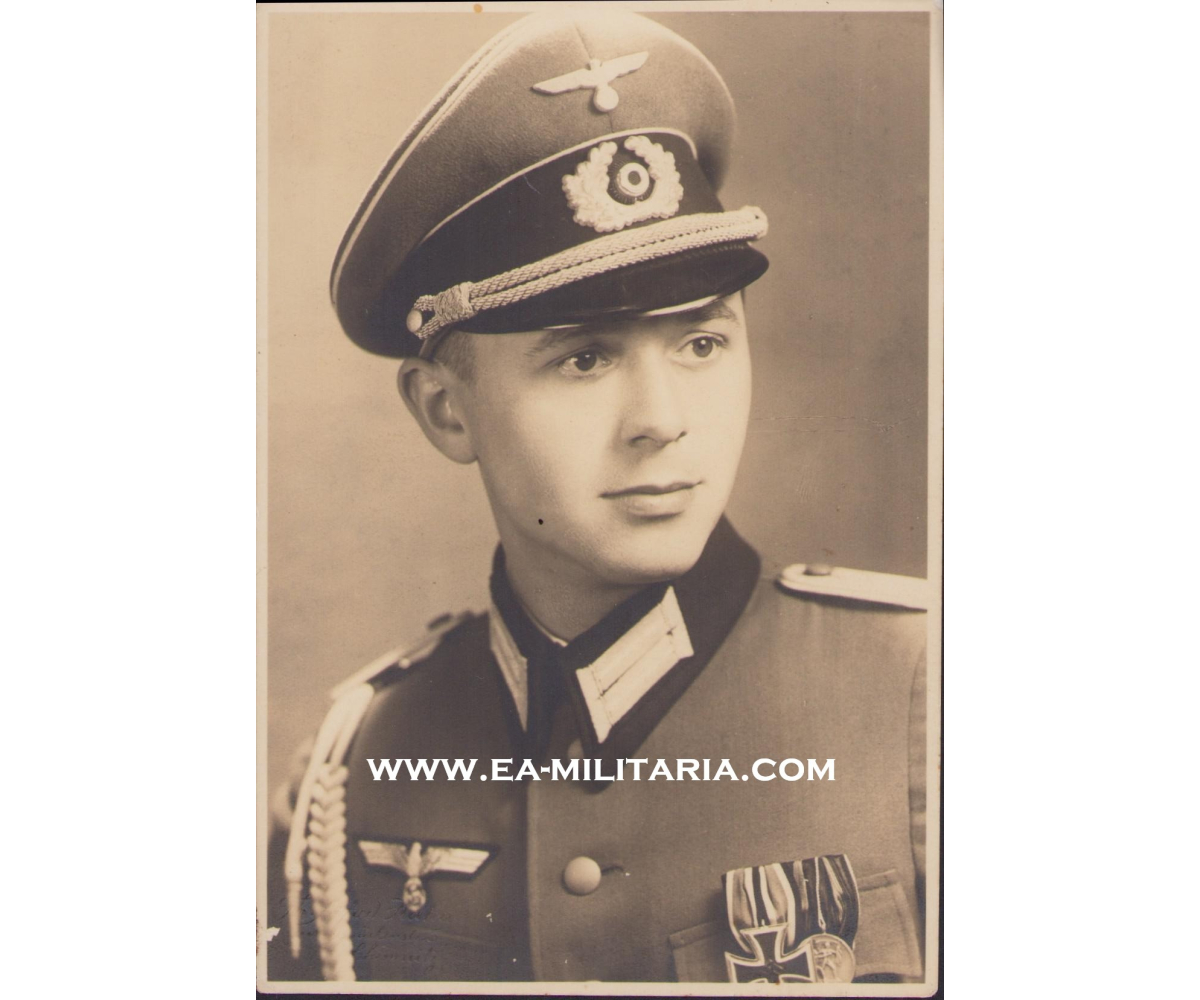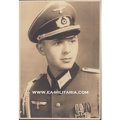 The photograph shows overall normal signs of wear. The young officer is wearing his tunic with aiguillette and schirmmutze. On his right breast pocket is a 2-piece medal bar (EKII/1.Oct.1938 Anschluss). The size of the portrait is 10cms*14cms.