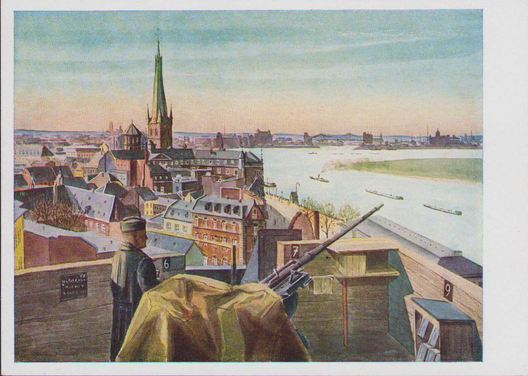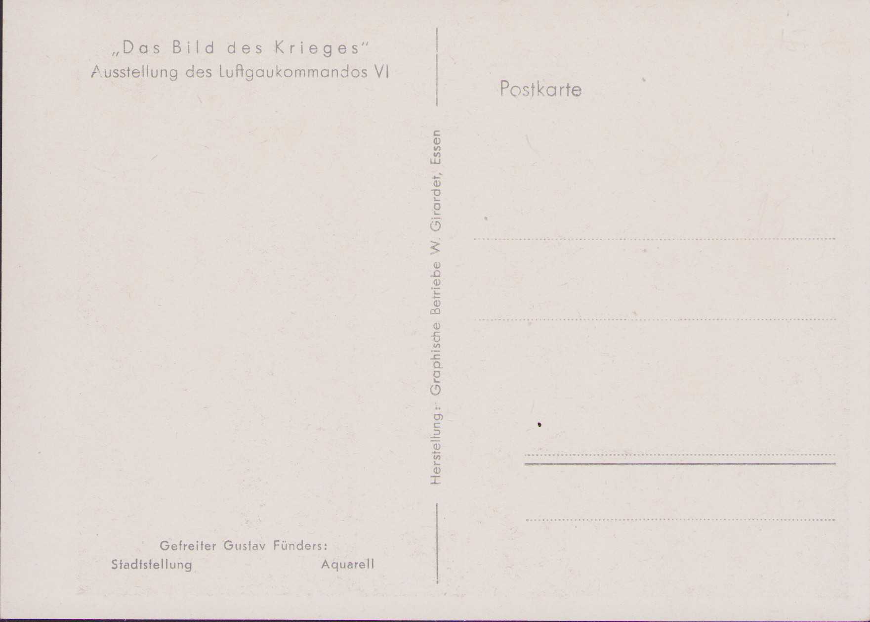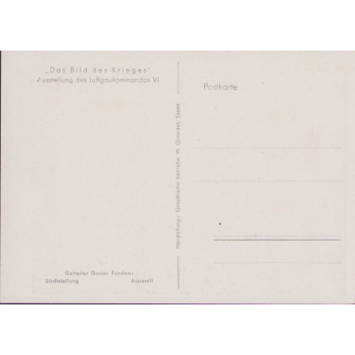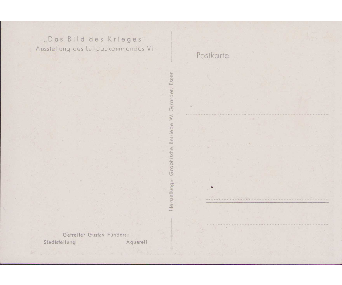The postcard shows overall normal signs of storage wear. Issued by the Luftgaukommandos VI. It's after an aquarell fromGefreiten Gustav Fünders and named 'Stadtstellung'.
