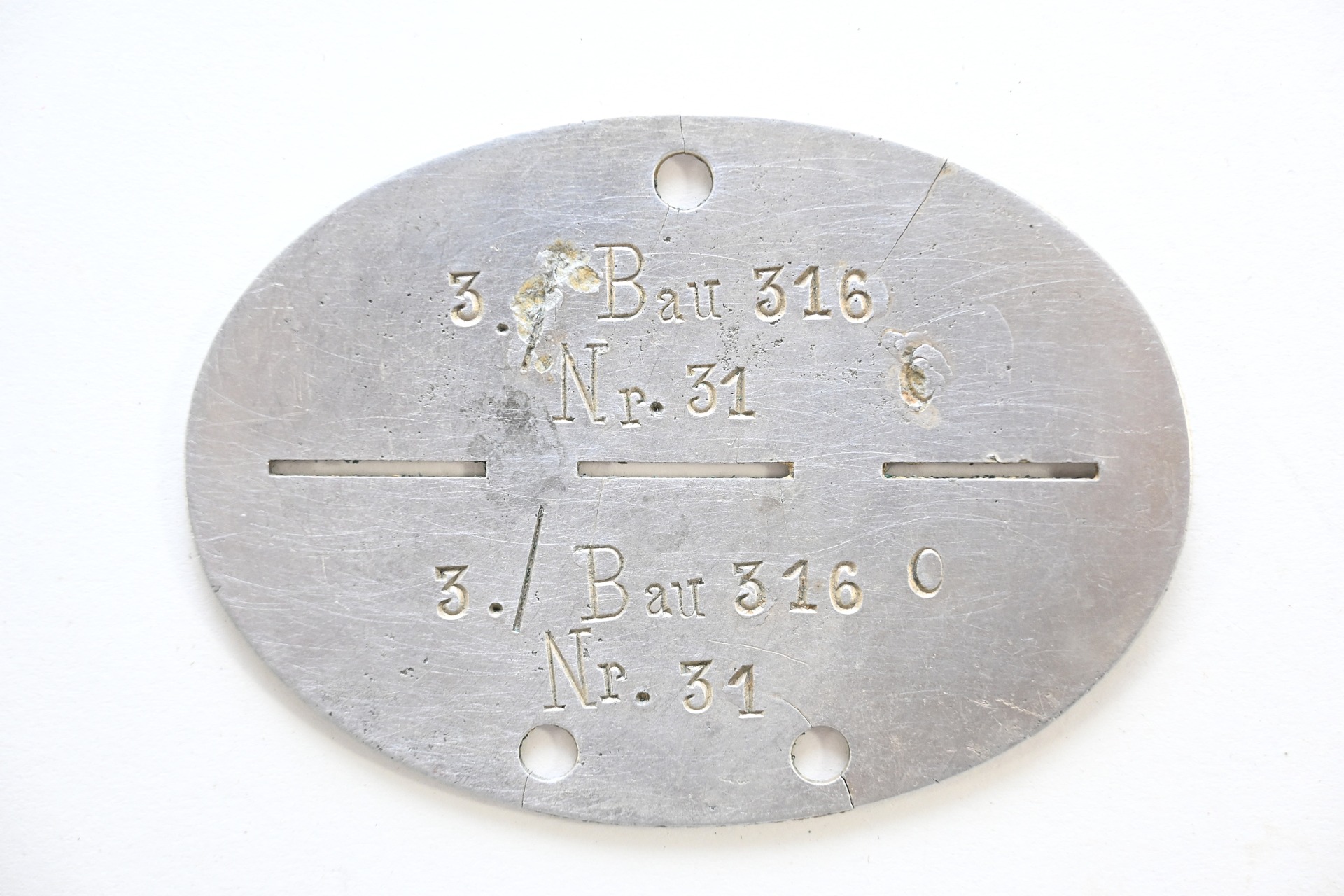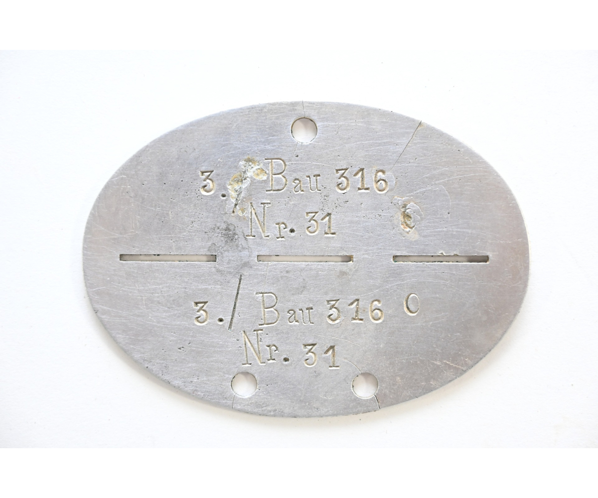 The tag shows overall signs of wear. It belonged to a soldier who served in the 3.Kompanie Bau Bataillon 316. This unit was formed in August 1939 and was put into action during the invasion of Poland in September 1939. A month later it was disbanned.
