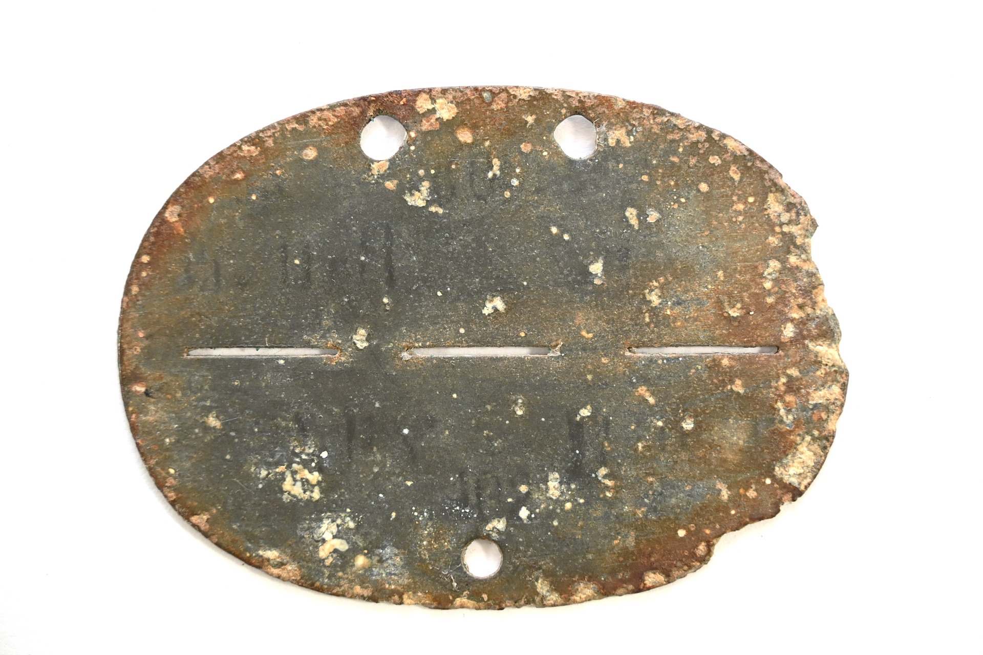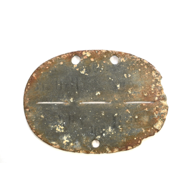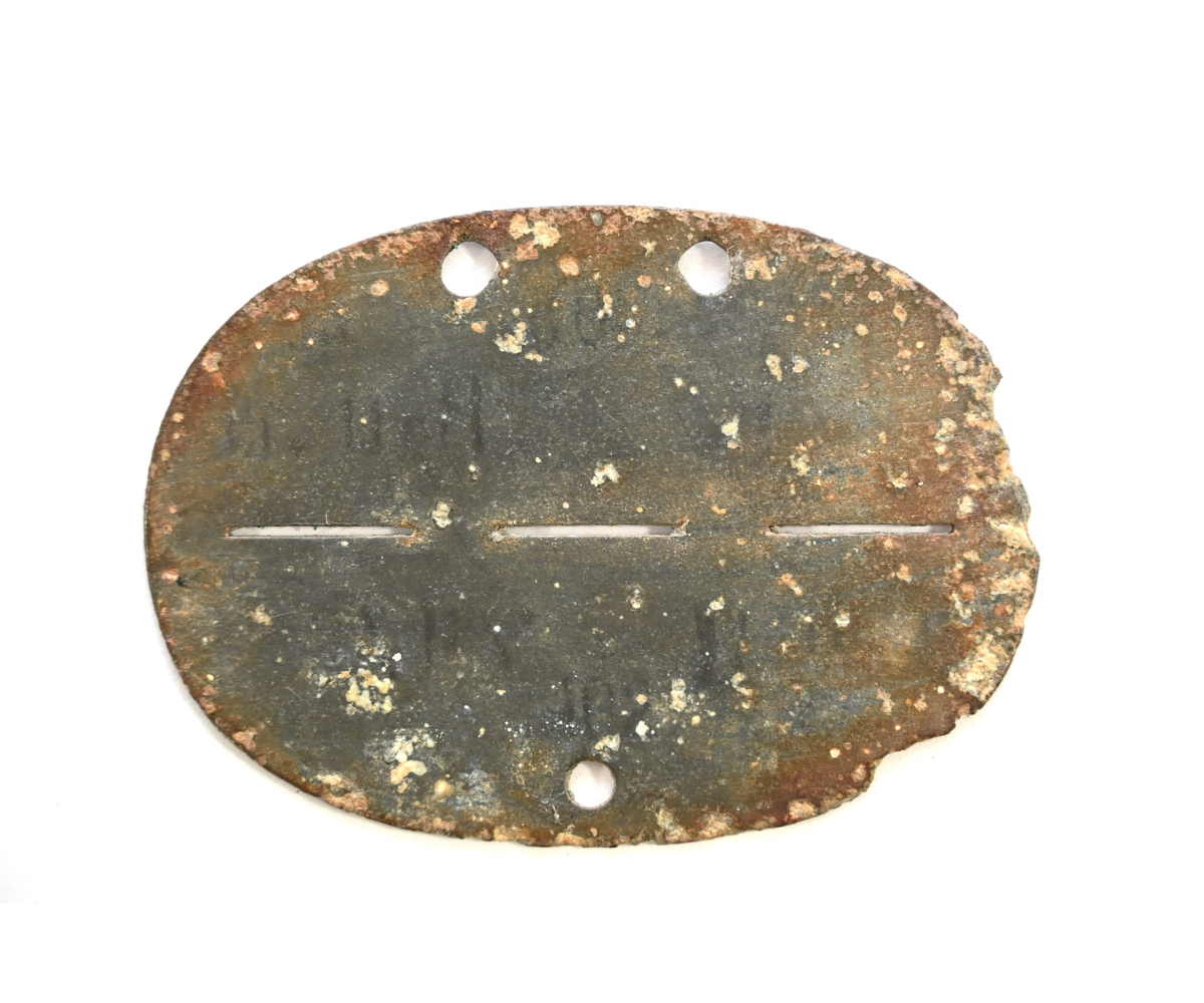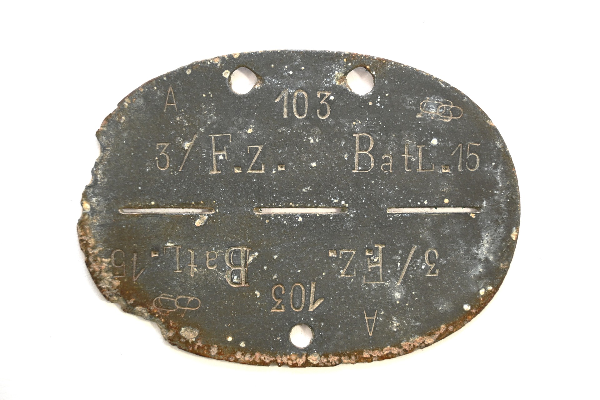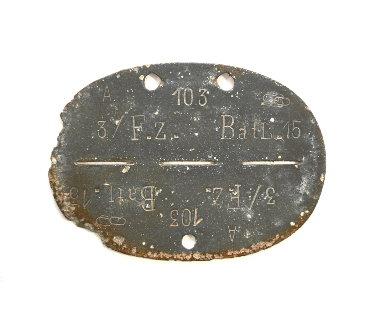 The tag or 'Erkennungsmarke' shows overall signs of wear. Mainly on the right edge, but it's still rock solid. It belonged to a soldier who served within the 3.Kompanie Feldzeug Bataillon 15. This unit was formed in 1940 in Fulda and operated for the first time in east France. In late 1944, early 1945 it operated under Heeresgruppe G on the Western front and in October it was renamed into Nachschub Bataillon 813.