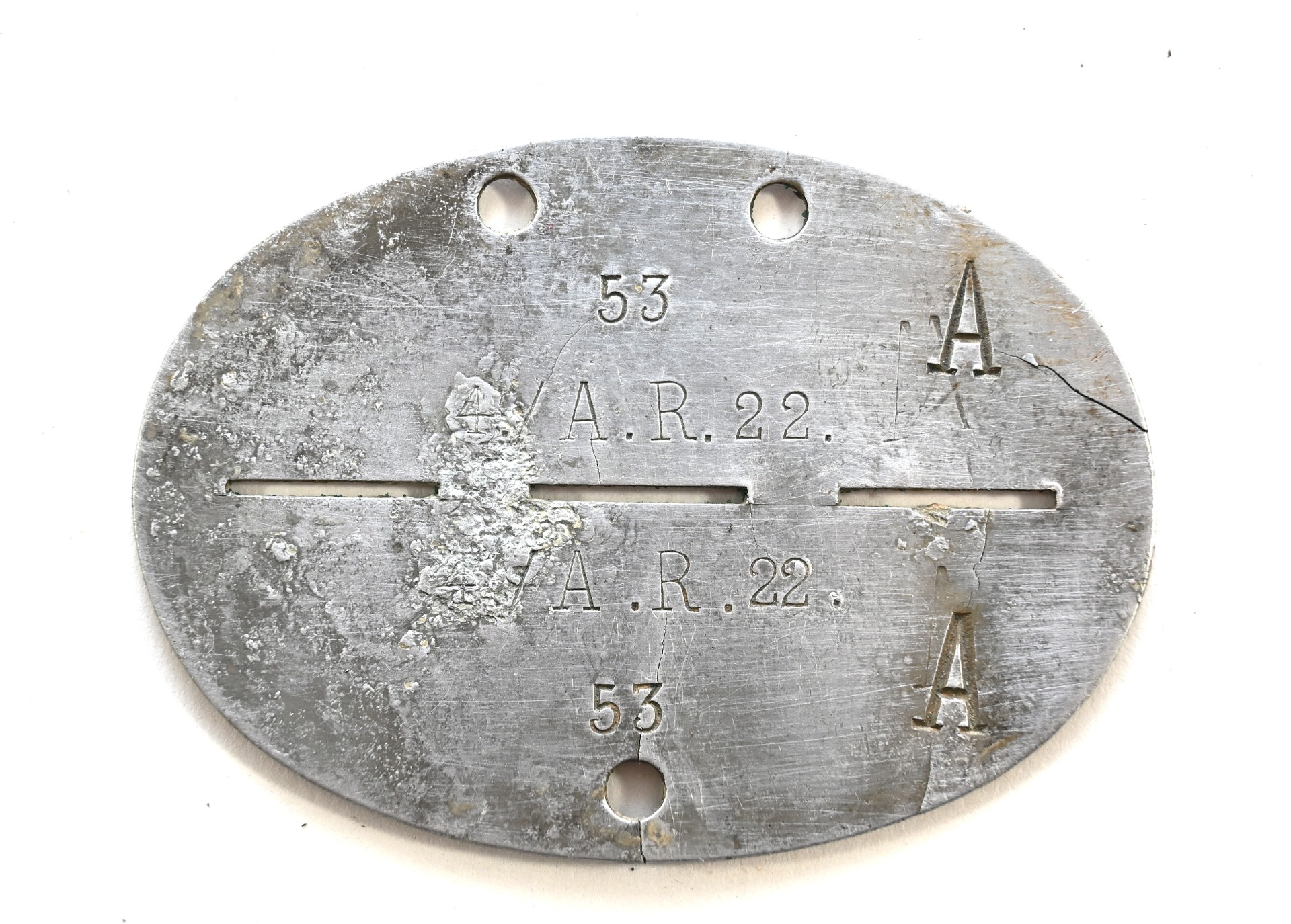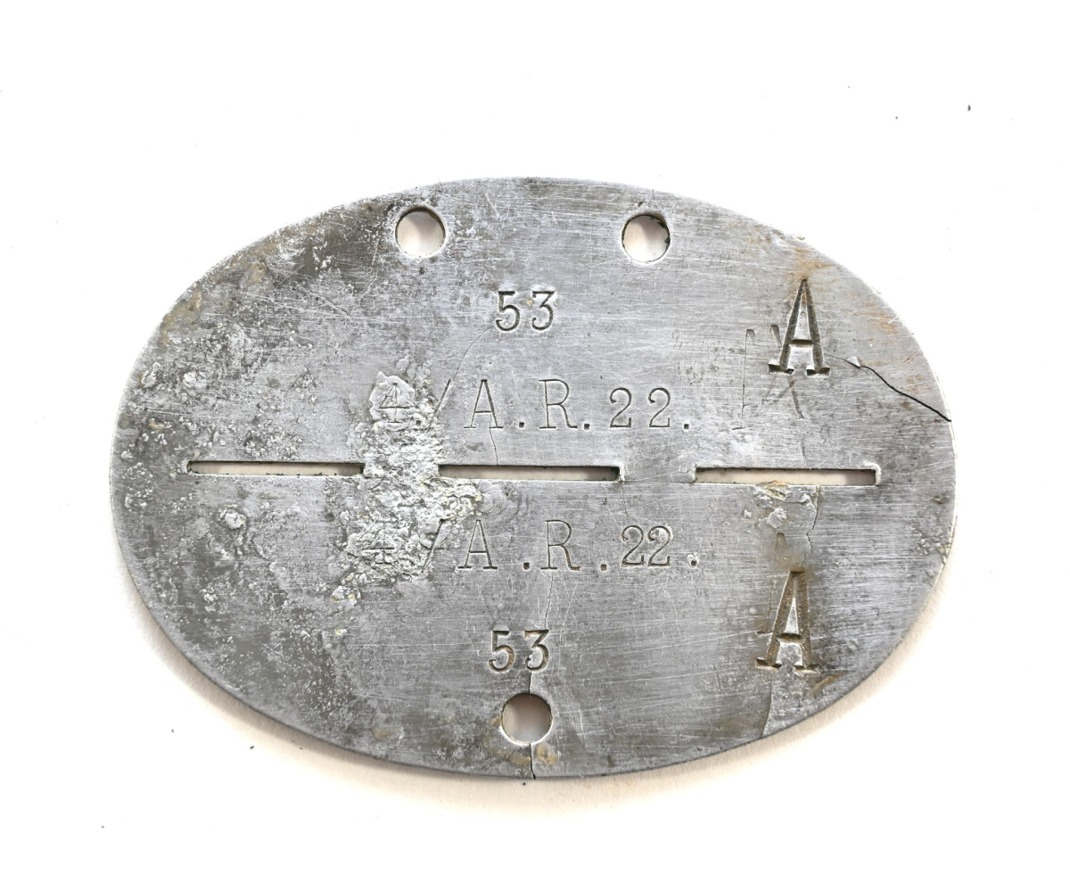 The tag or 'Erkennungsmarke' shows overall signs of wear. It belonged to a soldier who served in the 4.batterie Artillerie Regiment 22. This regiment was formed in October 1935 and part of the 22.(Luftlande).Infanterie-Divsion which saw action during the invasion of The Netherlands, Russia, Crete, Africa, Greece and Croatia.
