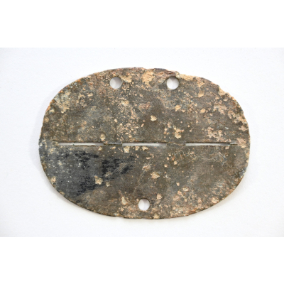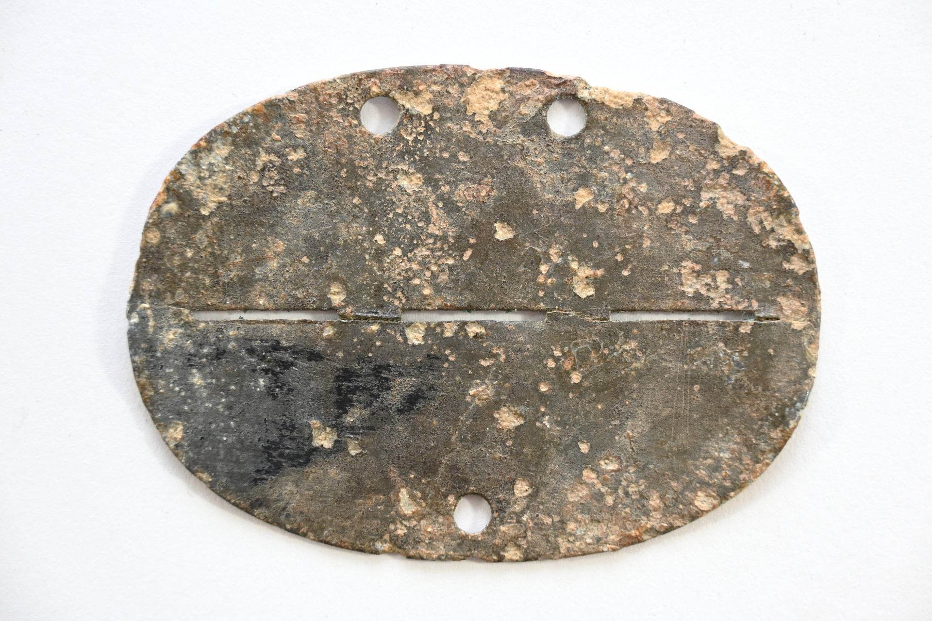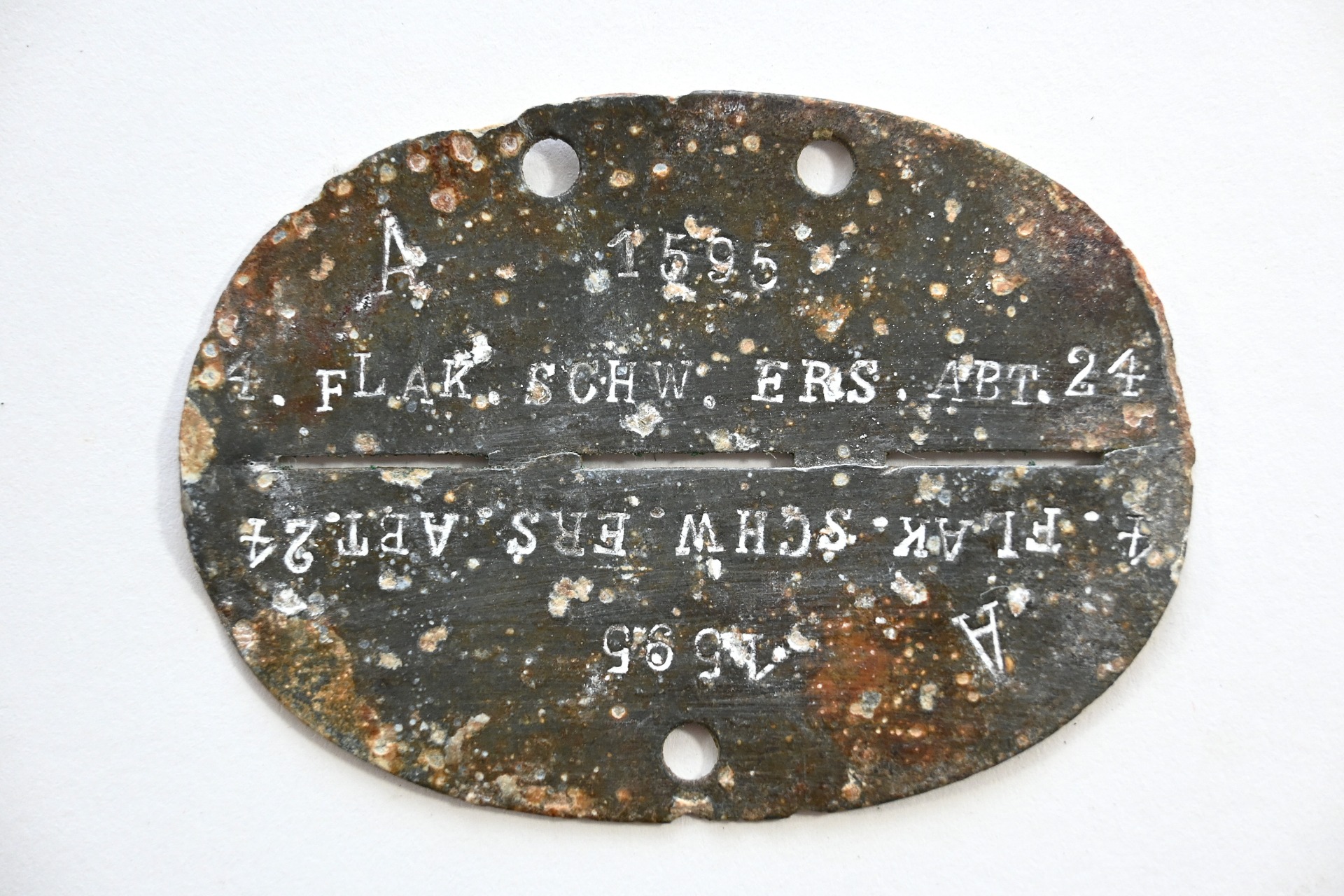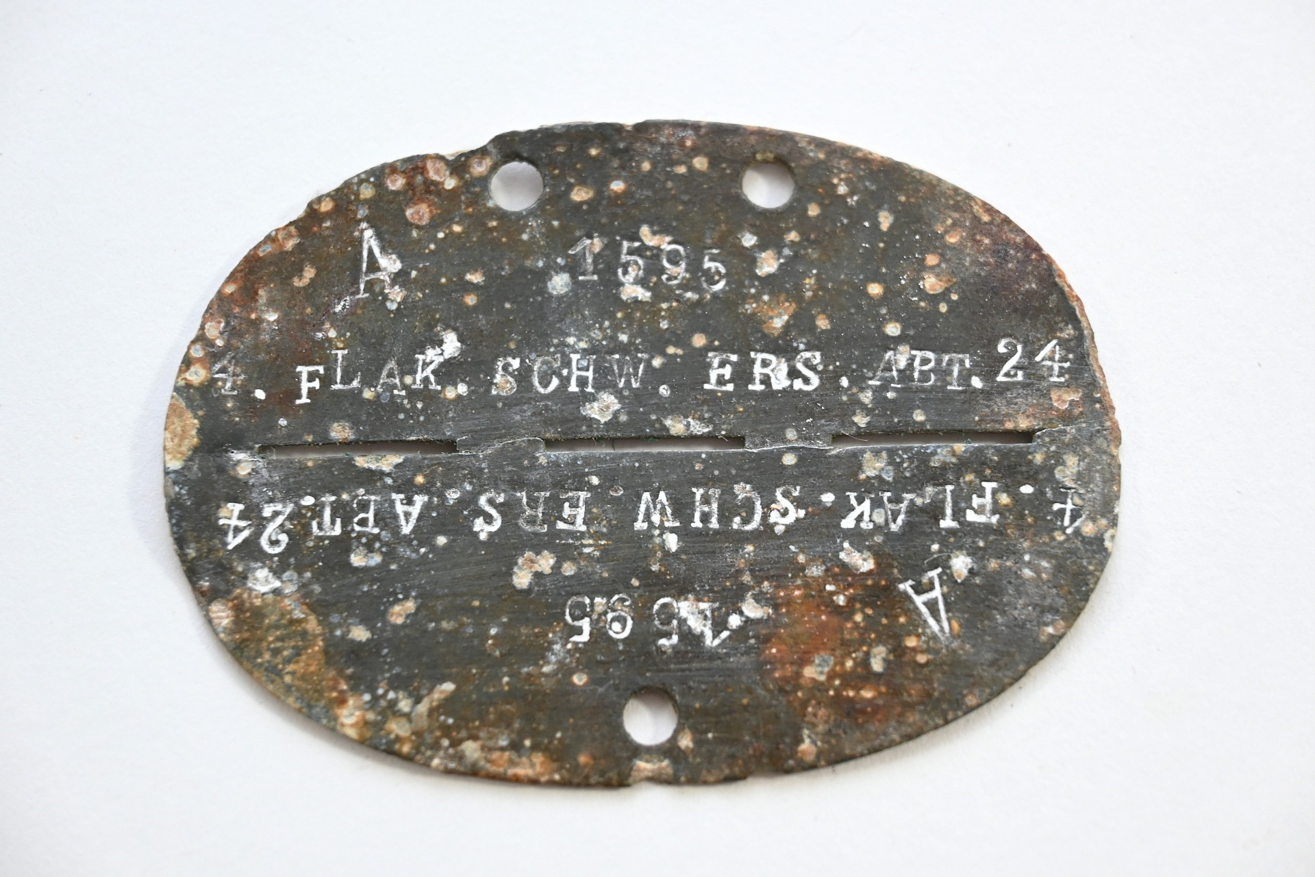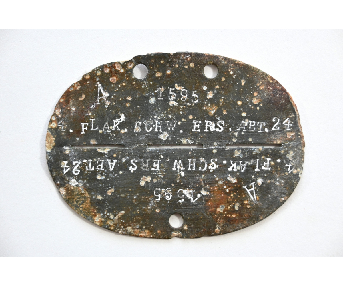 The tag or 'Erkennungsmarke' shows overall signs of wear. It belonged to a soldier who served/was drafted in the 4.batterie Flak Ersatz Abteilung 24. This abteilung was formed in August 1939 in Iserlohn as Flak Ersatz Abteilung 24. In the winter of 1941/42 it was converted to Flak Scheinwerfer Ersatz Abeitlung 24. It operated in the area of Rensburg.