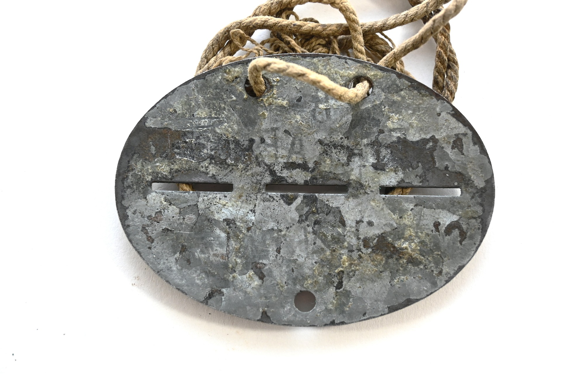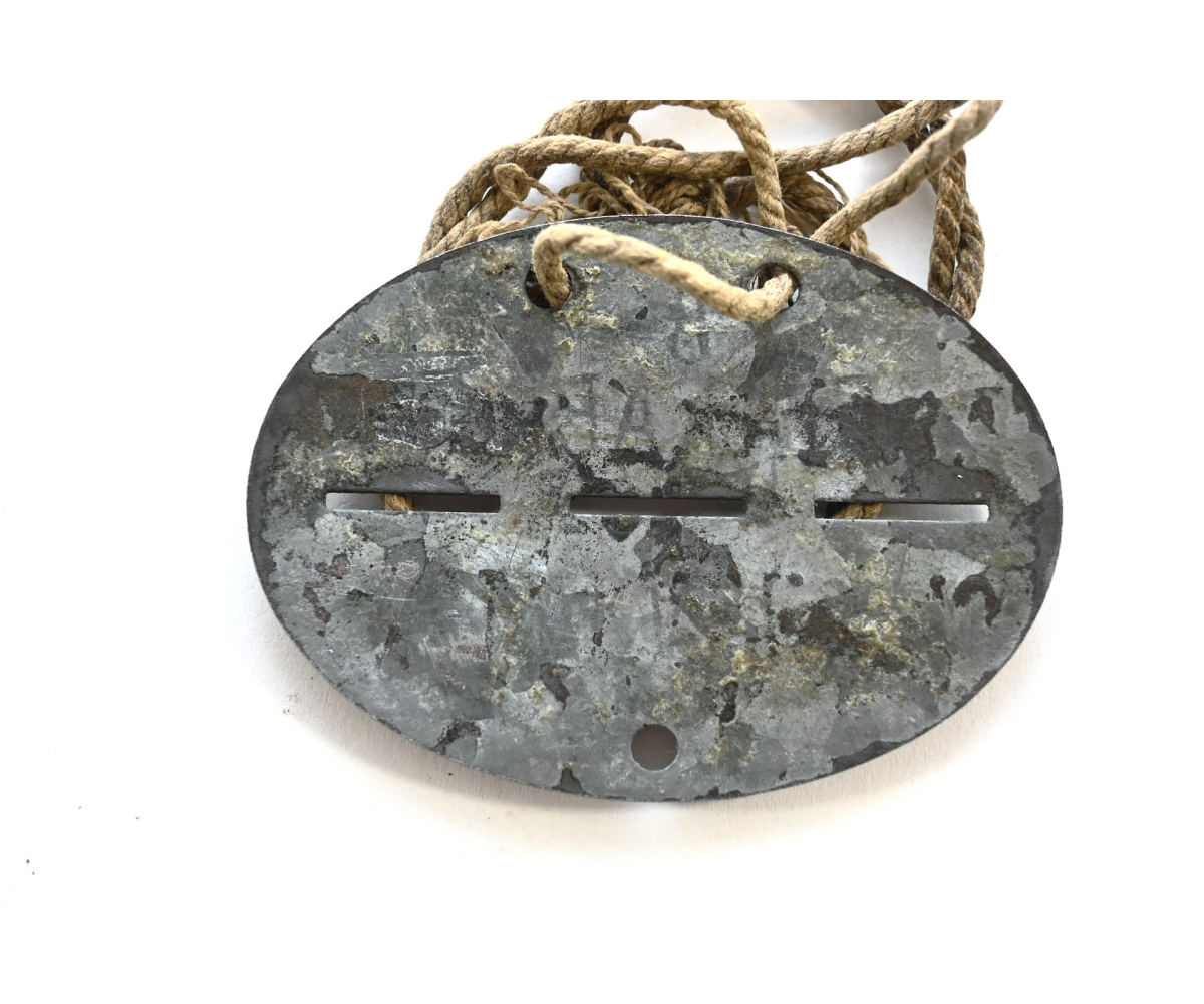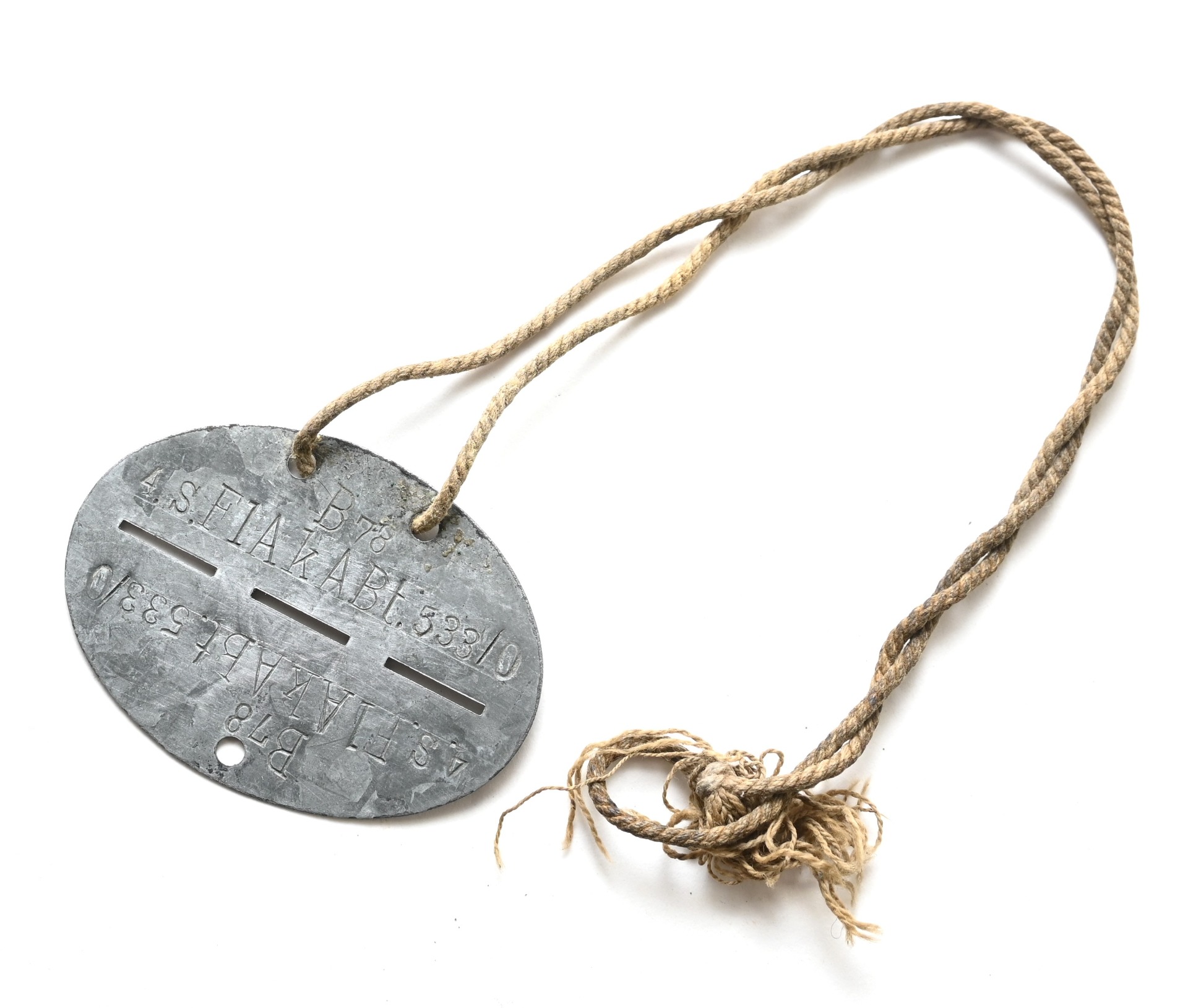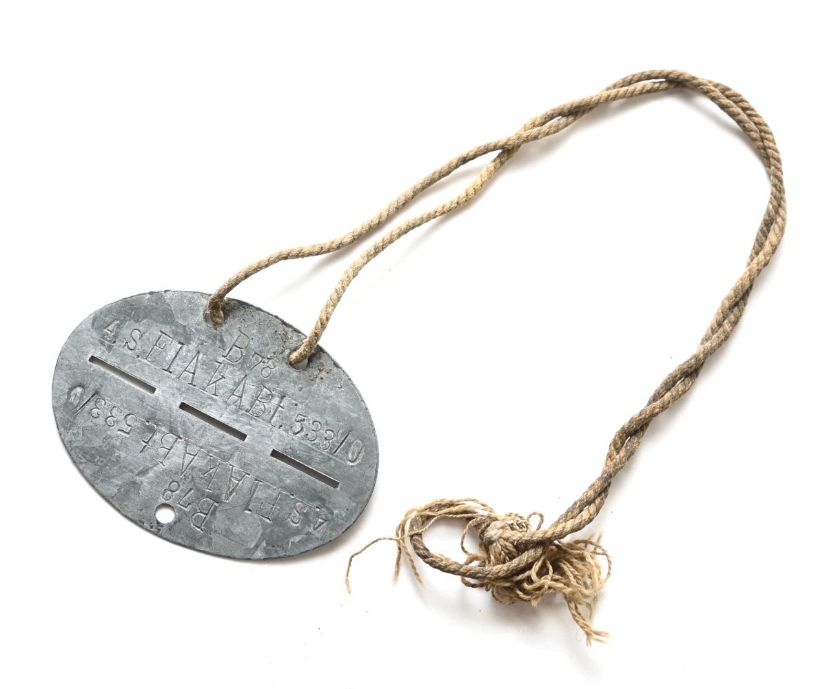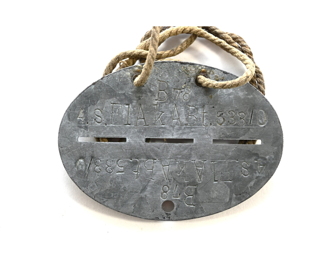 The tag or 'Erkennungsmarke' shows overall signs of wear. It belonged to a soldier who served within the 4.batterie schwere Flak Abteilung 533 (Ortsfest). This abteilung was formed in Mai 1942 with 5 batteries and operated in Vienna, Austria. It was part of Flakuntergruppe Mödling.