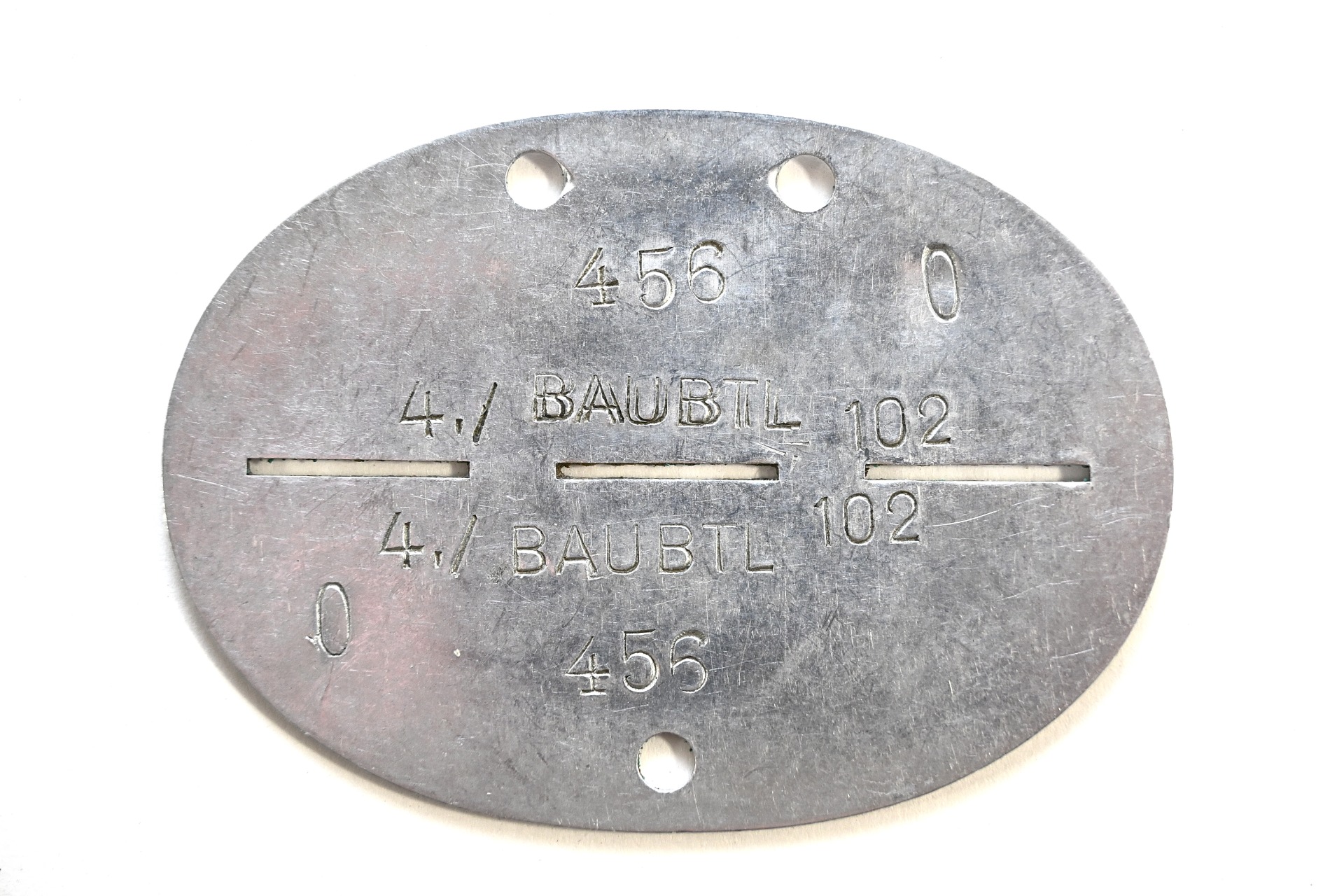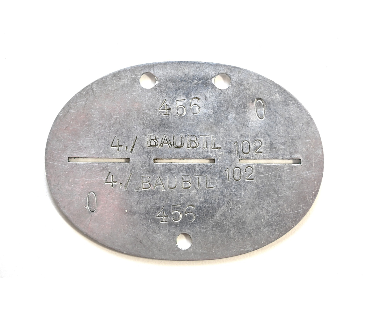The tag or 'Erkennungsmarke' shows overall normal signs of wear. It belonged to a soldier who served within the 4.Kompanie Bau Bataillon 102. This unit was formed in late August 1939. It was put in action during the invasion of Poland as part of the 8.Armee. In May 1940 it operated in France. After the defeat of the Low Countries it stayed in France and Belgium.
