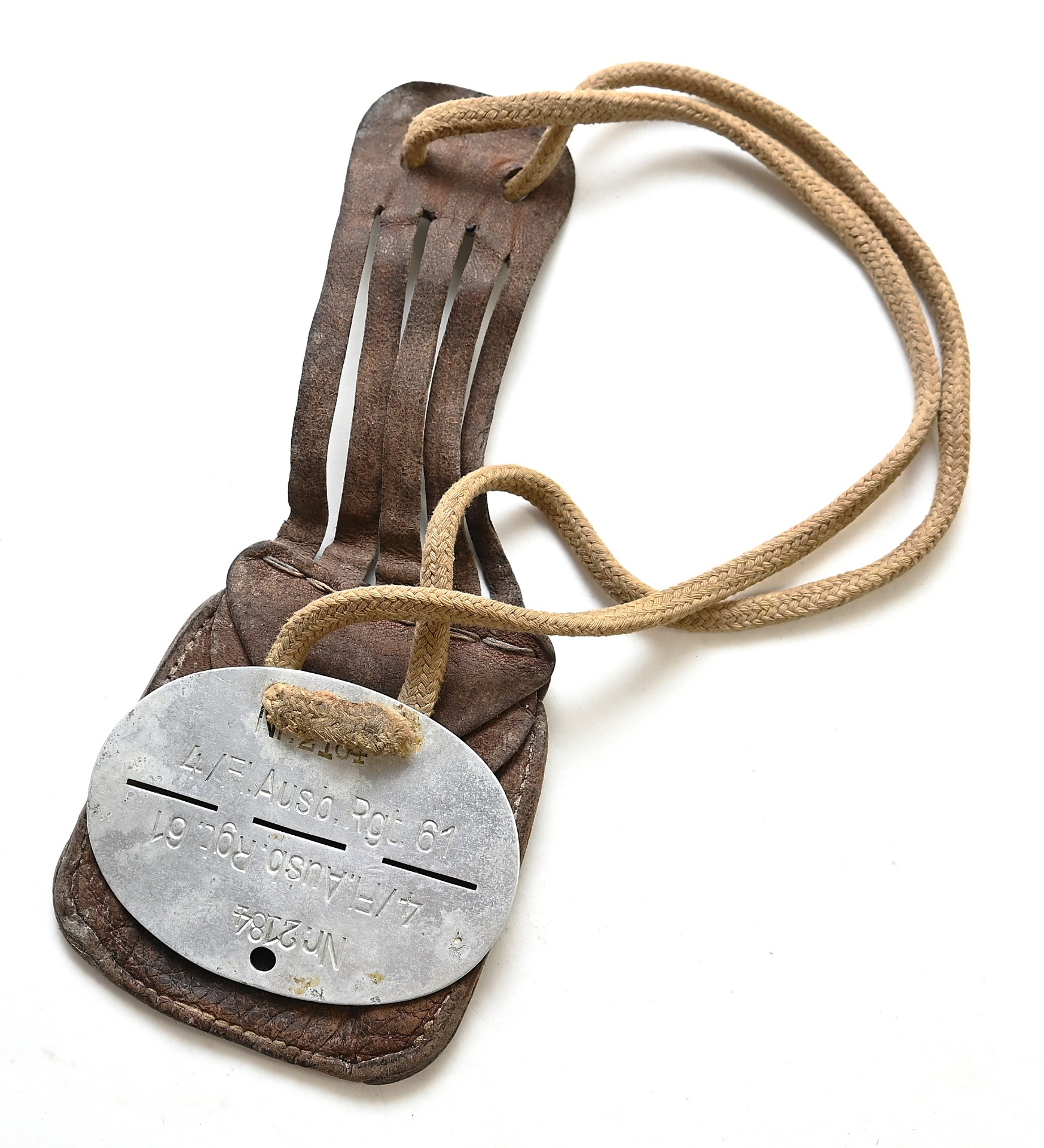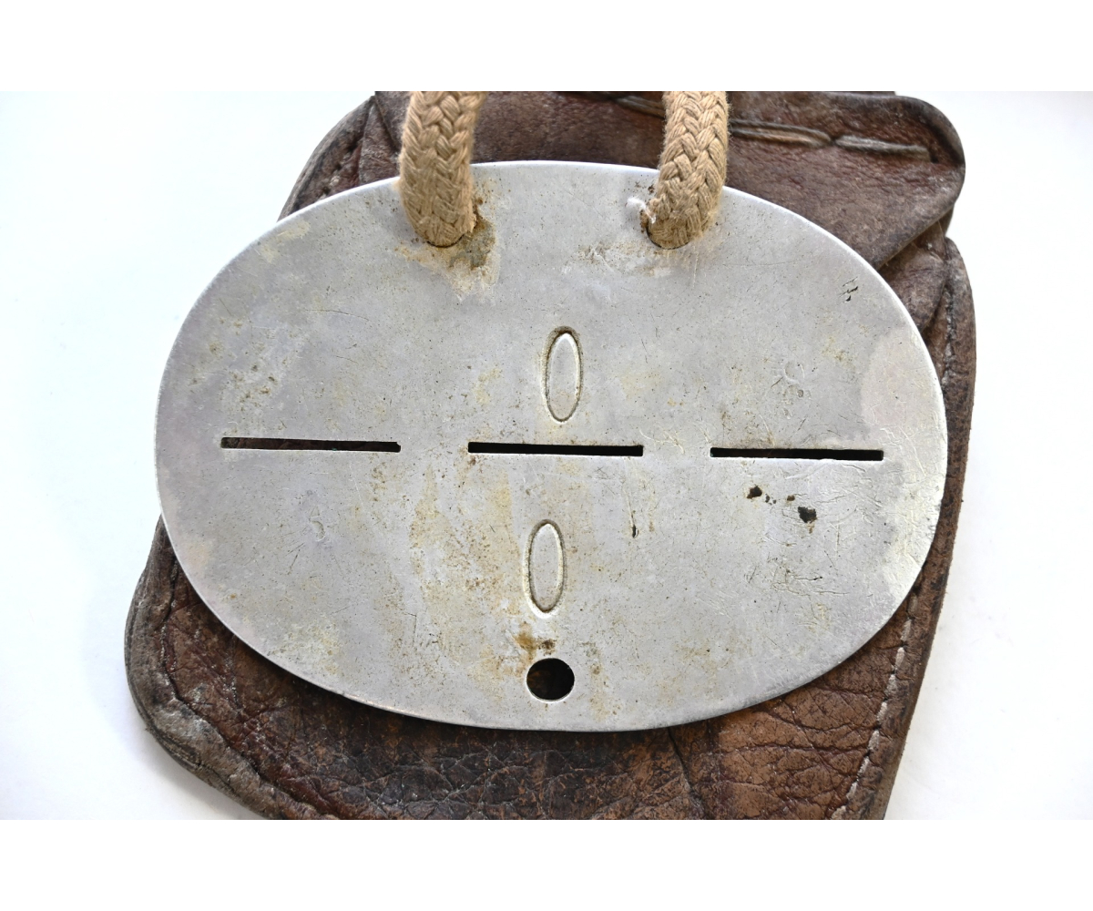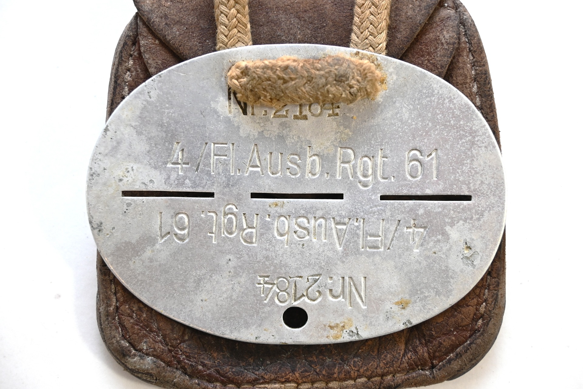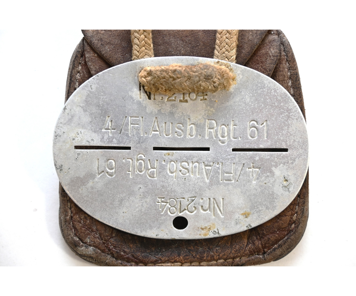 The regiment became Flieger Regiment 61 in August 1942 and it was renamed Luftwaffe Jäger Regiment 26 in November 1942. It served under the 13.Luftwaffe Feld-Division and fought in Russia in areas like Wolchow, Ladoga and Pleskau. The division and her units where disbanned in April 1944 and the remnants where absorbed by the 12.Luftwaffe Feld-Division which fought in Riga, Kurland and Danzig. The tag comes with its original leather pouch which is named 'Meyer'.