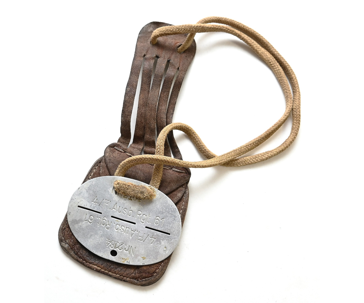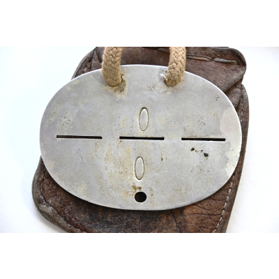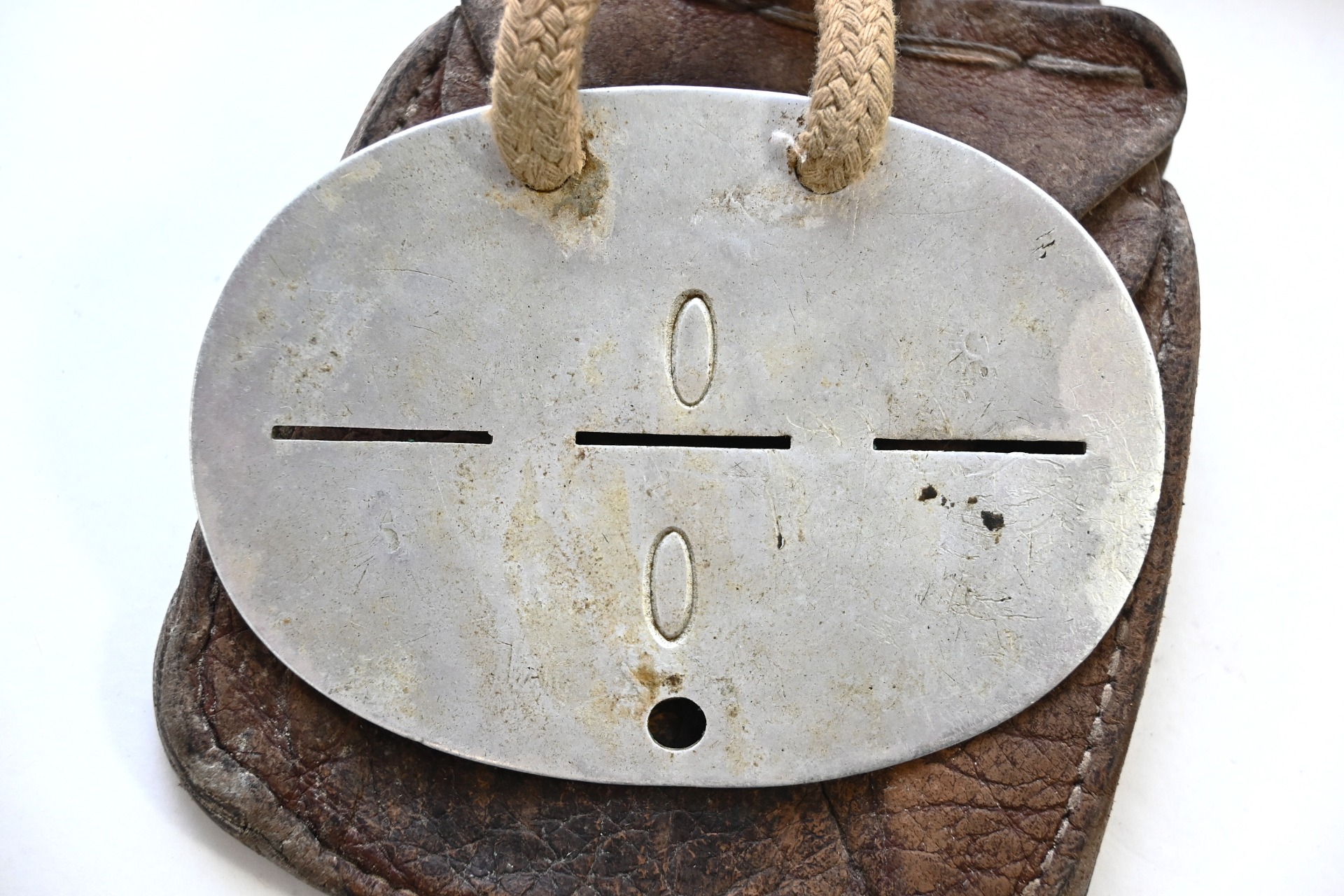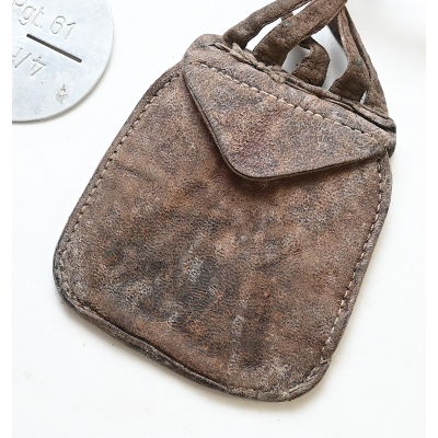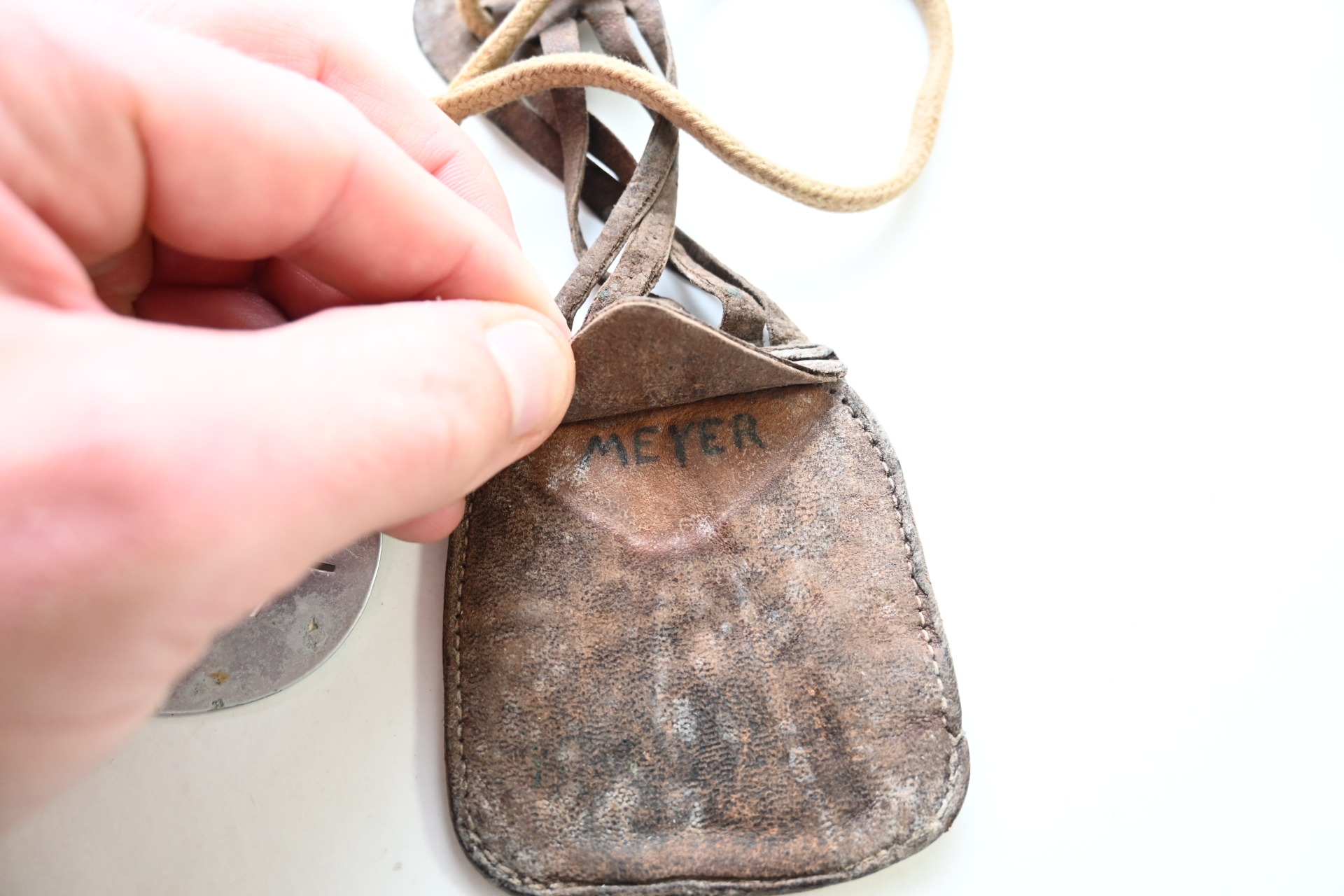 The regiment became Flieger Regiment 61 in August 1942 and it was renamed Luftwaffe Jäger Regiment 26 in November 1942. It served under the 13.Luftwaffe Feld-Division and fought in Russia in areas like Wolchow, Ladoga and Pleskau. The division and her units where disbanned in April 1944 and the remnants where absorbed by the 12.Luftwaffe Feld-Division which fought in Riga, Kurland and Danzig. The tag comes with its original leather pouch which is named 'Meyer'.