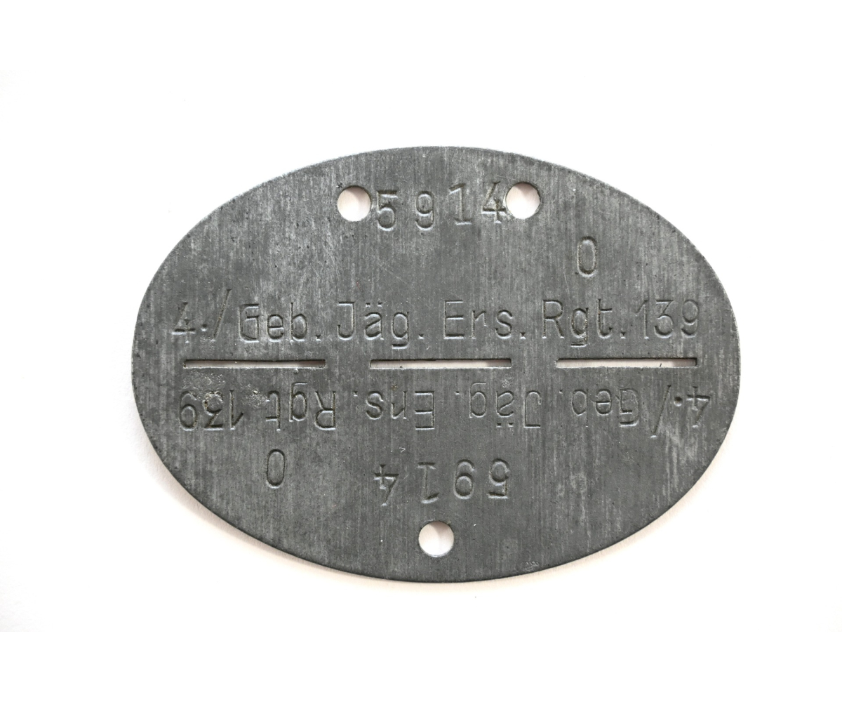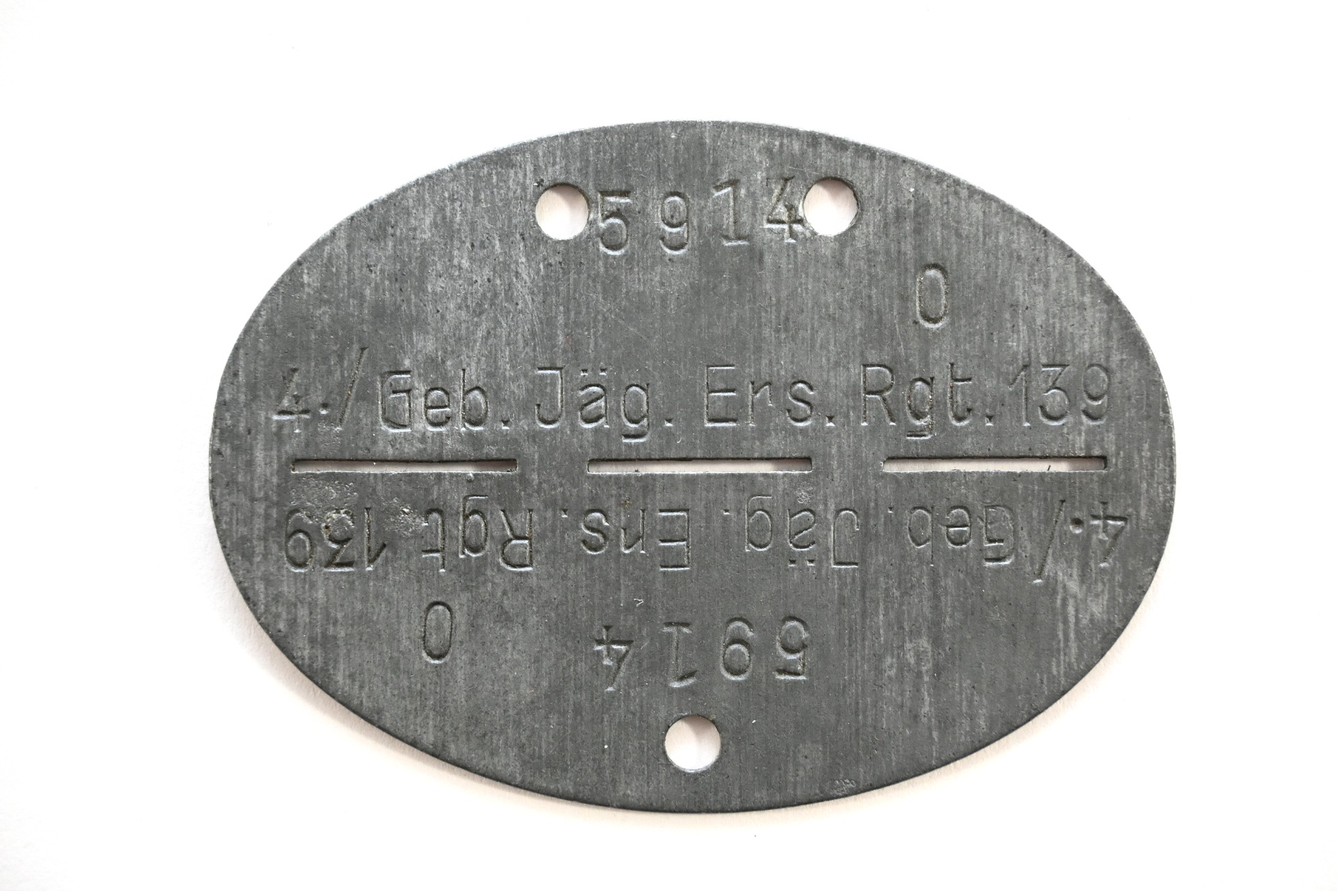 The tag or 'Erkennungsmarke' shows overall normal signs of wear. It belonged to a soldier who was drafted in the 3.Kompanie Gebirgsjäger Ersatz Regiment 139. This regiment was formed in February 1940 in Klagenfurt. The Gebirgsjäger-Ersatz-Bataillone I.und II. 139 were part of this regiment.
