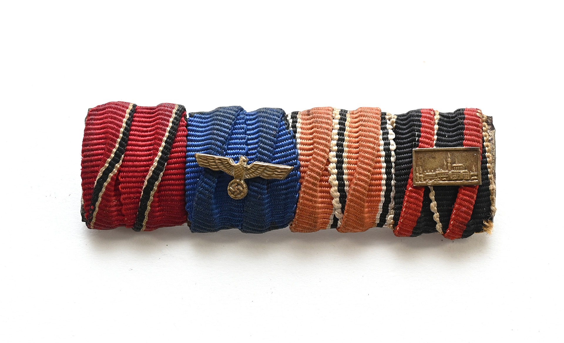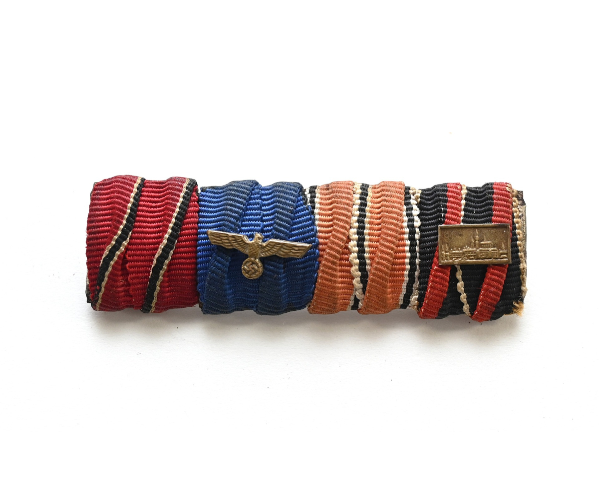 The ribbon bar is in used but good condition. It consist out of the ribbons for the Ostmedaille, Wehrmacht Dienstauszeichnung, 1.Marz 1938 Anschluss and the 1.Oktober 1938 Anschluss mit Prager burg Spange.
