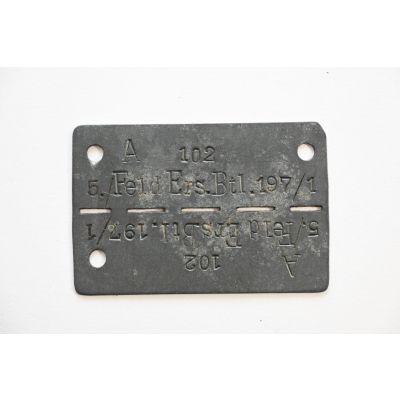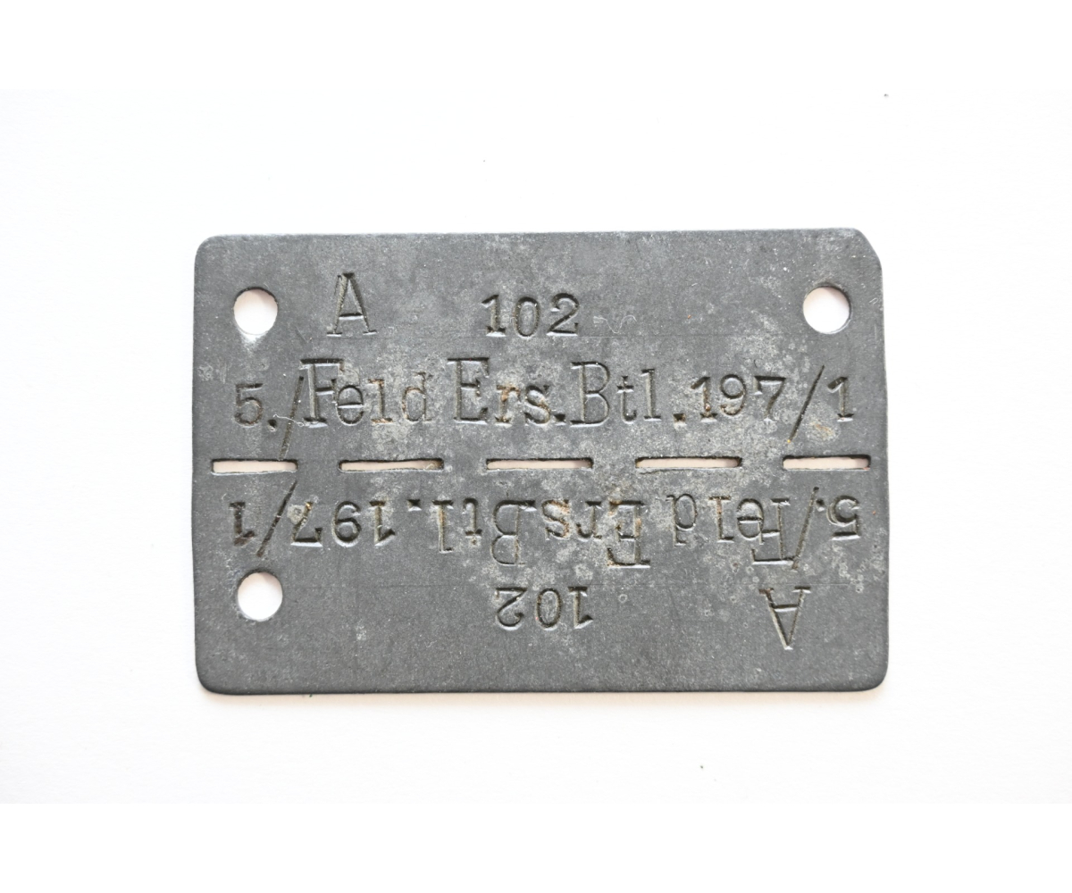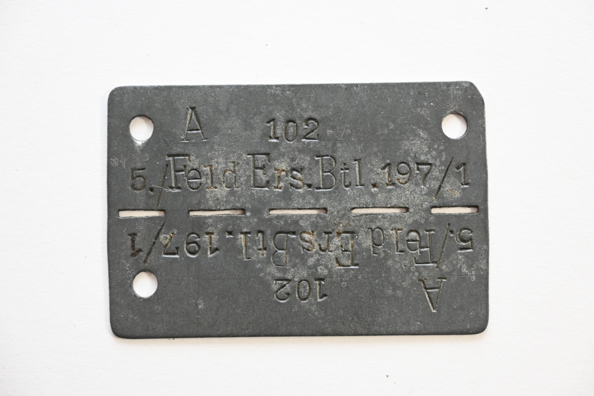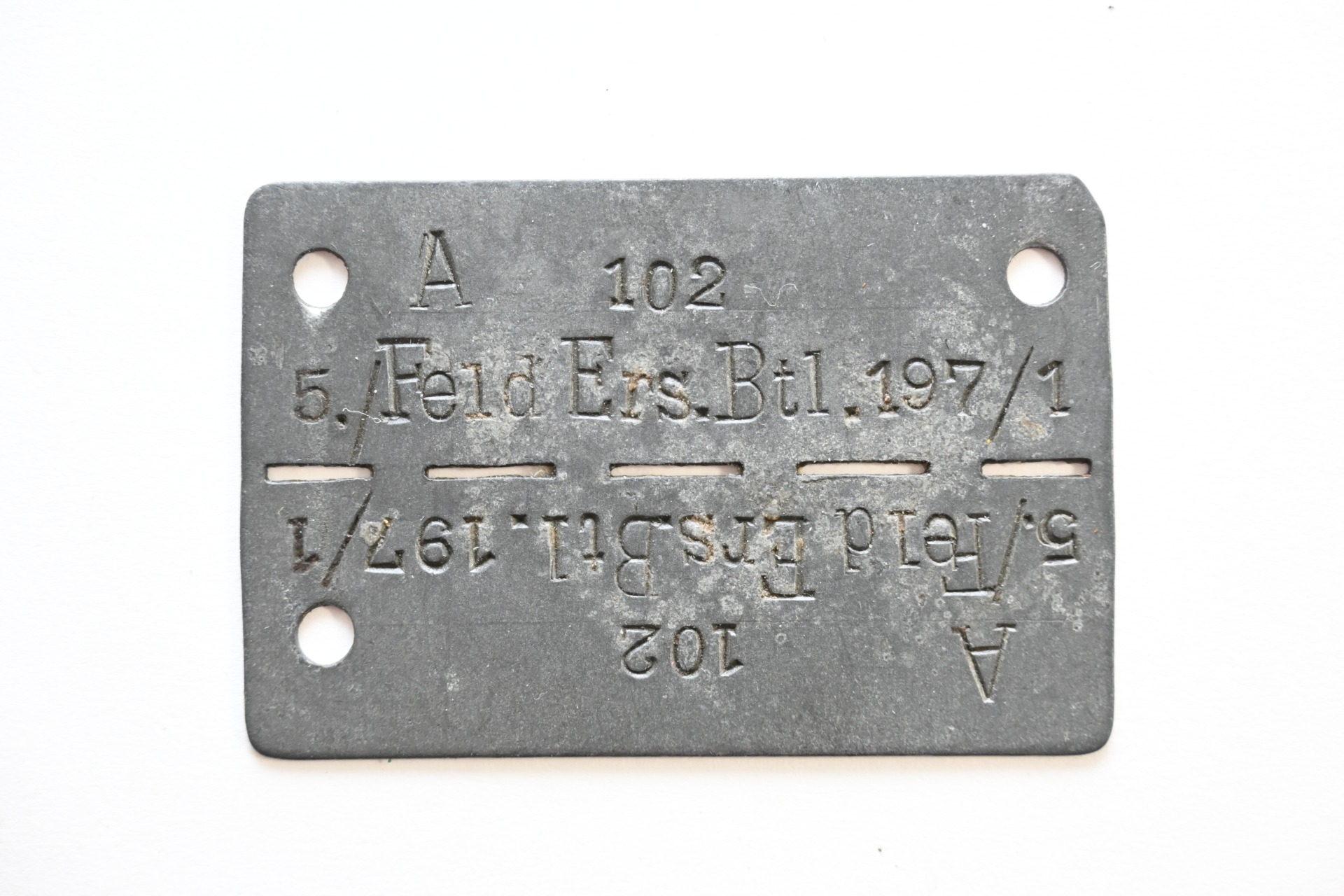 The tag or 'Erkennungsmarke' shows overall normal signs of wear. They used a Stalag style tag in this case. It belonged to a soldier who was drafted in the 5.Kompanie Feld Ersatz Bataillon 197/1. This unit was formed in on the Russian front in early 1942 as part of the Divisionseintheiten der 197.Infanterie-Division.
