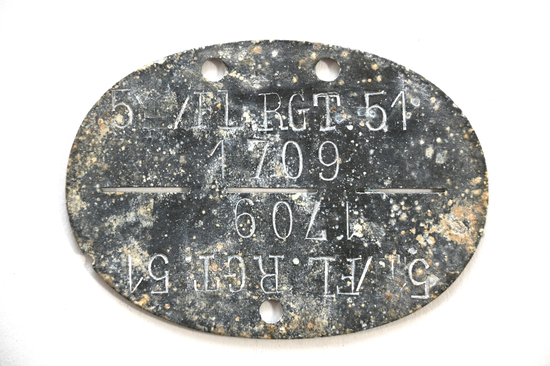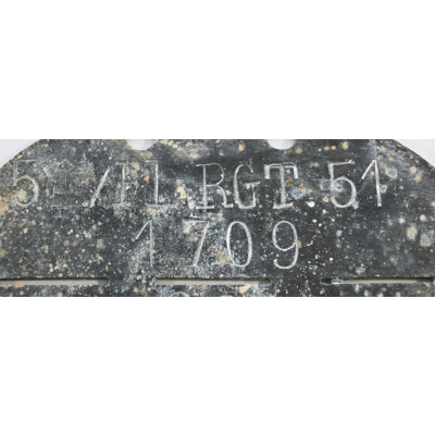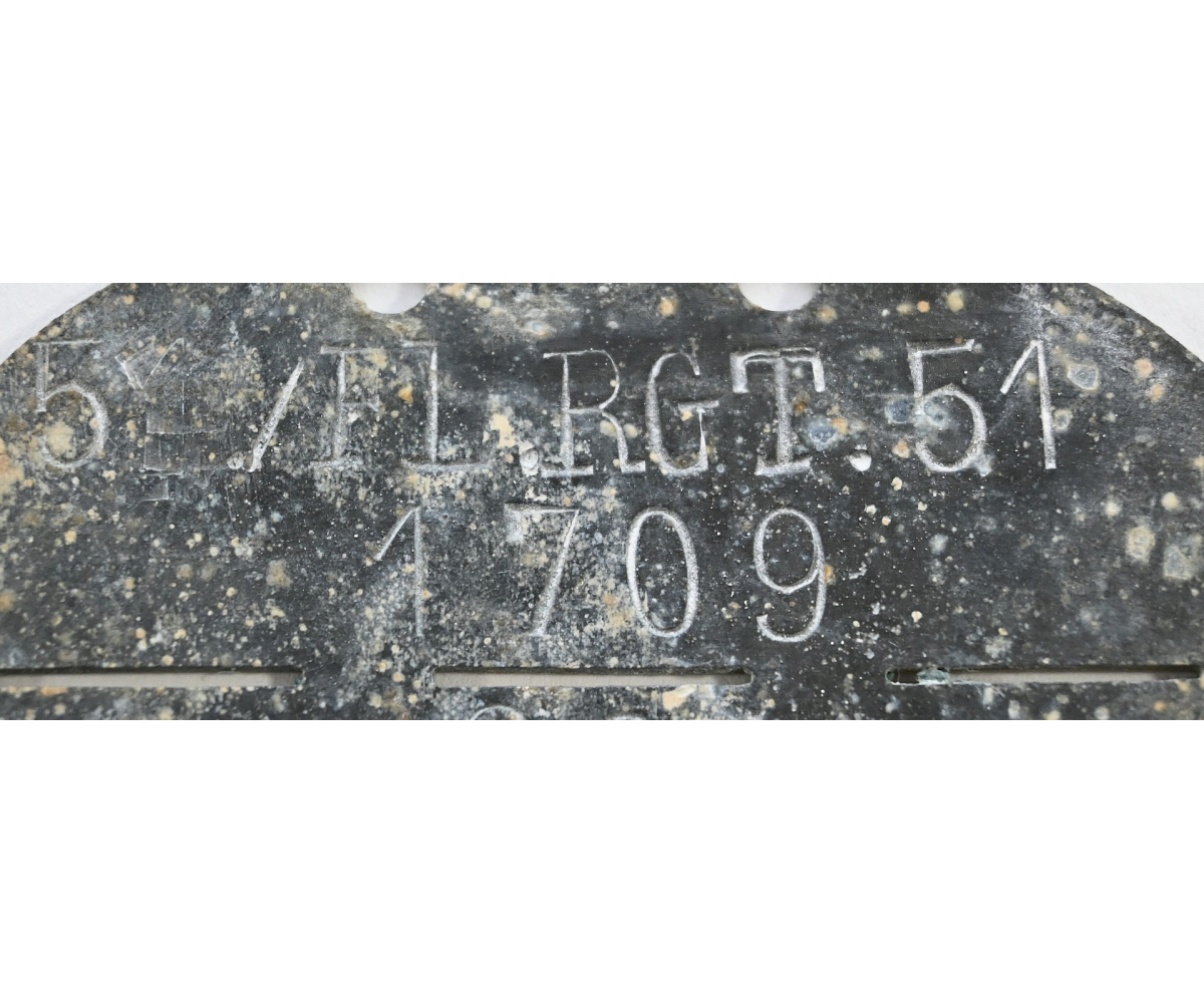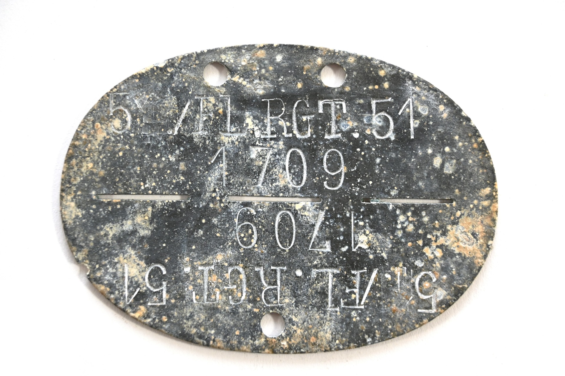 The tag or 'Erkennungsmarke' shows overall signs of wear. It belonged to a soldier who served in 5.Kompanie Flieger Regiment 51. This regiment was formed in November 1938 in Weimar as Flieger Ersatz Abteilung 51. In Januari 1940 the abteilung moved to Heiligenberg and in April 1941 it moved to Antwerp, Belgium. It was renamed in August 1942 to Flieger Regiment 51. Again renamed in June 1944 in Luftgau-Feld-Regiment Belgien-Nordfrankreich (mot. ) 51.