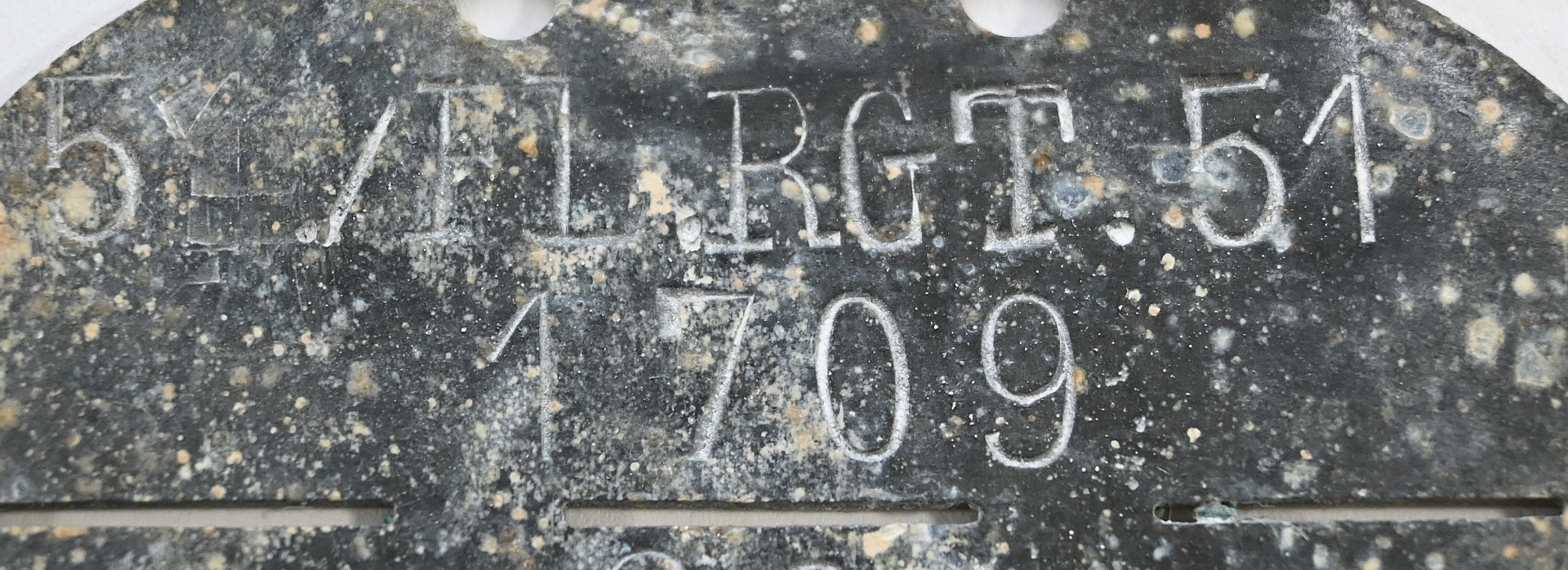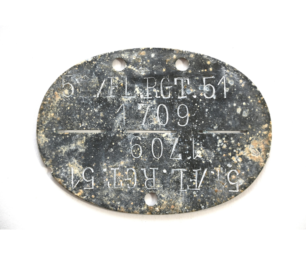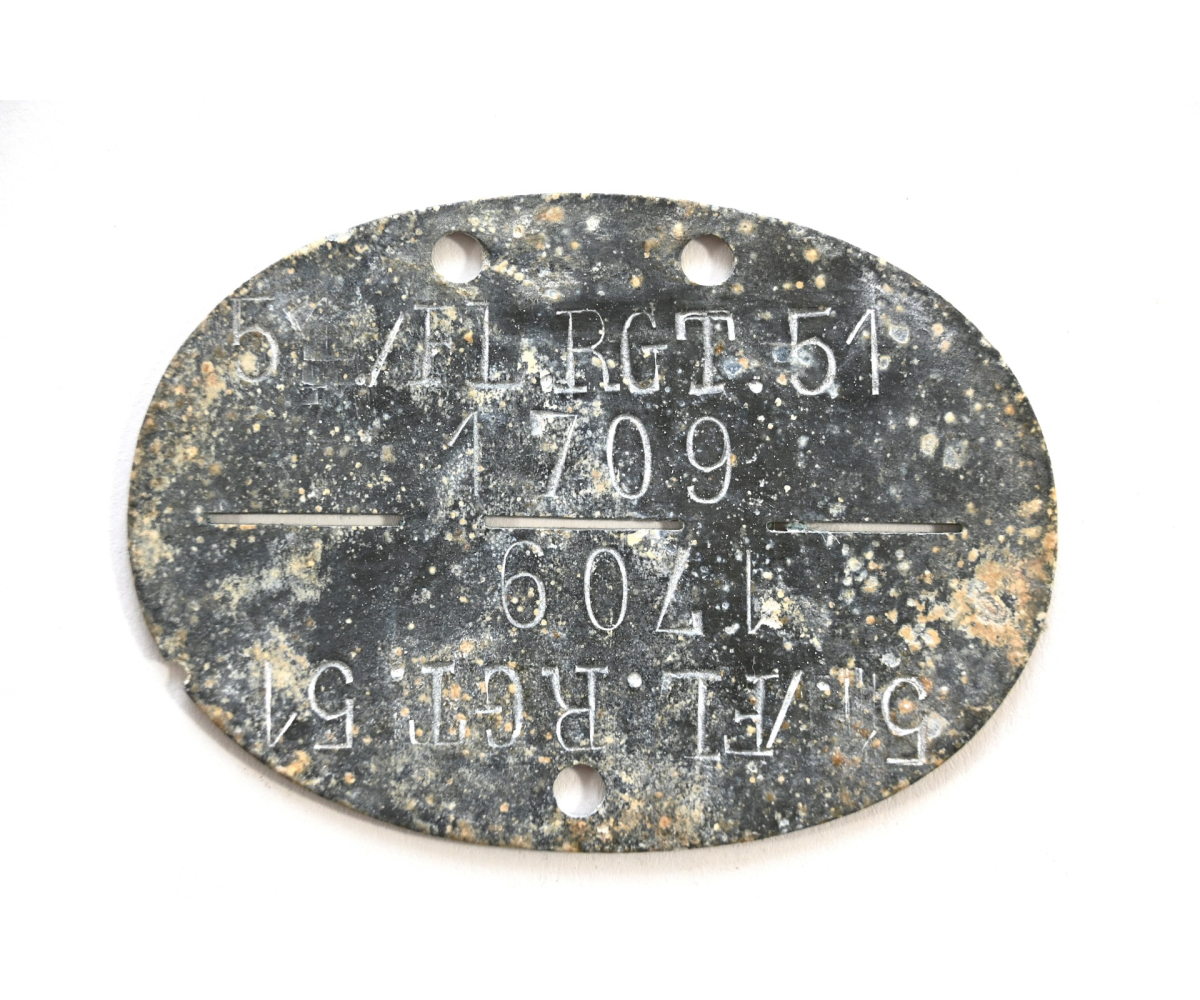 The tag or 'Erkennungsmarke' shows overall signs of wear. It belonged to a soldier who served in 5.Kompanie Flieger Regiment 51. This regiment was formed in November 1938 in Weimar as Flieger Ersatz Abteilung 51. In Januari 1940 the abteilung moved to Heiligenberg and in April 1941 it moved to Antwerp, Belgium. It was renamed in August 1942 to Flieger Regiment 51. Again renamed in June 1944 in Luftgau-Feld-Regiment Belgien-Nordfrankreich (mot. ) 51.