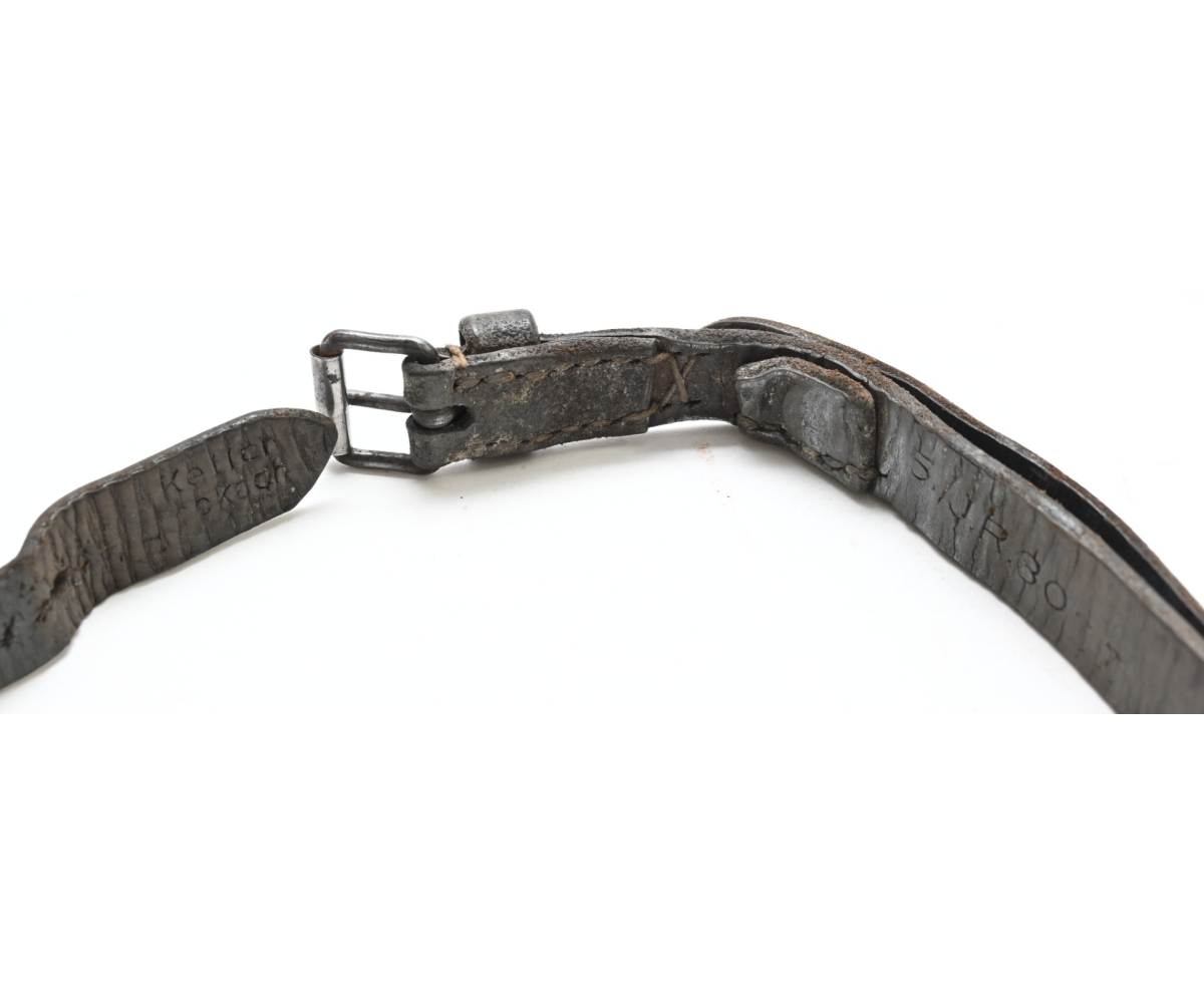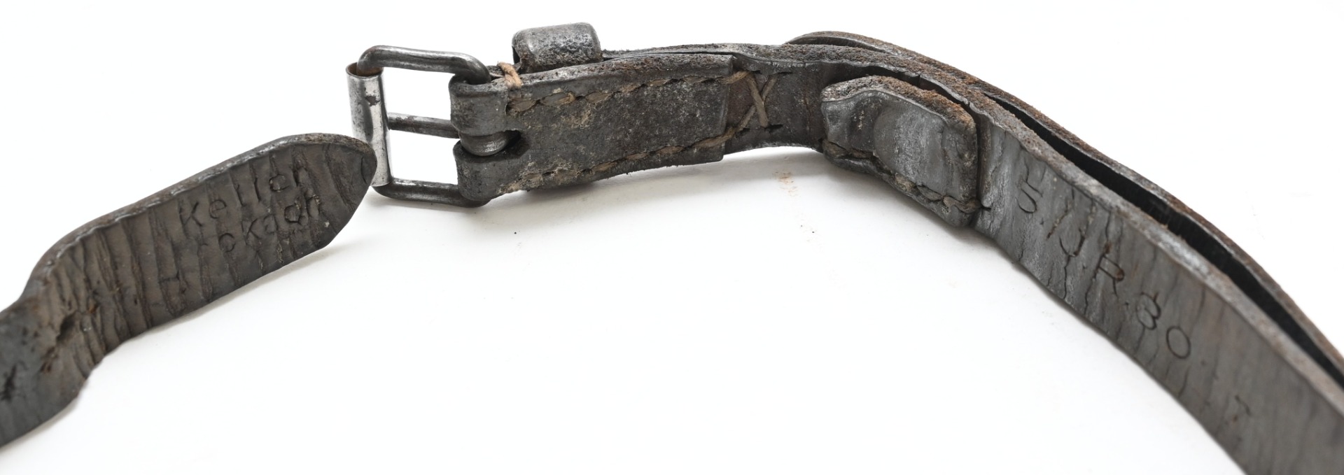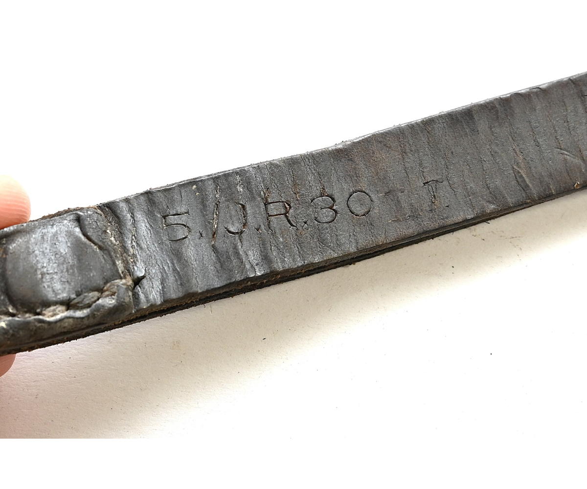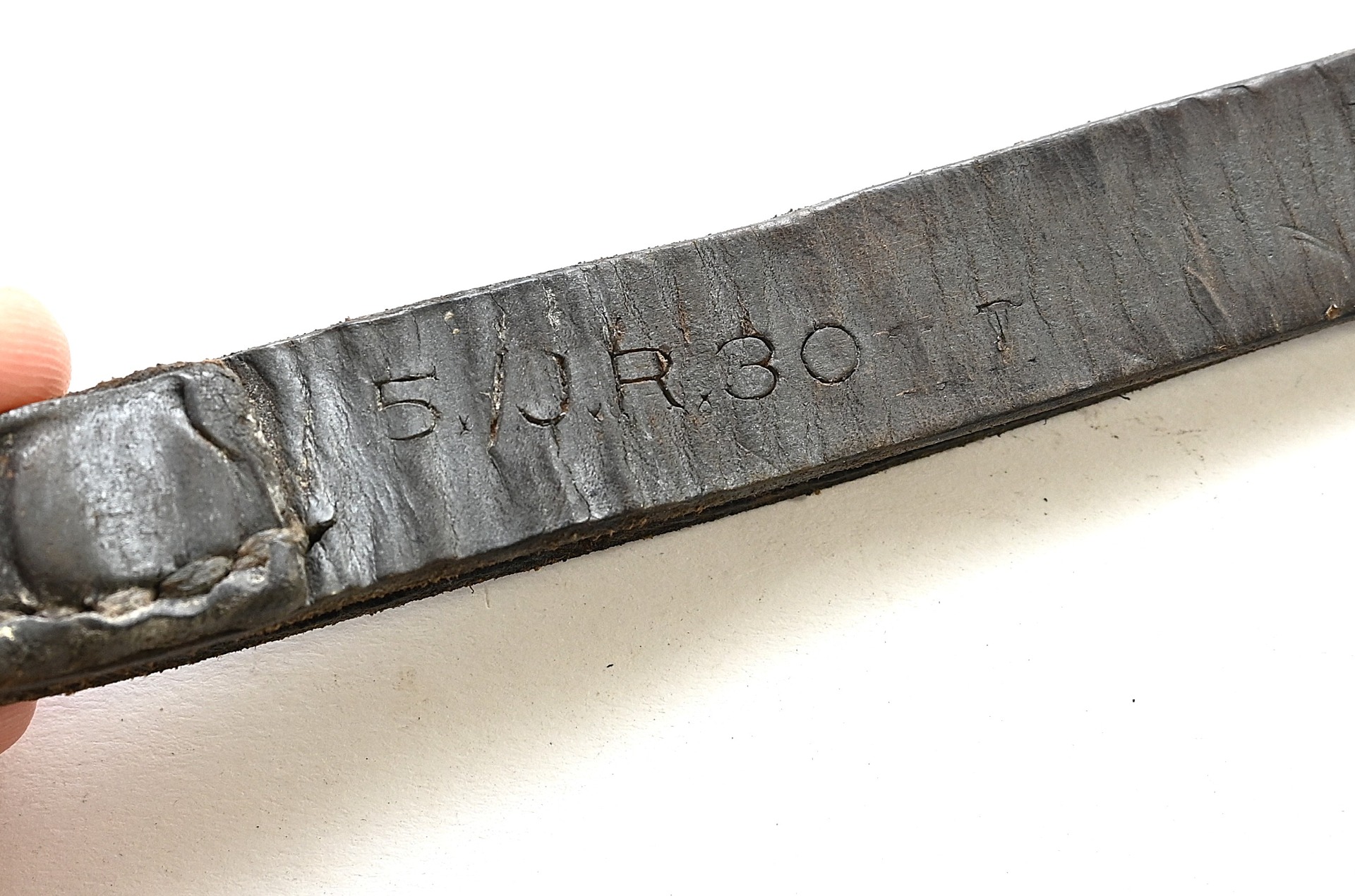 The strap shows overall signs of wear. The leather is supple. It has a surface cracks, but everything is solid. The strap is maker marked on the tip. It's also unit marked with 5.kompanie Infanterie Regiment 30.