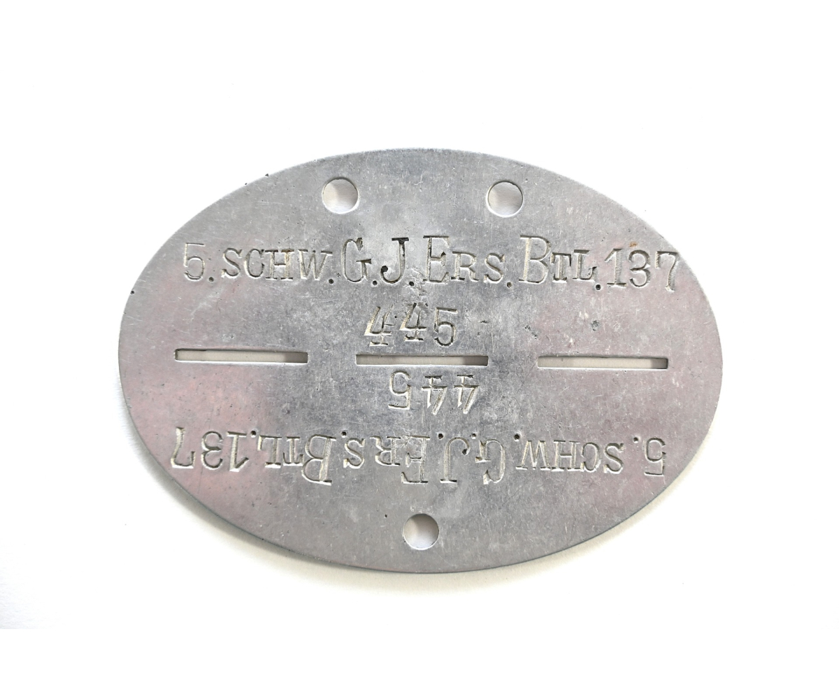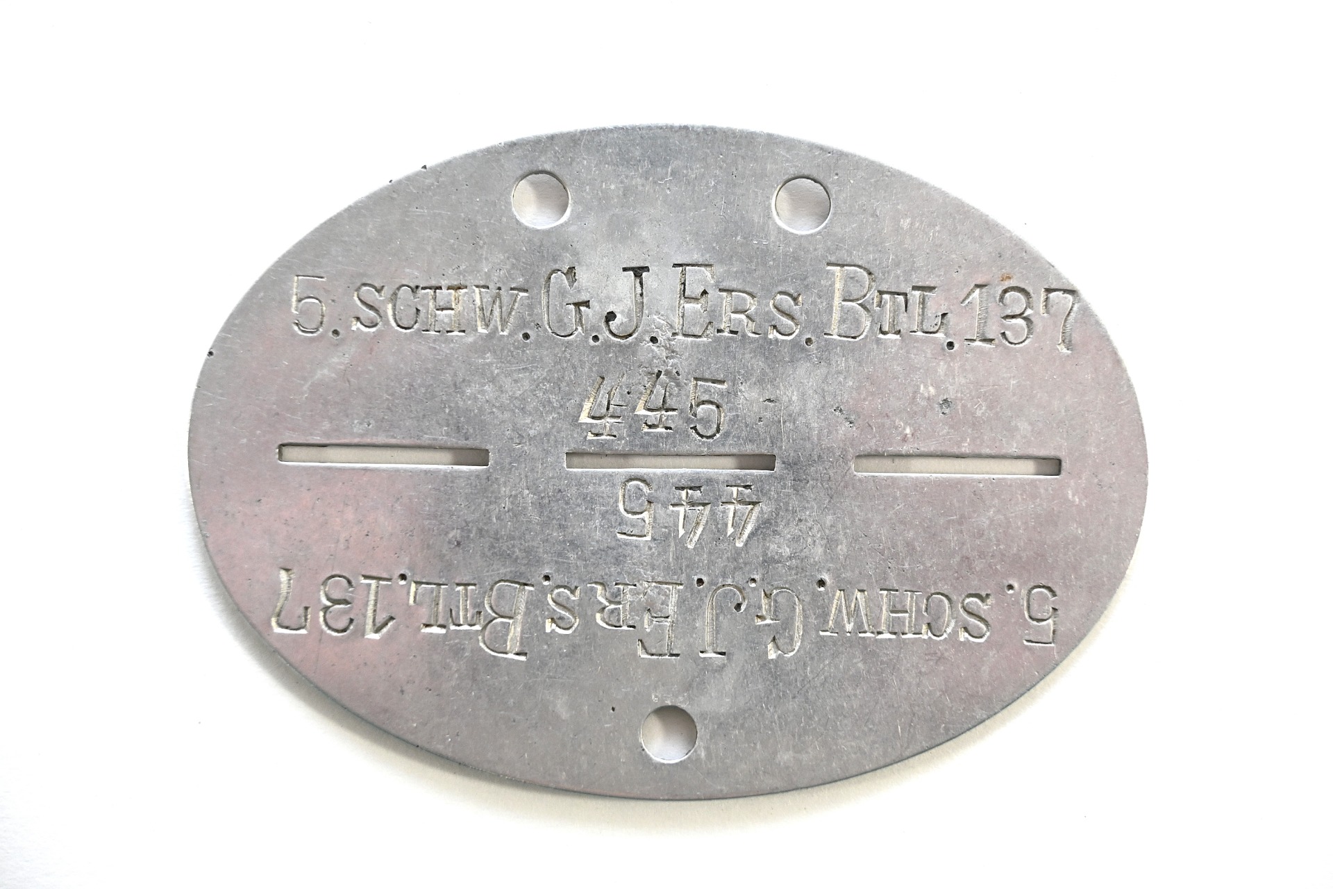 The tag or 'Erkennungsmarke' shows overall normal signs of wear. It belonged to a soldier who was drafted in the 5.Schwere Kompanie Gebirgsjäger Ersatz Bataillon 137. This unit was formed in August 1939. It trained and supplied soldiers for units within the 2.Gebirgs-Division. This division operated in Norway and fought in Narvik and Kirkenes. It spend most of the war in Norway, Lappland and Denmark.