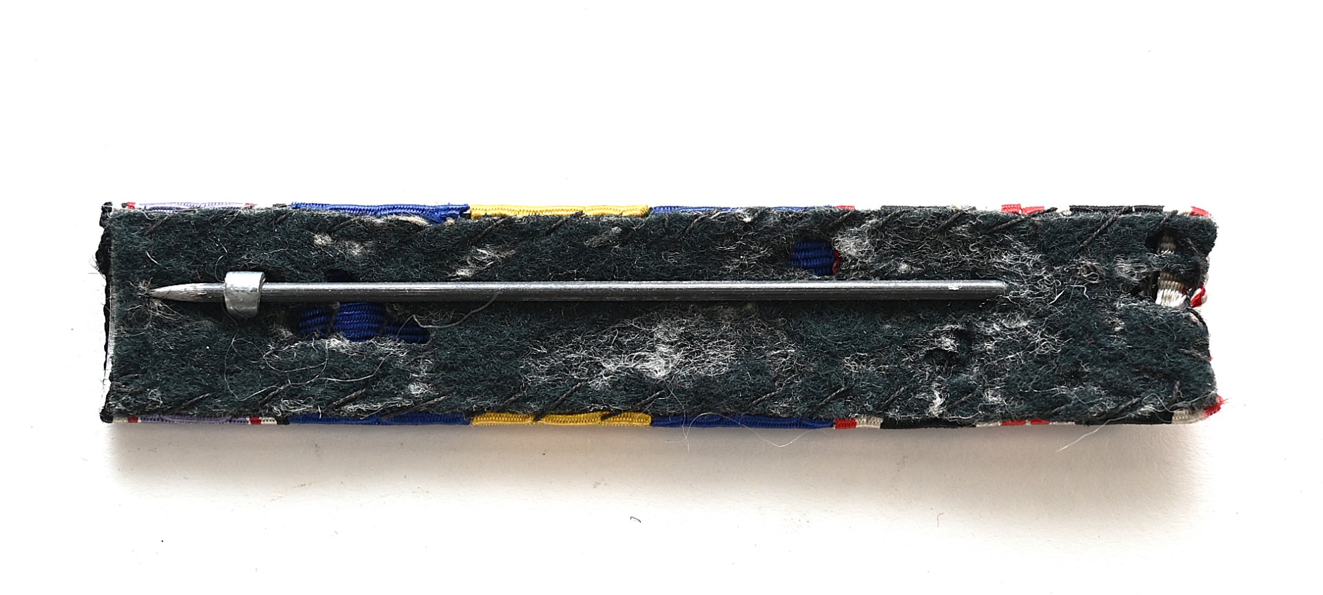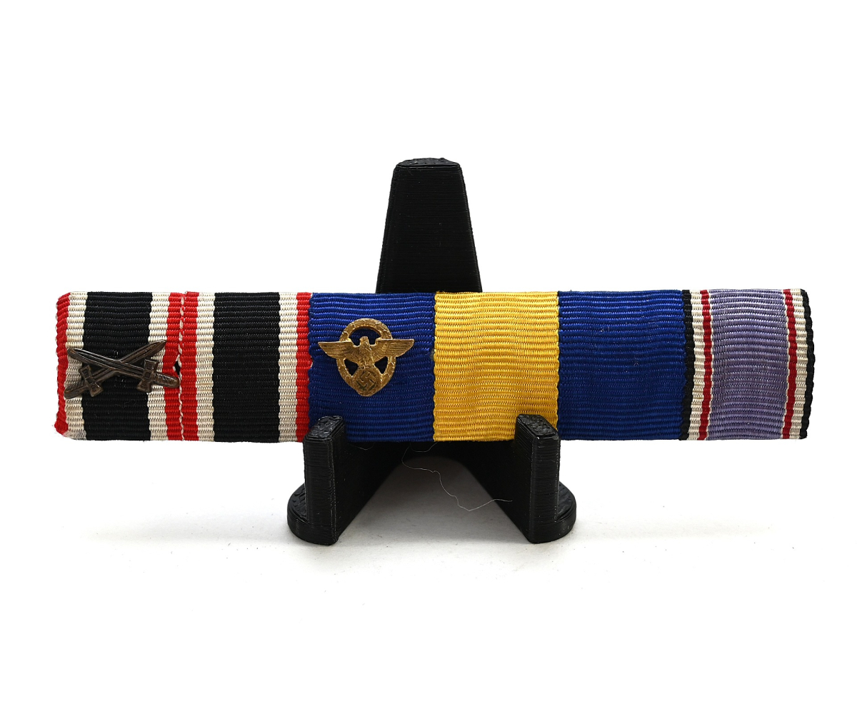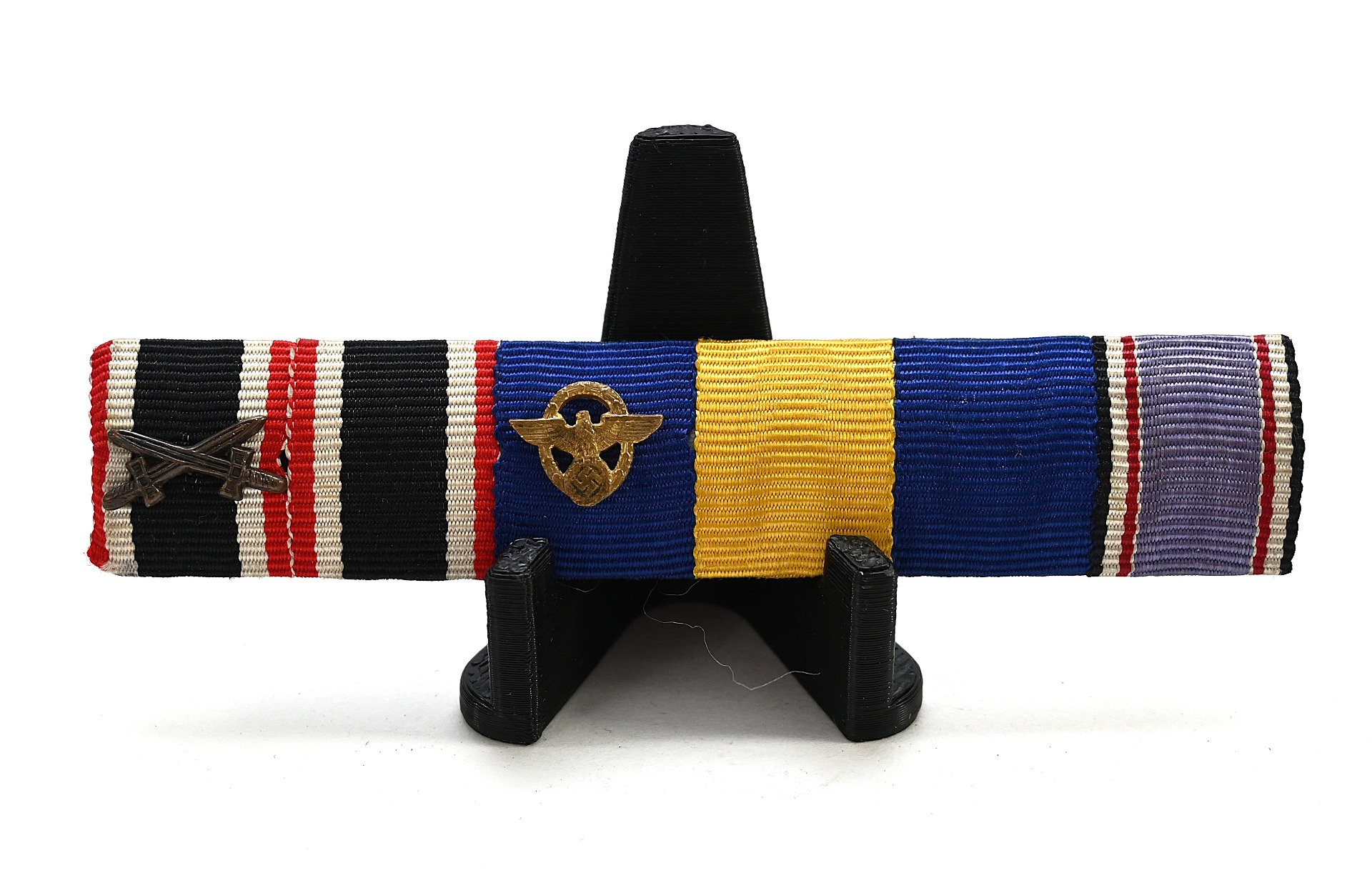 The ribbon bar shows overall normal signs of wear. It's complete with working needle on the back. It contains the ribbons of the following medals/awards; Kriegsverdienstkreuz 2.Klasse mit Schwertern, Kriegsverdienstkreuz Ohne Schertern, Polizei Dienstauszeichnung, Centenarmedaille Kaiser Wilhelm, Treudienst, and Luftschutz Ehrenzeichen.