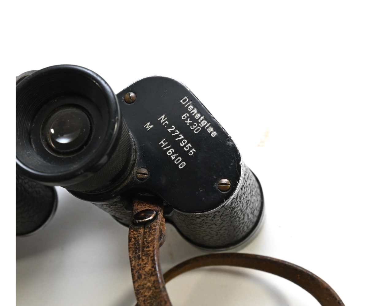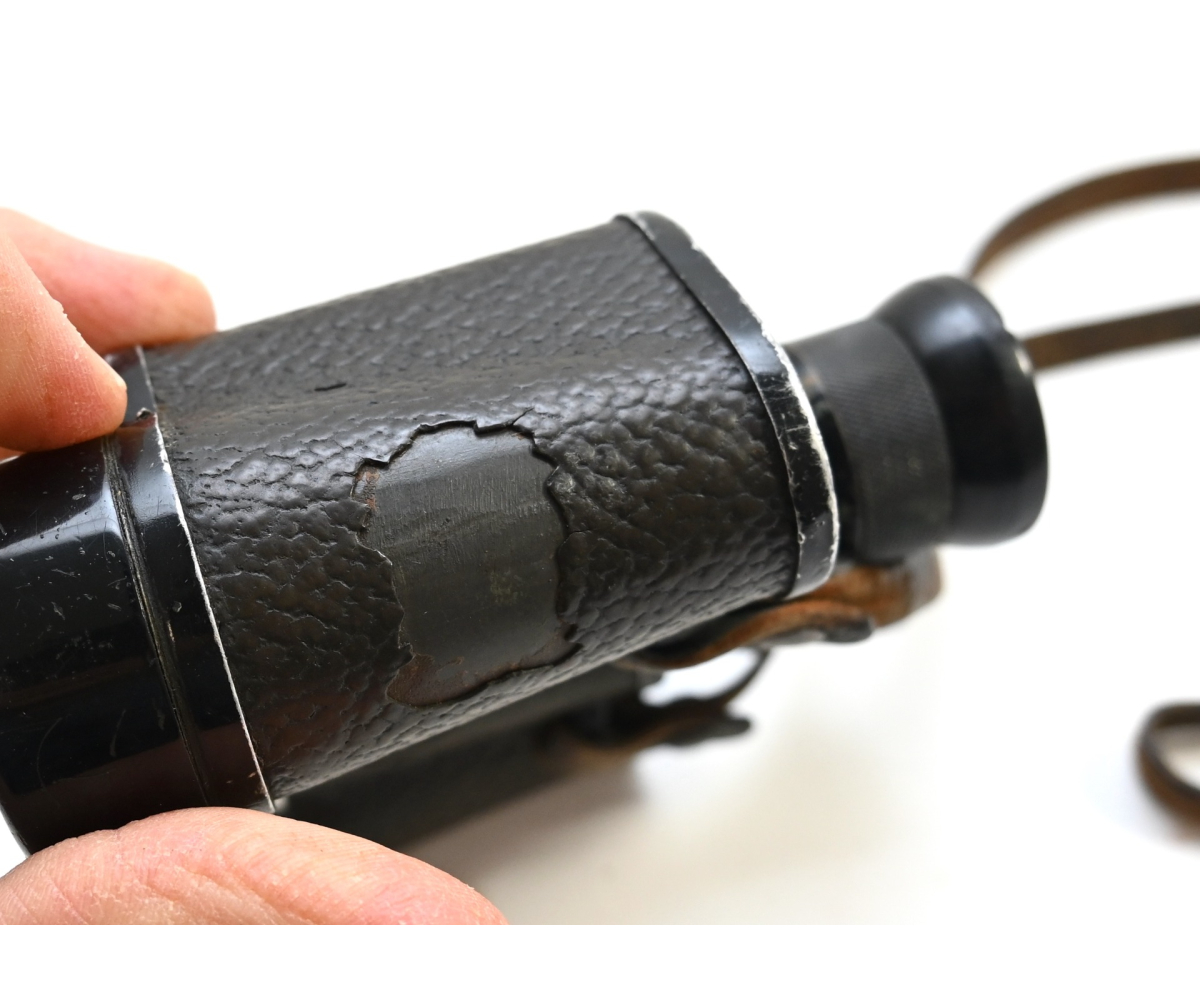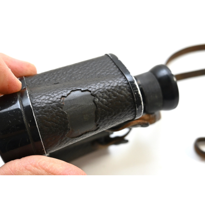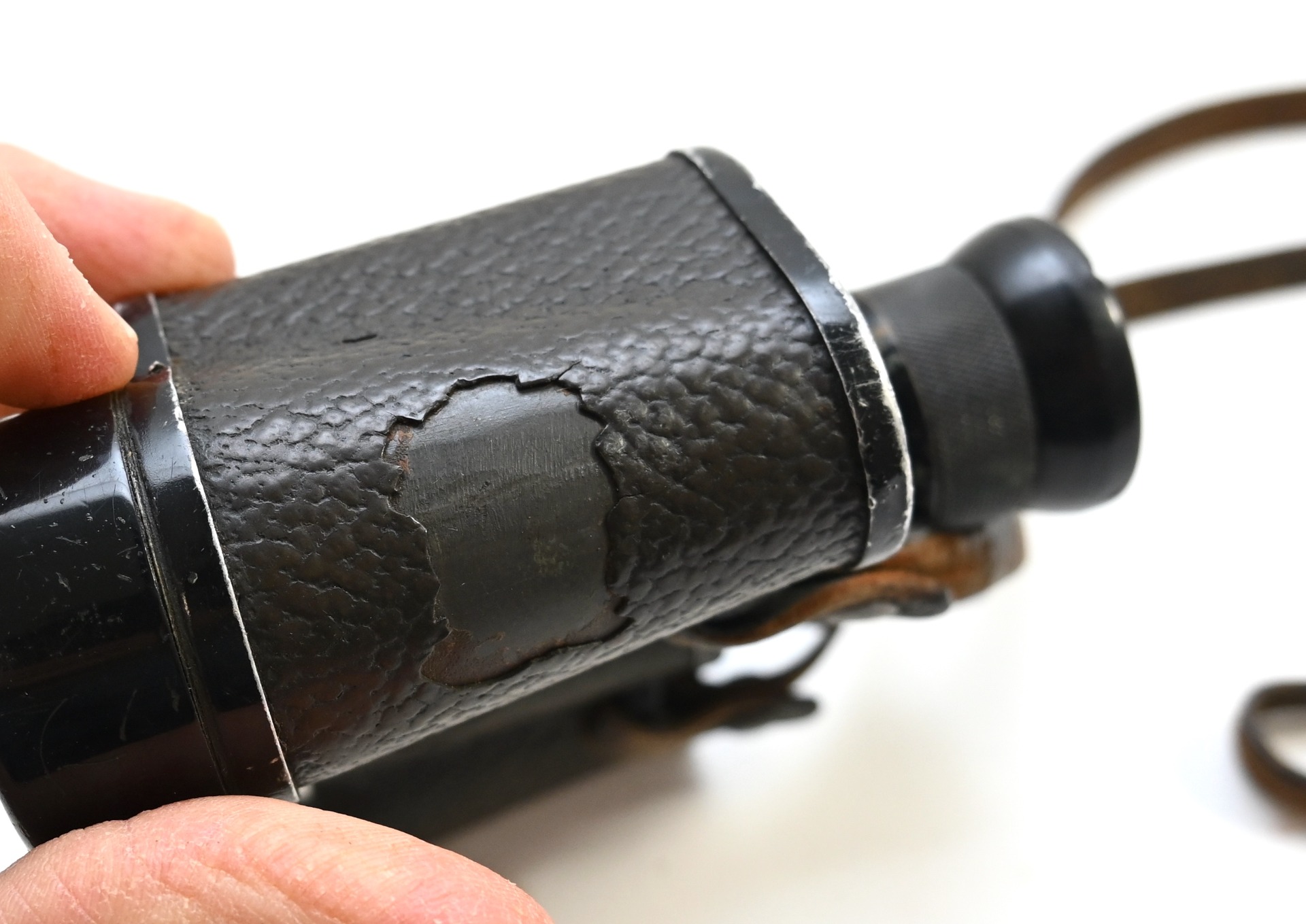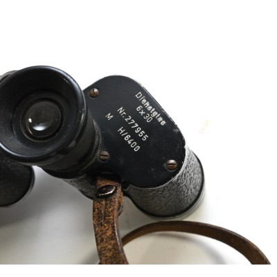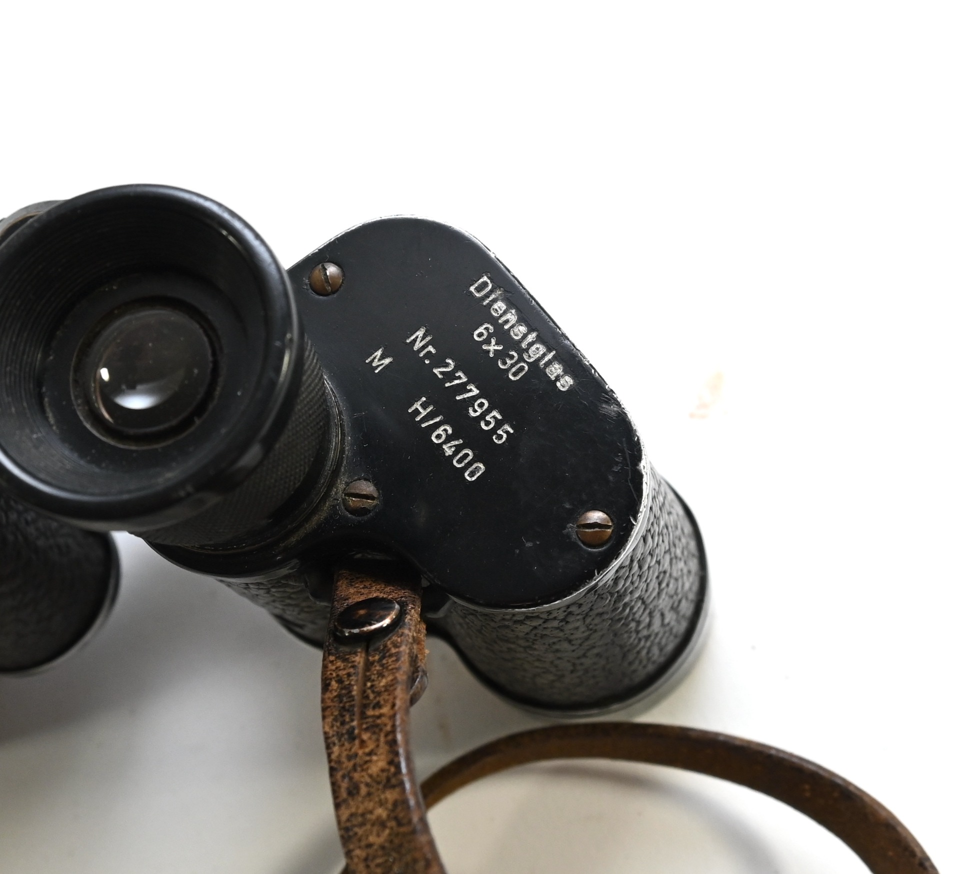 The binocular is in overall good condition. Has a nice patina. Both lenses are in working order. That means you can focus them. The visibility is pretty good (beter in hand). The strichplatte is also present. The right side is marked with '6x30' the serial number '277955', the letter 'M'(etrics) and 'H/6400' (meaning it has a strichtplatte). The left side is marked with the maker 'Busch Rathenow'. The strap is in used but good, solid and supple condition.