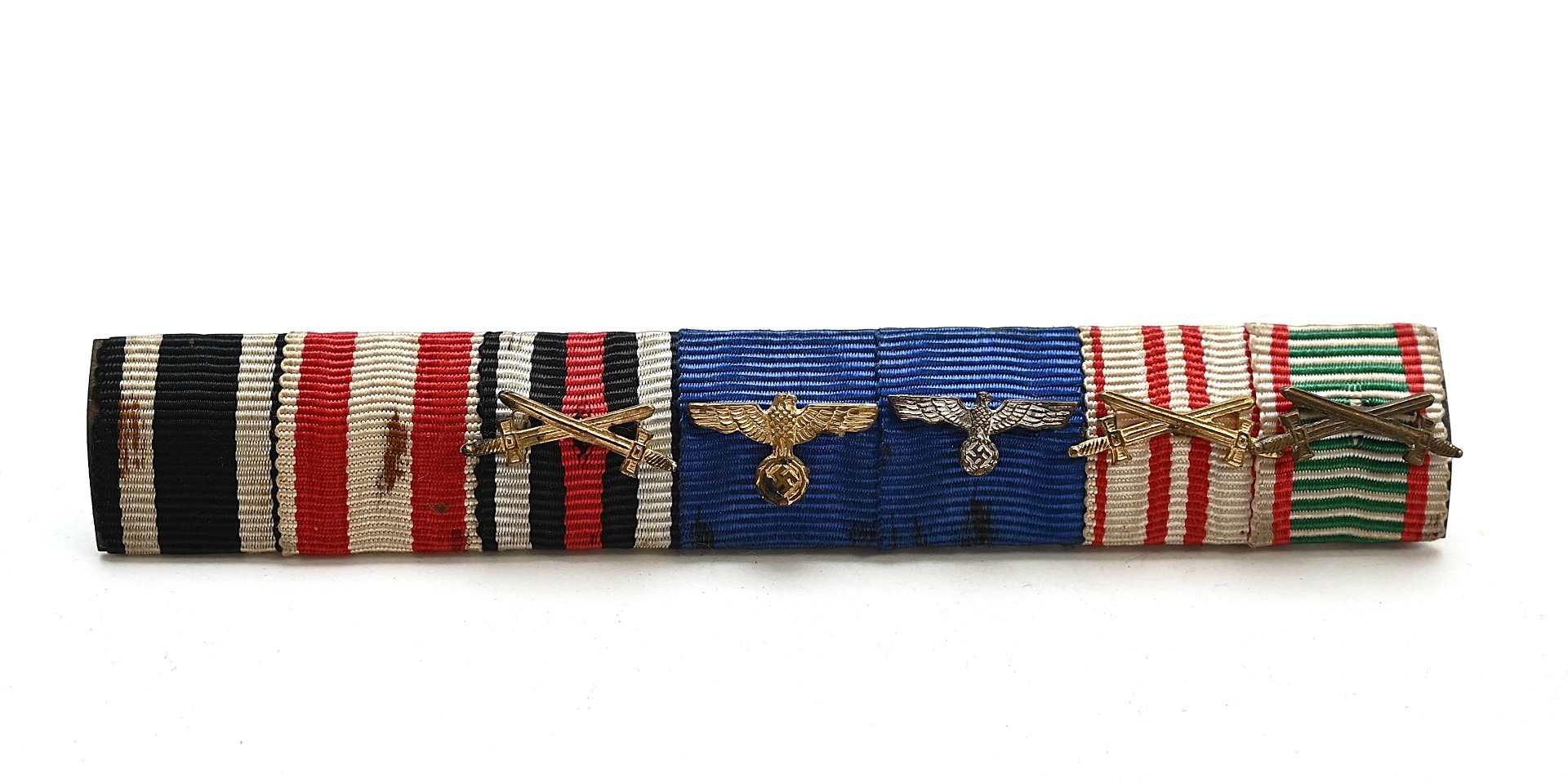 The bar shows overall normal signs of wear. It belonged to a World War 1 veteran who also served within the Wehrmacht. The bar consist out of the following medal ribbons; Eisernes Kreuz 2.Klasse, Roter Adler Orden?, Ehrenkreuz für Kriegsteilnehmer with swords, Dienstauszeichnung 4 & 12 Jahre, Kriegserinnerungsmedaille mit Schwertern, Austro-Hungarian Pro Deo et Patria with swords.