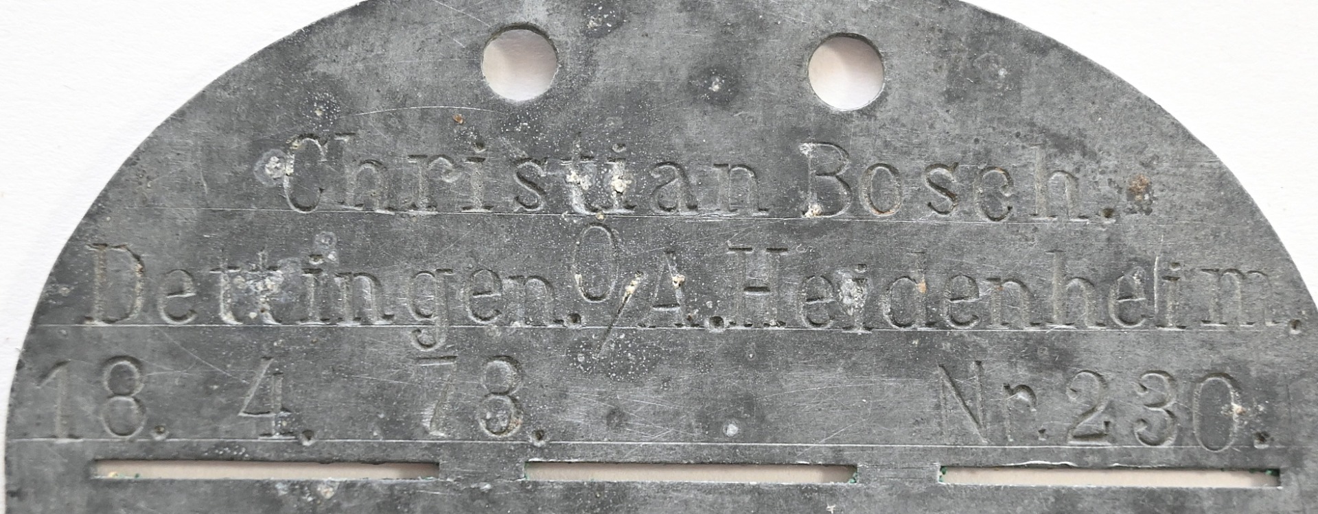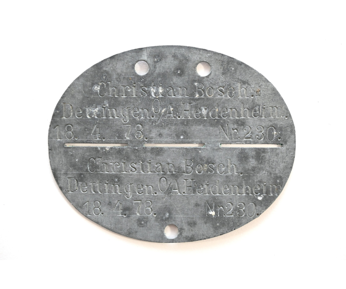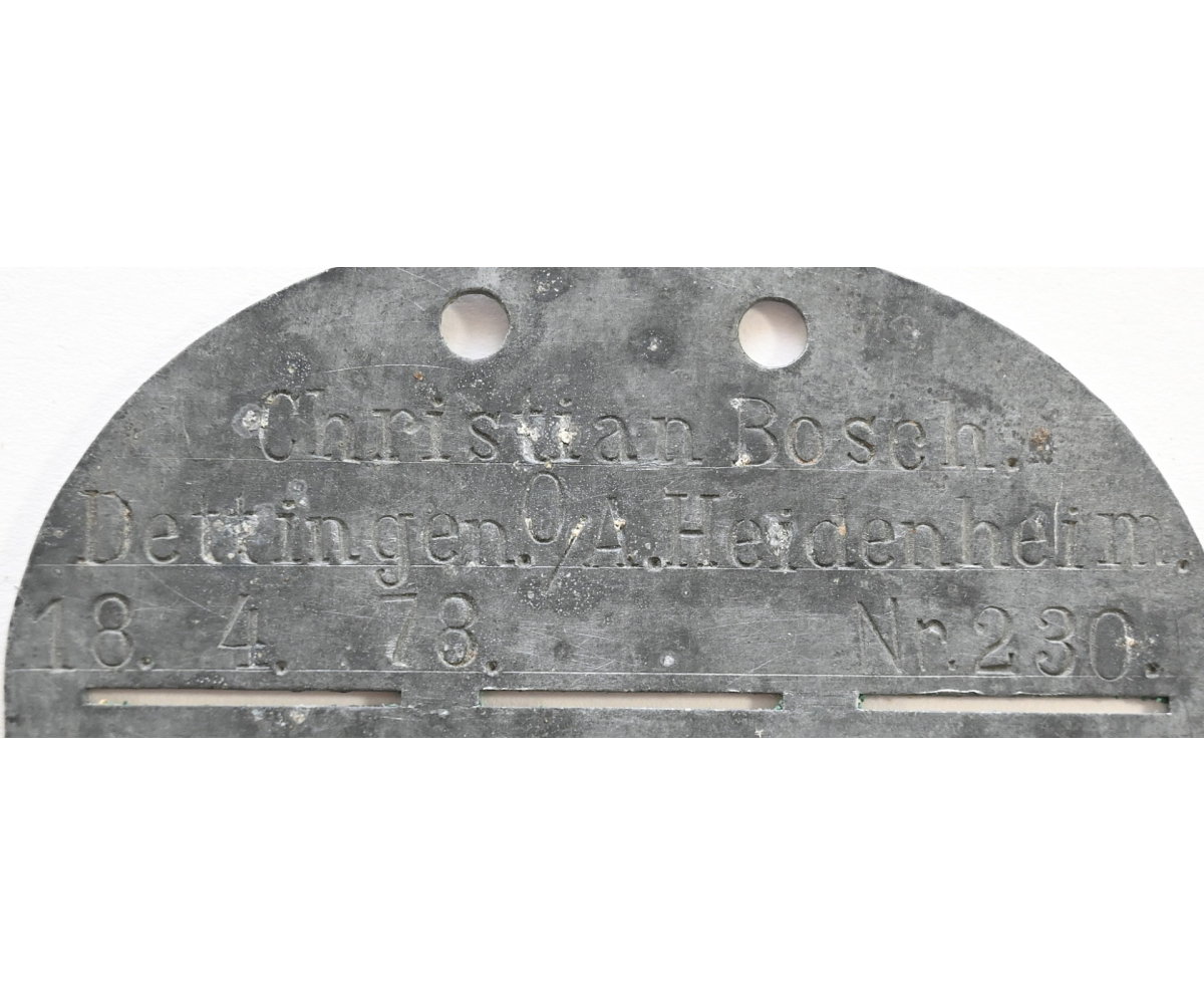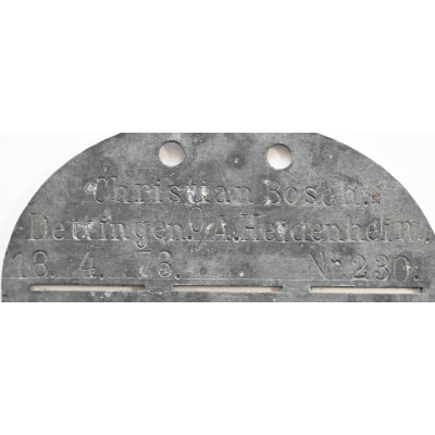 The tag or 'Erkennungsmarke' shows overall normal signs of wear. It belonged to Christian Bosch who was born in 18 April 1878 and served within the 8.batterie Wurttembergische Landwehr Feld Artillerie Regiment 2. This regiment was formed in July 1915. It saw combat during the battles in Verdun, Champagne, Argonne and Metz.