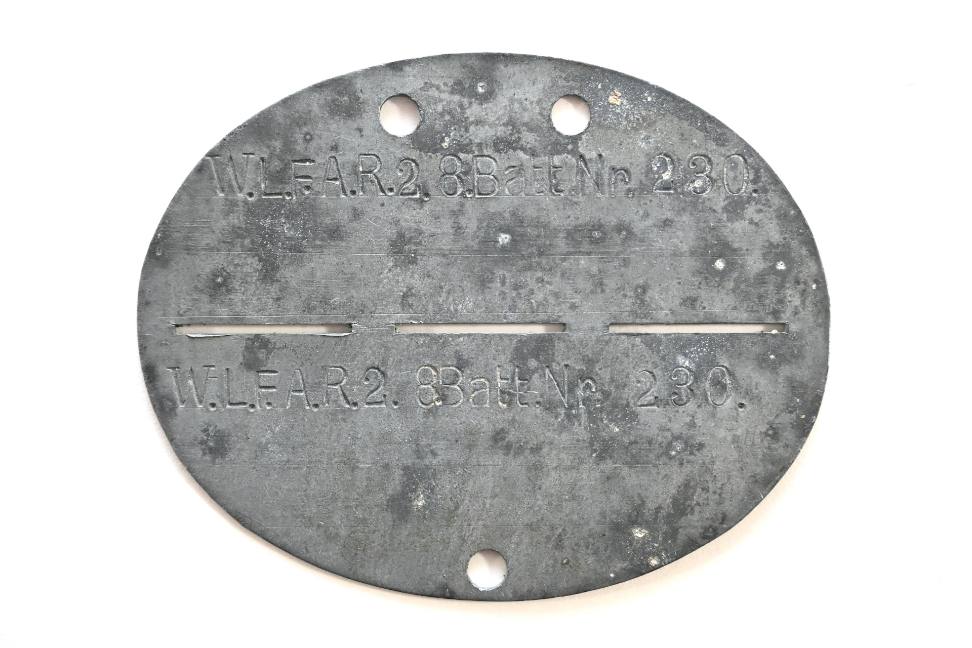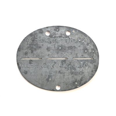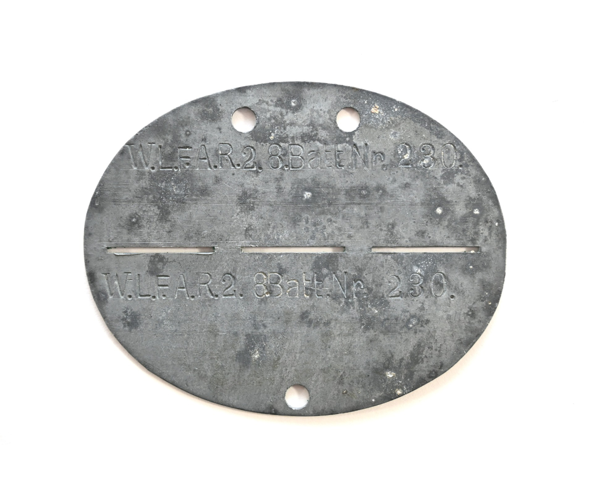 The tag or 'Erkennungsmarke' shows overall normal signs of wear. It belonged to Christian Bosch who was born in 18 April 1878 and served within the 8.batterie Wurttembergische Landwehr Feld Artillerie Regiment 2. This regiment was formed in July 1915. It saw combat during the battles in Verdun, Champagne, Argonne and Metz.