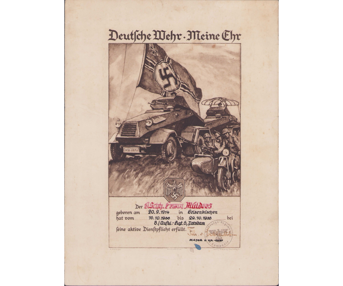 The document shows overall normal signs of wear. It's solid and free from rips/tears. It was issued to Oberschutze Erwin Mülders who, from 16.Oct.1936 - 29.Oct.1938, served in the 8.Kompanie Aufklärungs Abteilung 6 in Potsdam. This unit was formed in 1938 from Aufklärungs Abteilung 8 and in November 1938 became part of the 5.Panzer-Division.