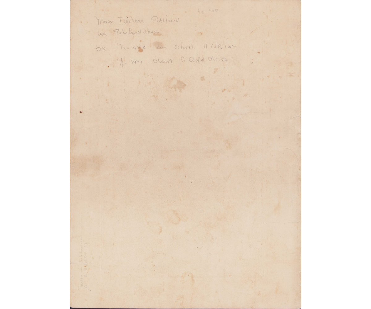 The document is signed by the Major and Kompanie Chef Freiherr Gottfried von Ecklandtstein. On the back of the document some information about this major has been written. He earned the Deutches Kreuz in Gold in February 1942 whilst served in the II.Bataillon Schützen Regiment 104 and in July 1944 served, as an Oberst, in Panzer Aufklärungs Abteilung 17.