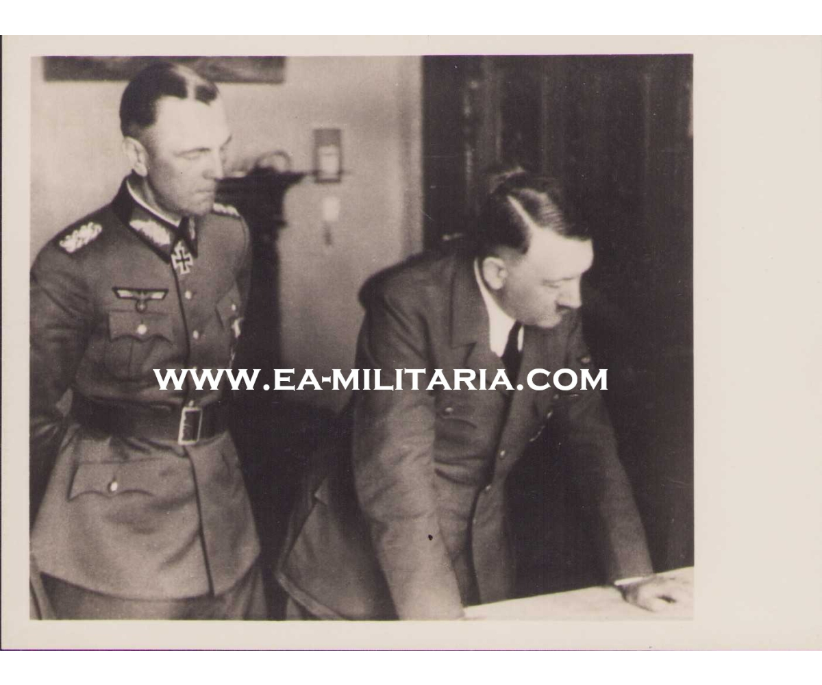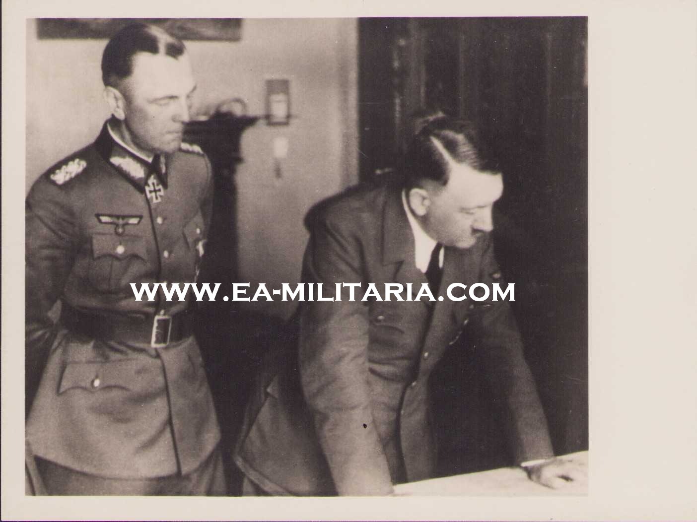The photo shows overall normal sign of storage wear. It was once in an album. Here general Friedrich Paulus and Adolf Hitler are looking at maps.