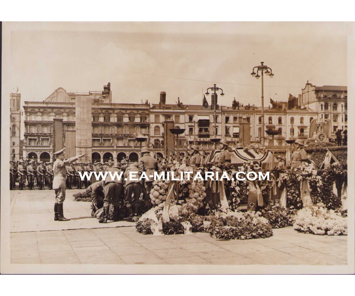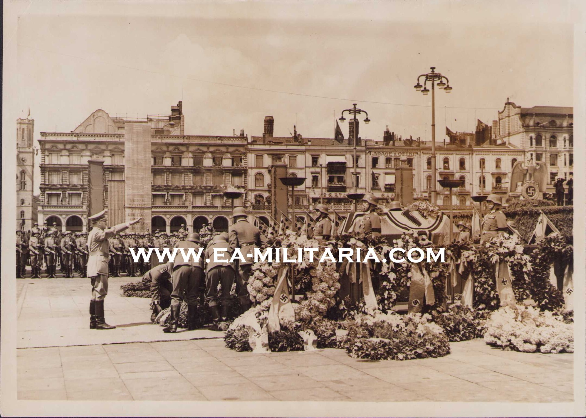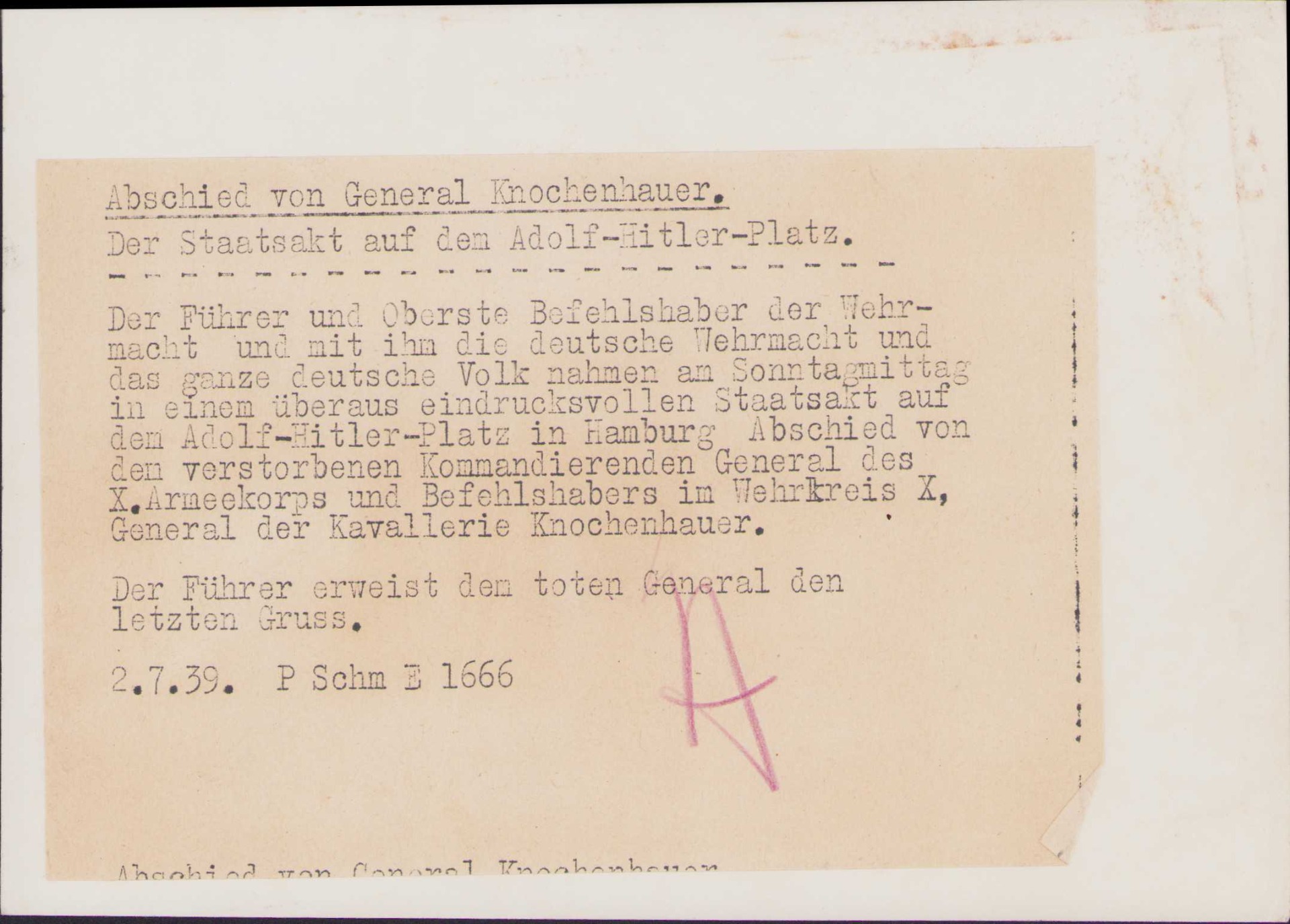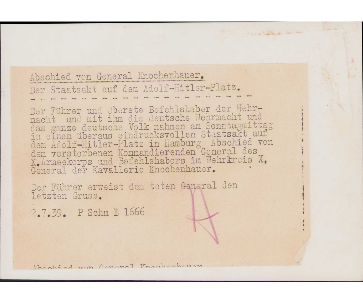The photo shows overall normal signs of storage wear. It's complete with paper caption on the back. It shows Adolf Hitler pays his respect to General der Kavallerie Wilhelm Knochenhauer. Knochenhauer was the commanding General of the X.Armeekorps and Befehlshaber of Wehrkreis X.