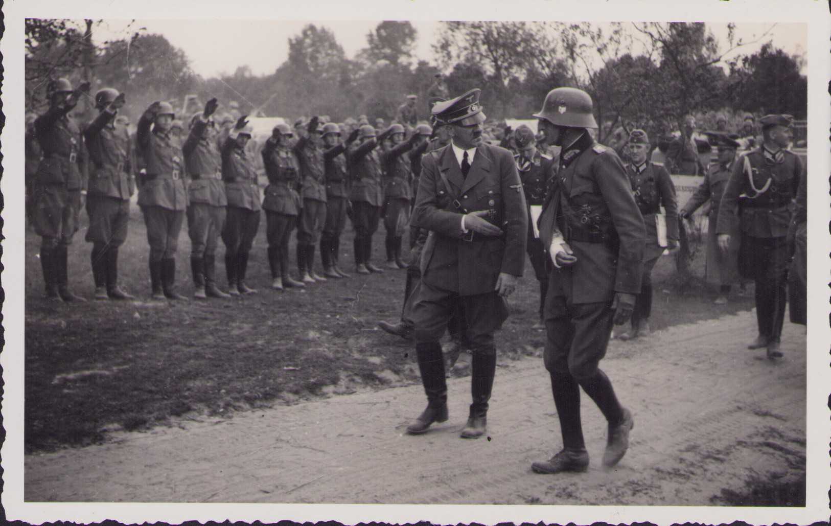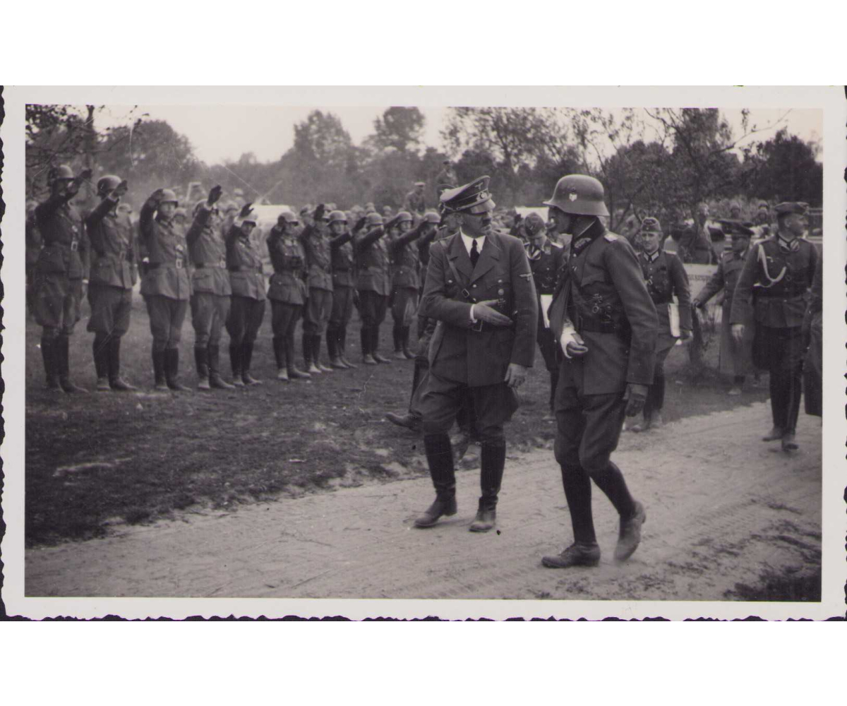 The photo shows overall normal signs of wear. It was once in an album. Here Hitler is visiting/inspecting his troops together with a general in Poland.