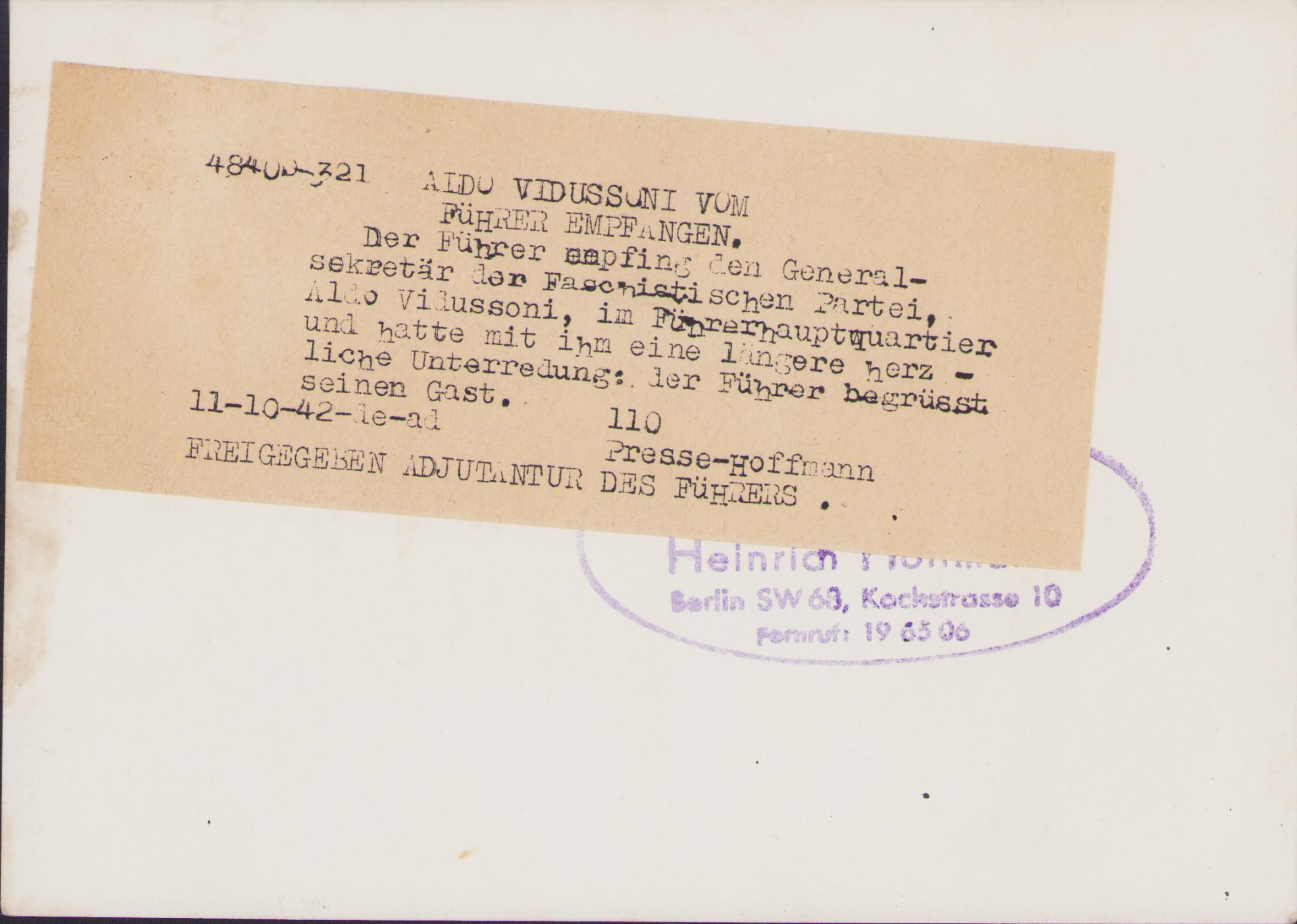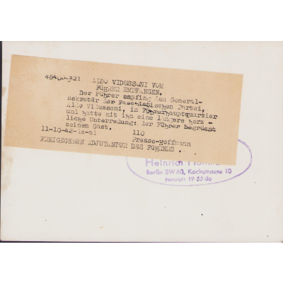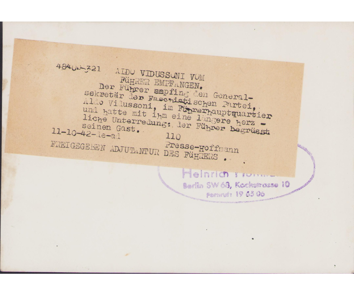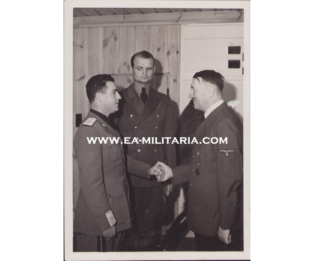 Very nice German press photo in very good condition of Italian politician Aldo Vidussoni visiting Adolf Hitler.