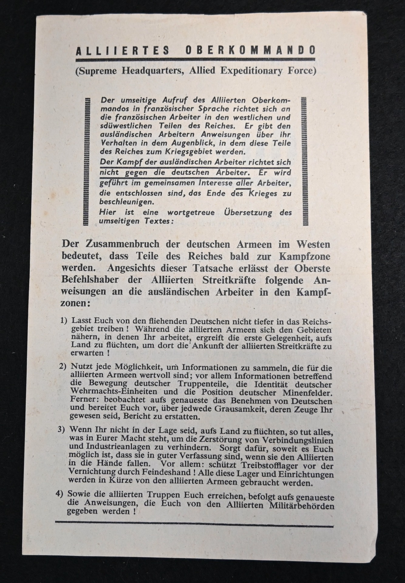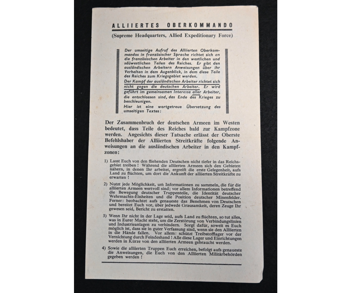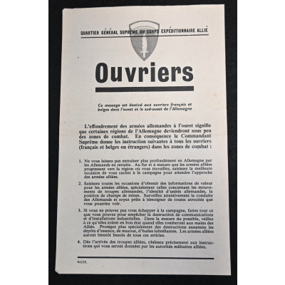 The flyer is an urgent warning from the Allied High Command to the French workers, to hide in the countryside, collect intell and protect important installations (like fuel depots) against retreating Germans, untill the allied foces arrive. The dimensions of the flyer are: 13,5 cm x 21,5 cm.
