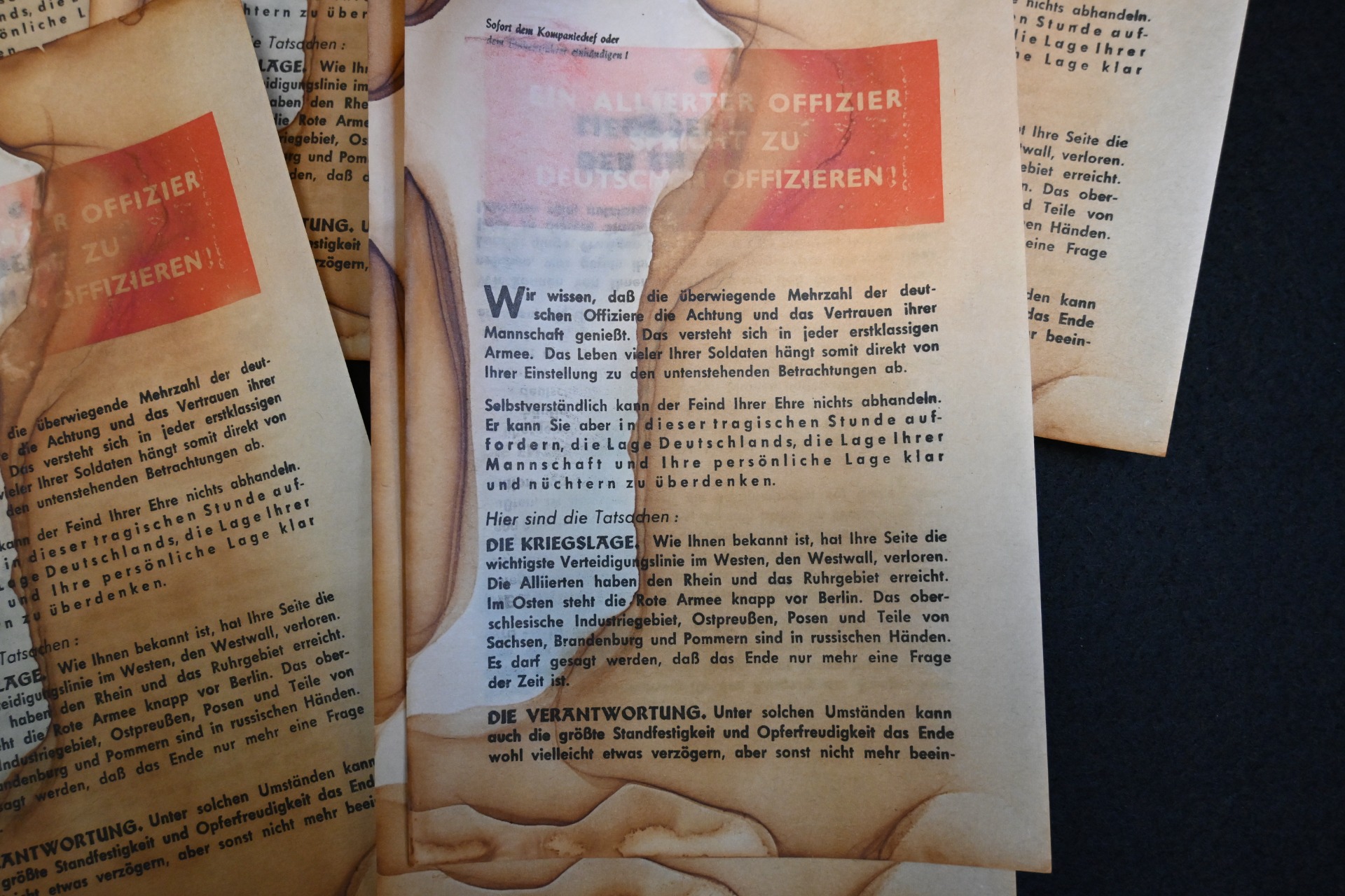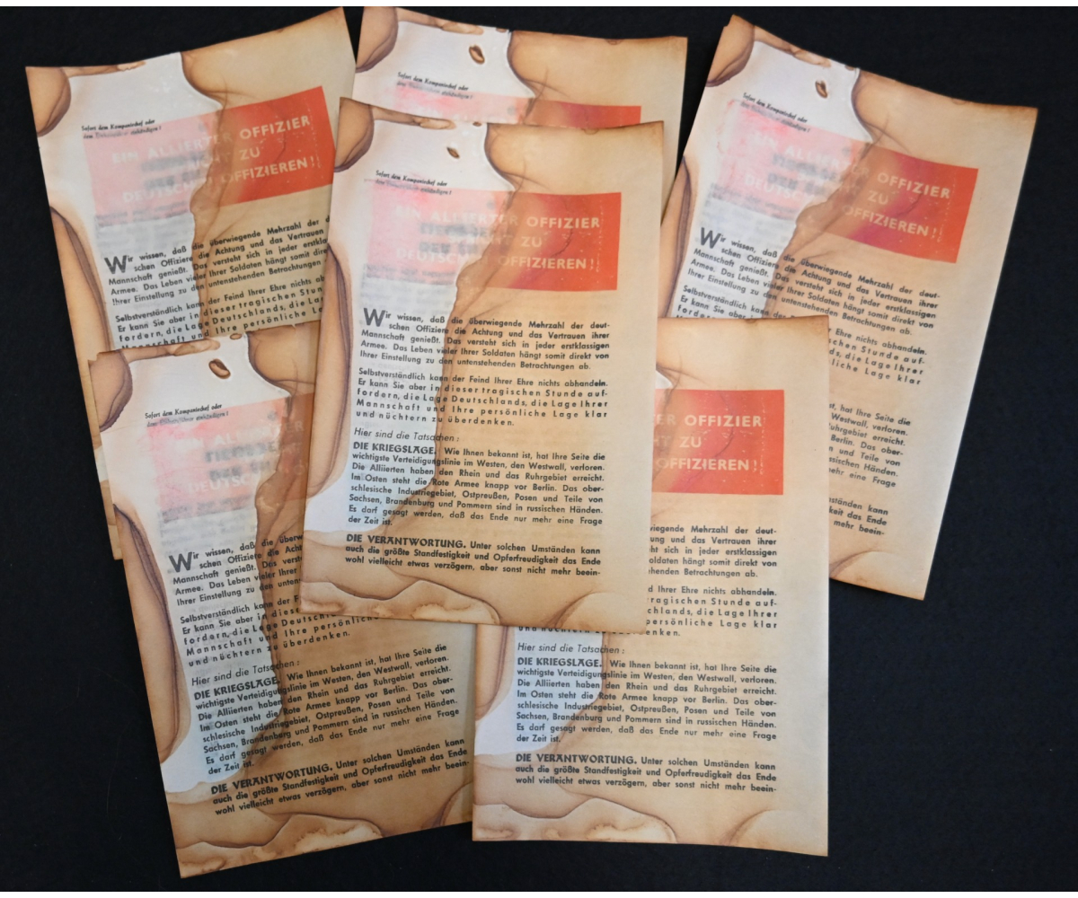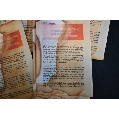 The 6 flyers are in used condition and have a few stains. Flyers like these were thrown out of a plane or where put in an artillerie shell, shot and would then explode above German occupied territory. Not a lot of these survived and therefor hard to find. The dimensions of the flyer are: 21,5 cm x 14 cm.
