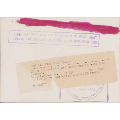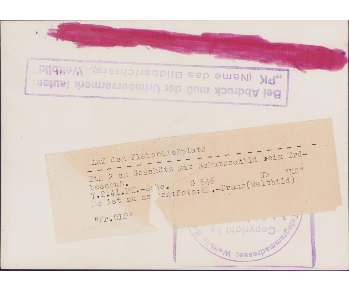 The photograph shows overall normal signs of storage wear. It's complete with paper caption on the back. The Flak crew is aiming on a target on the ground. Note the soldier on the far left is scanning through his binoculars and the soldier on the right through his Entfernungsmesser 36.