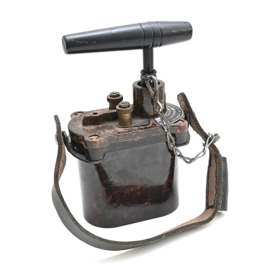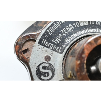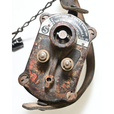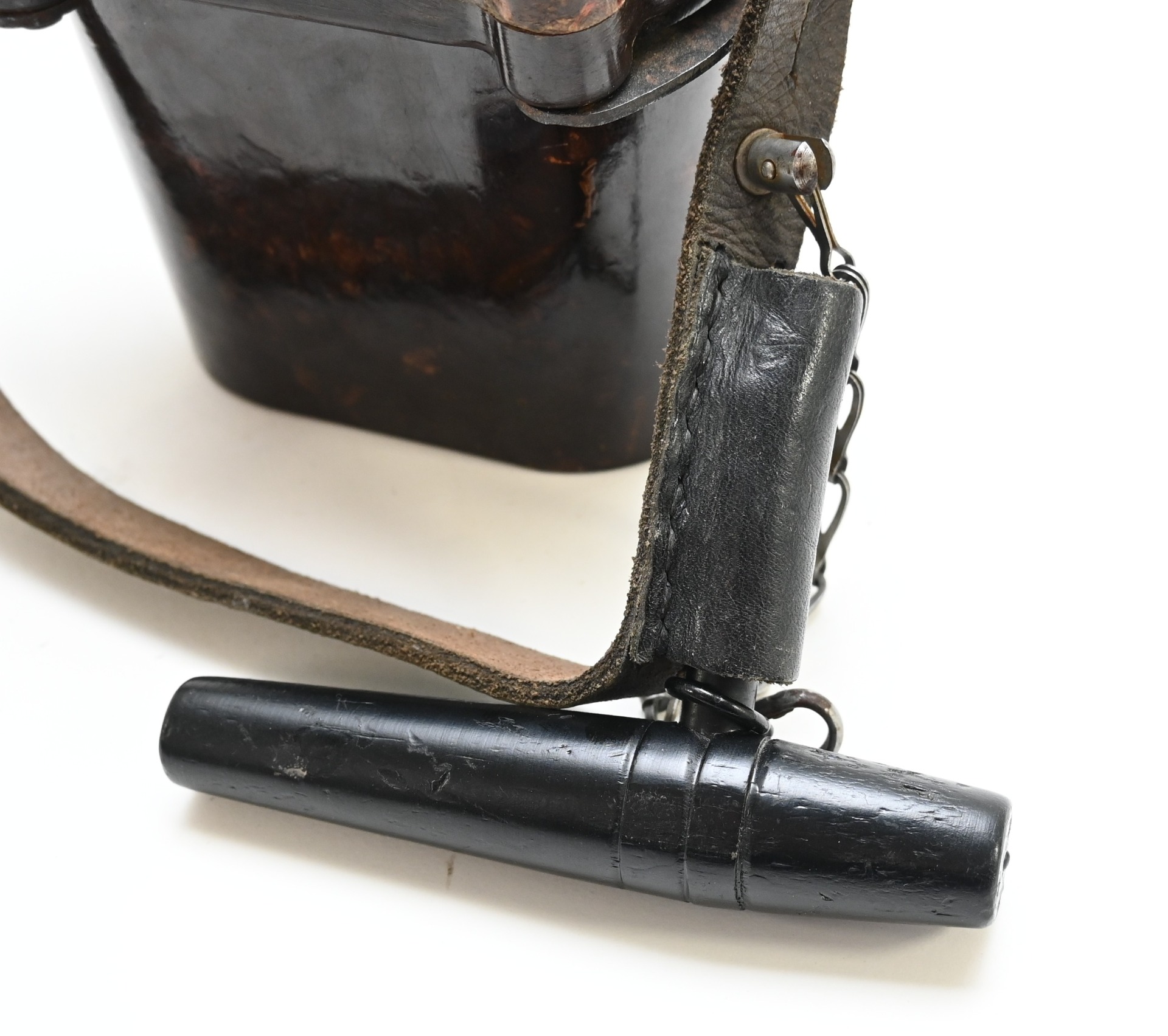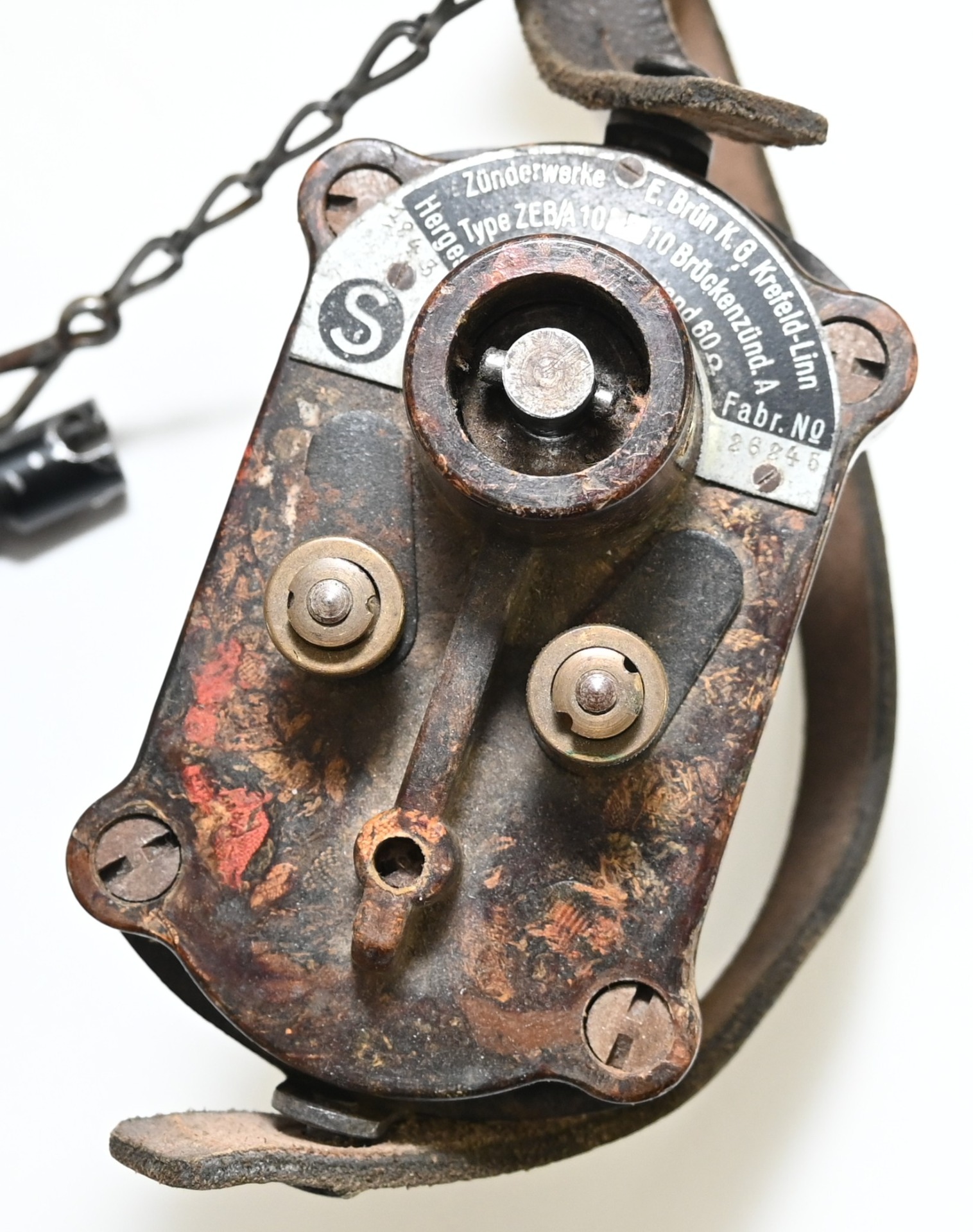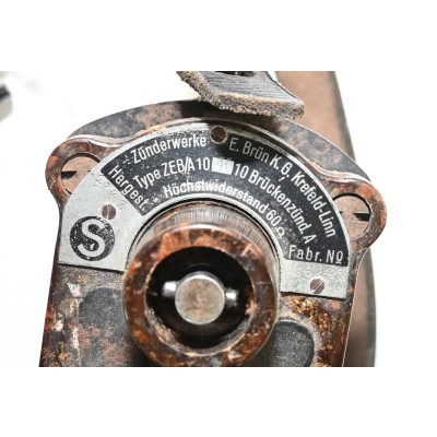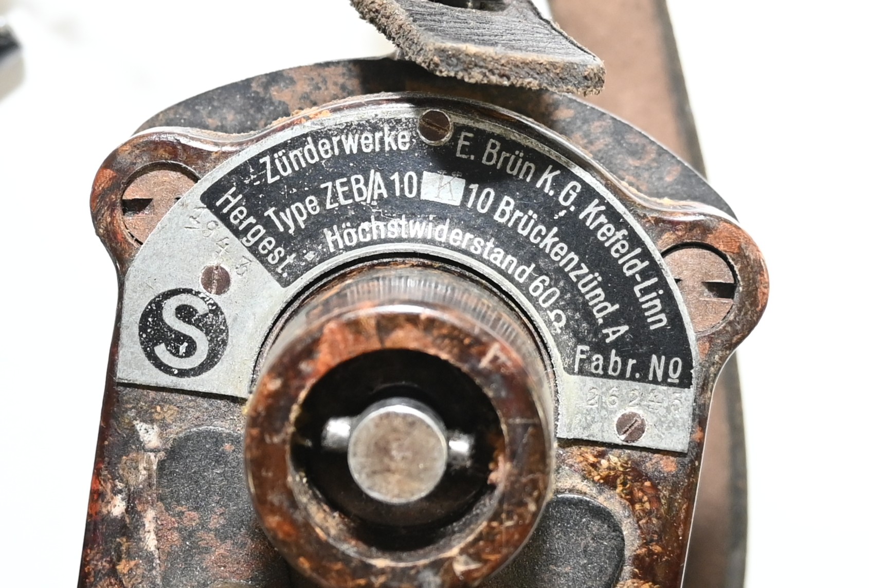 The Zündmaschine shows overall normal signs of wear. The bakelite is void of damages. It comes with the leather carrying handle and the wooden handle. The factory tag with data is present and intact. Nicely dated 1943. Allthough this is a so-called Bergbau Zündmaschine, it would look very nice in a Wehrmacht (pionier) display.