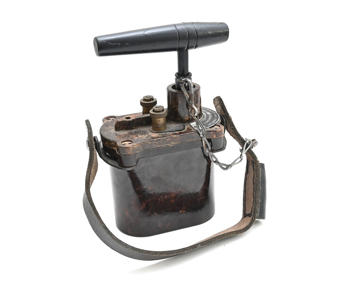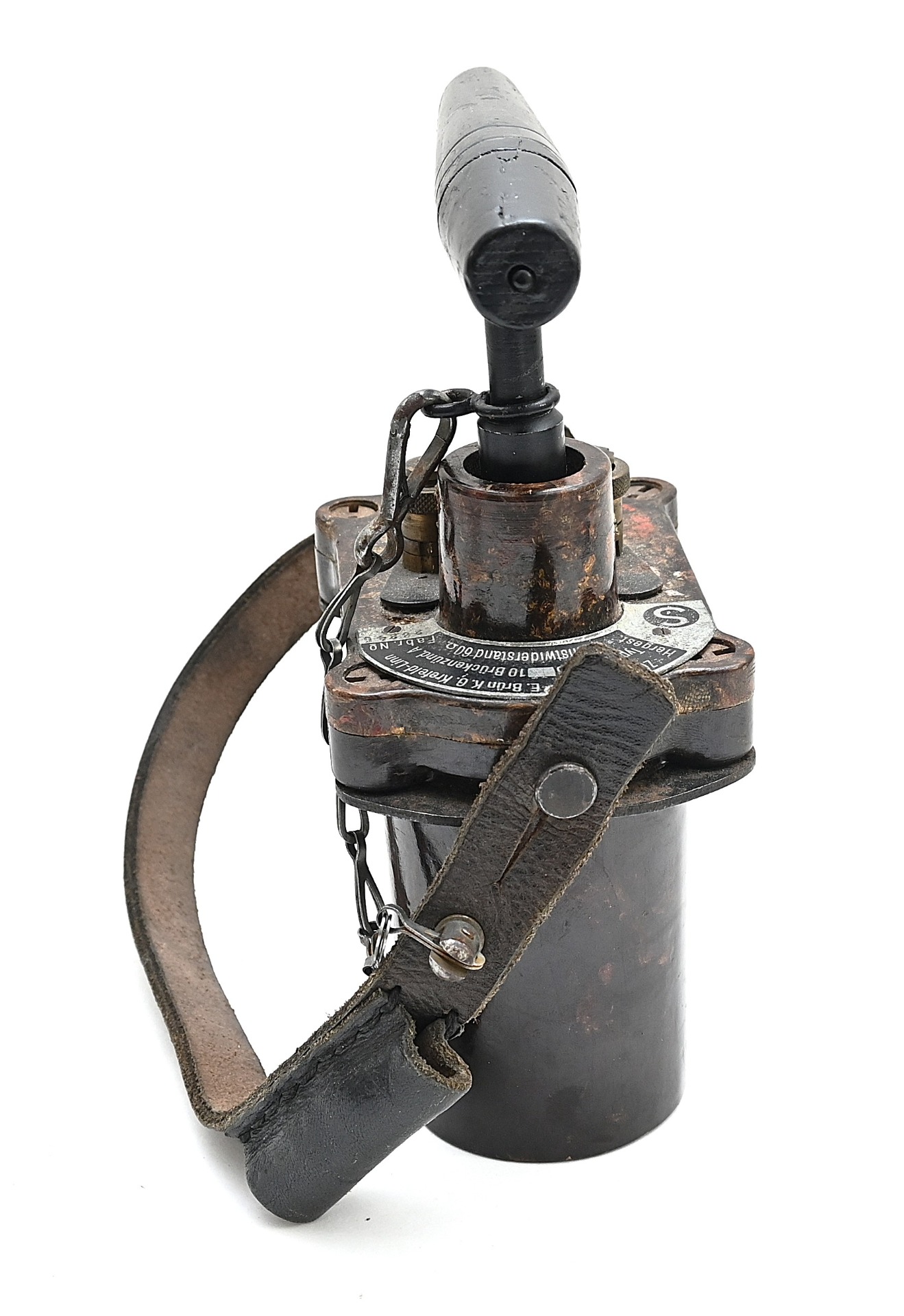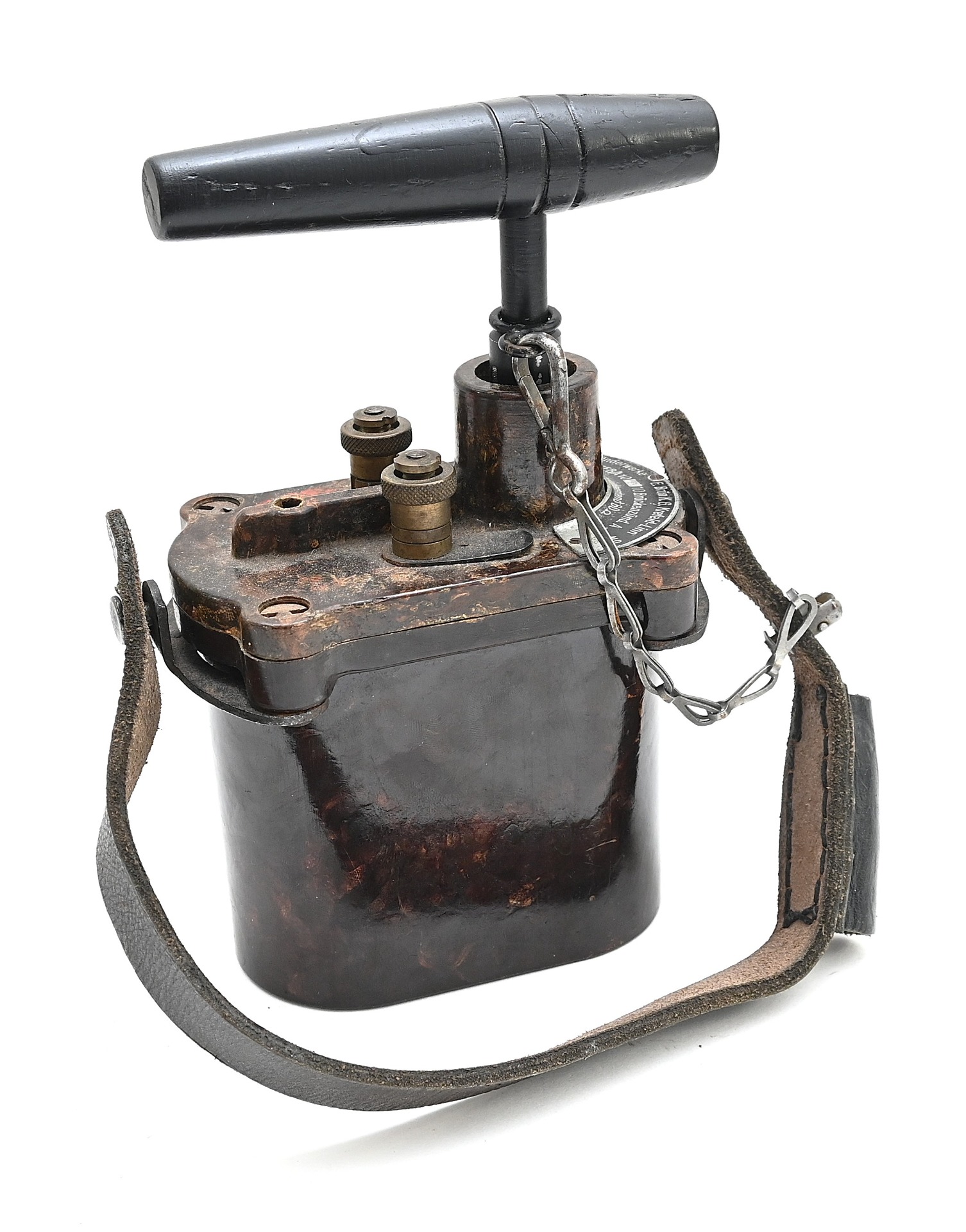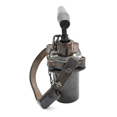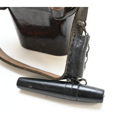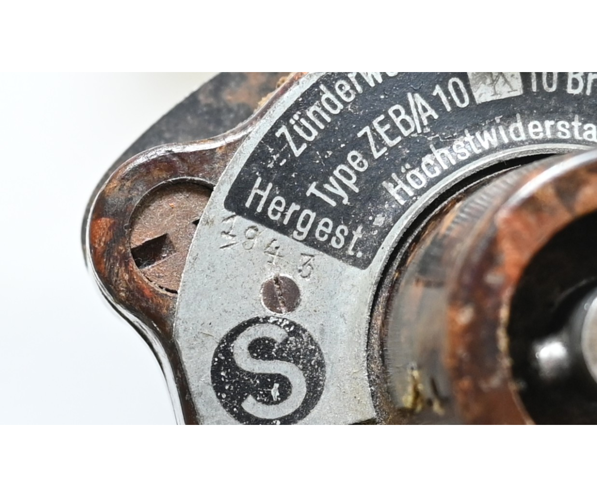 The Zündmaschine shows overall normal signs of wear. The bakelite is void of damages. It comes with the leather carrying handle and the wooden handle. The factory tag with data is present and intact. Nicely dated 1943. Allthough this is a so-called Bergbau Zündmaschine, it would look very nice in a Wehrmacht (pionier) display.
