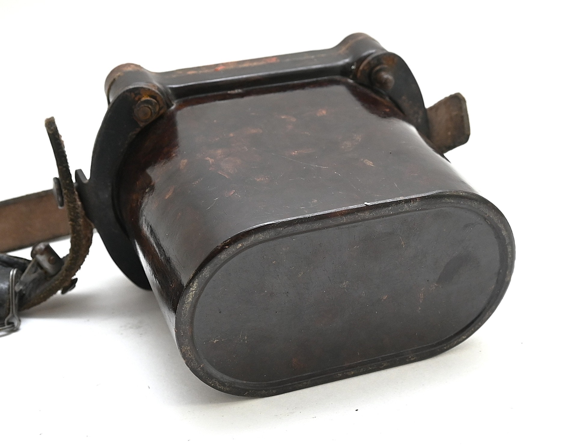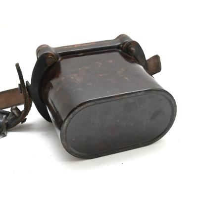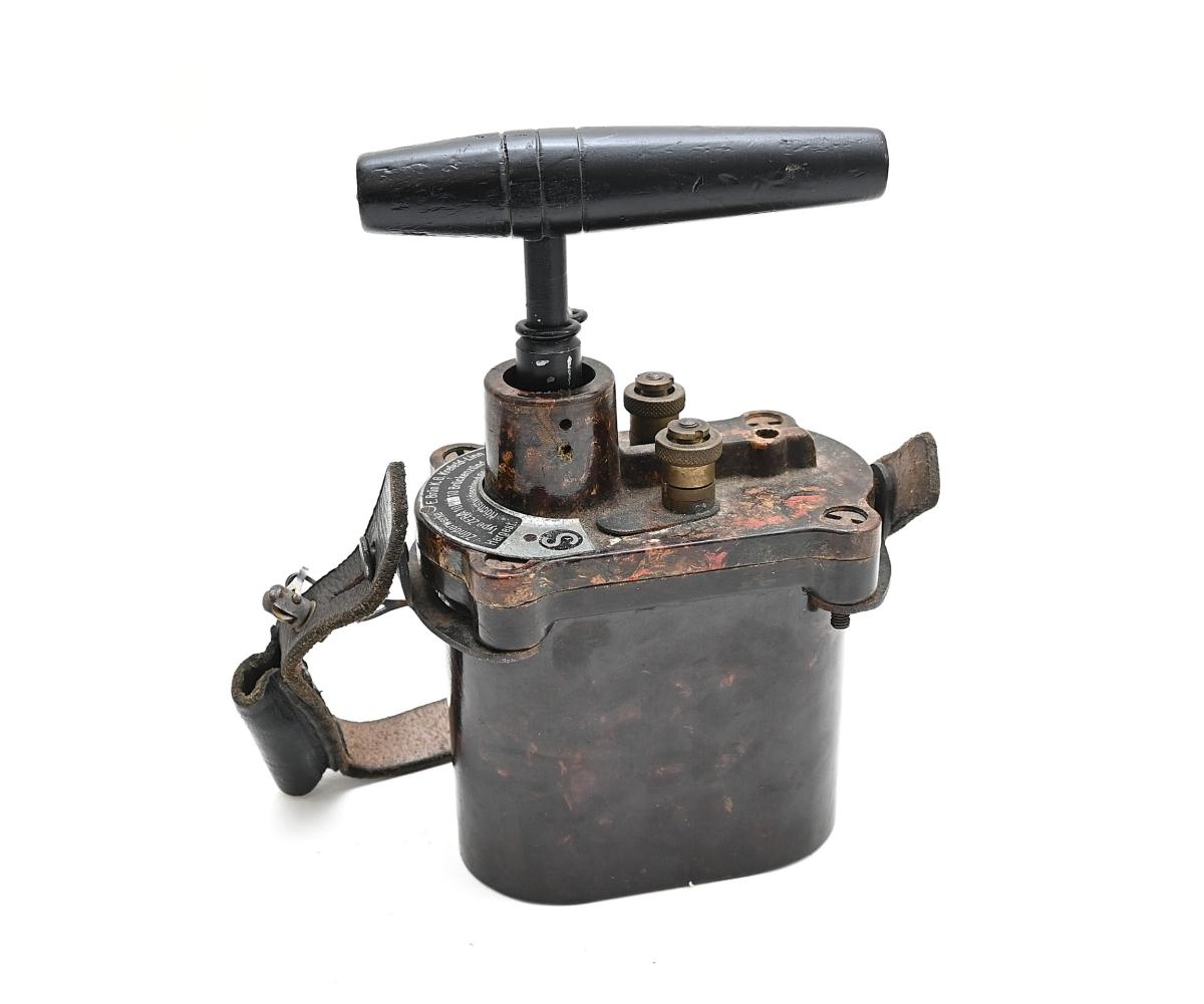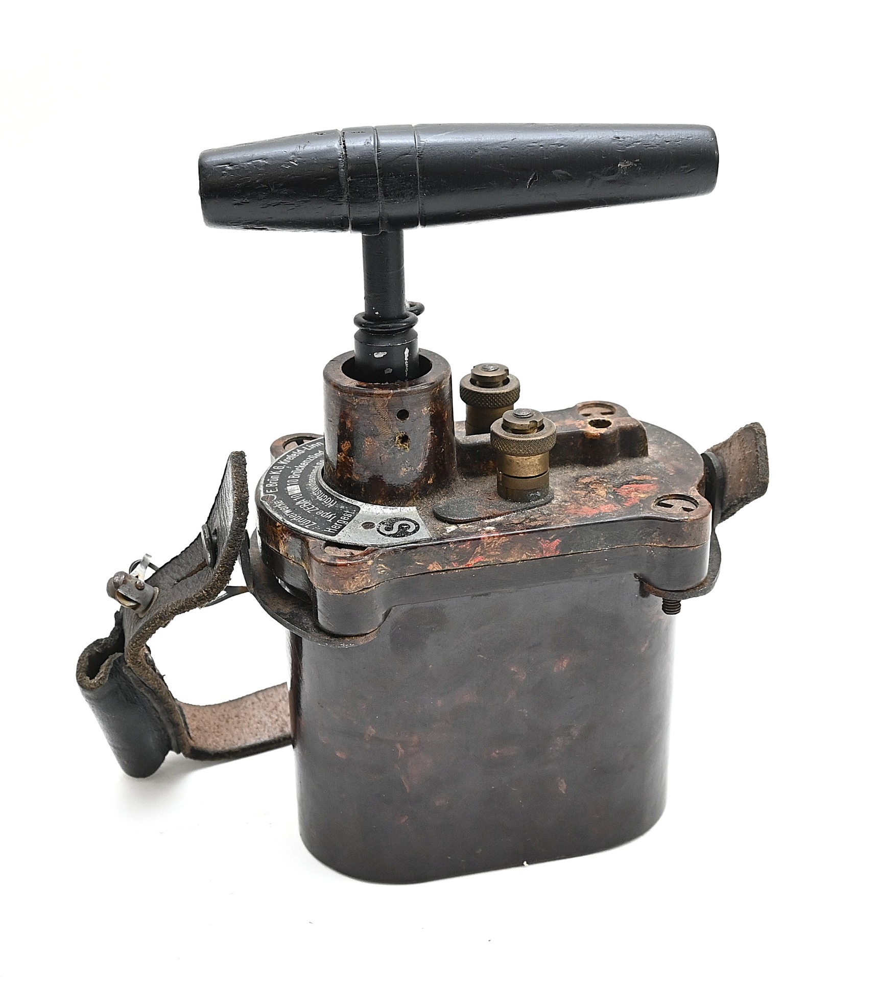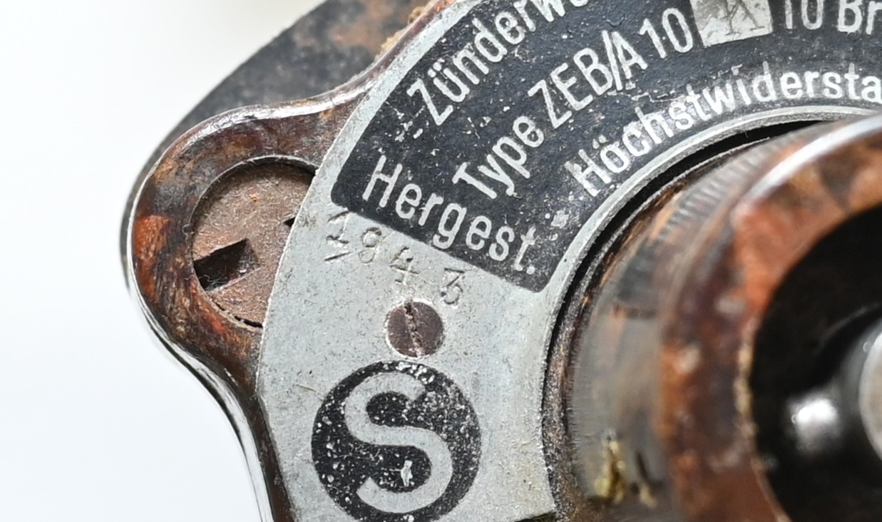 The Zündmaschine shows overall normal signs of wear. The bakelite is void of damages. It comes with the leather carrying handle and the wooden handle. The factory tag with data is present and intact. Nicely dated 1943. Allthough this is a so-called Bergbau Zündmaschine, it would look very nice in a Wehrmacht (pionier) display.