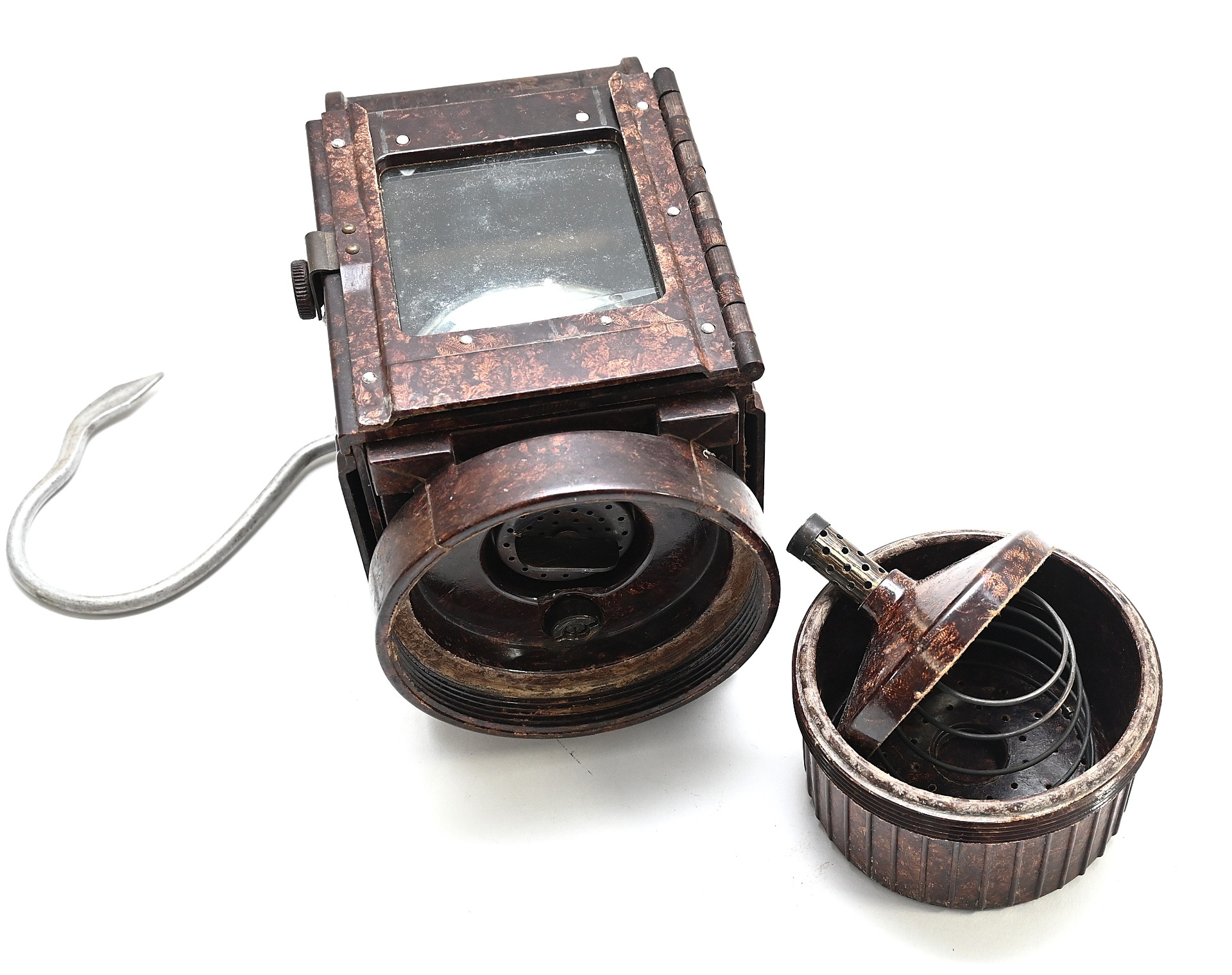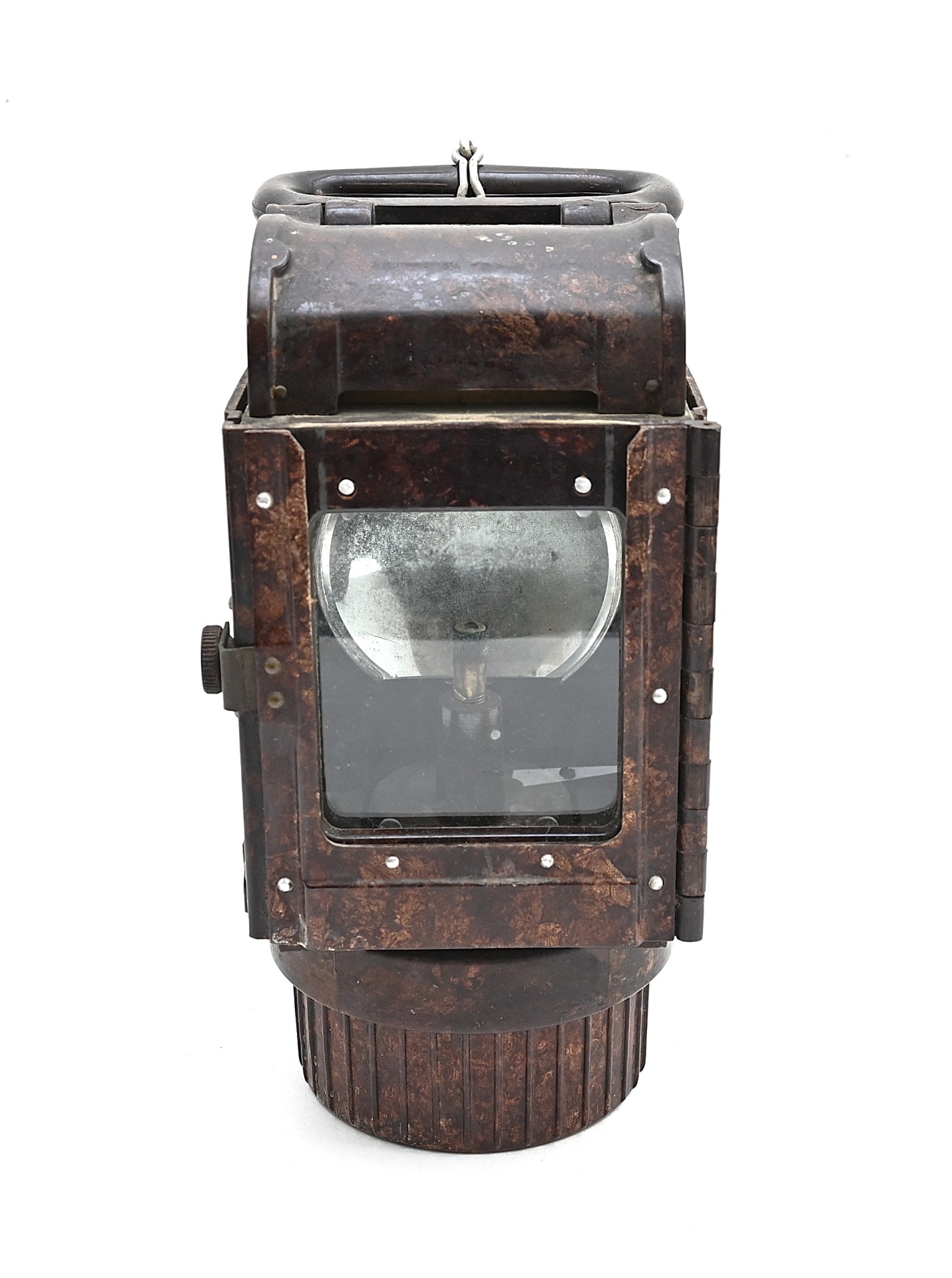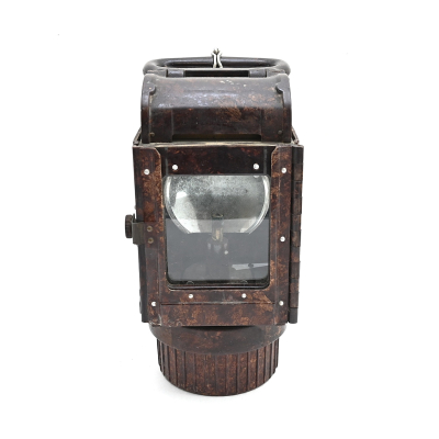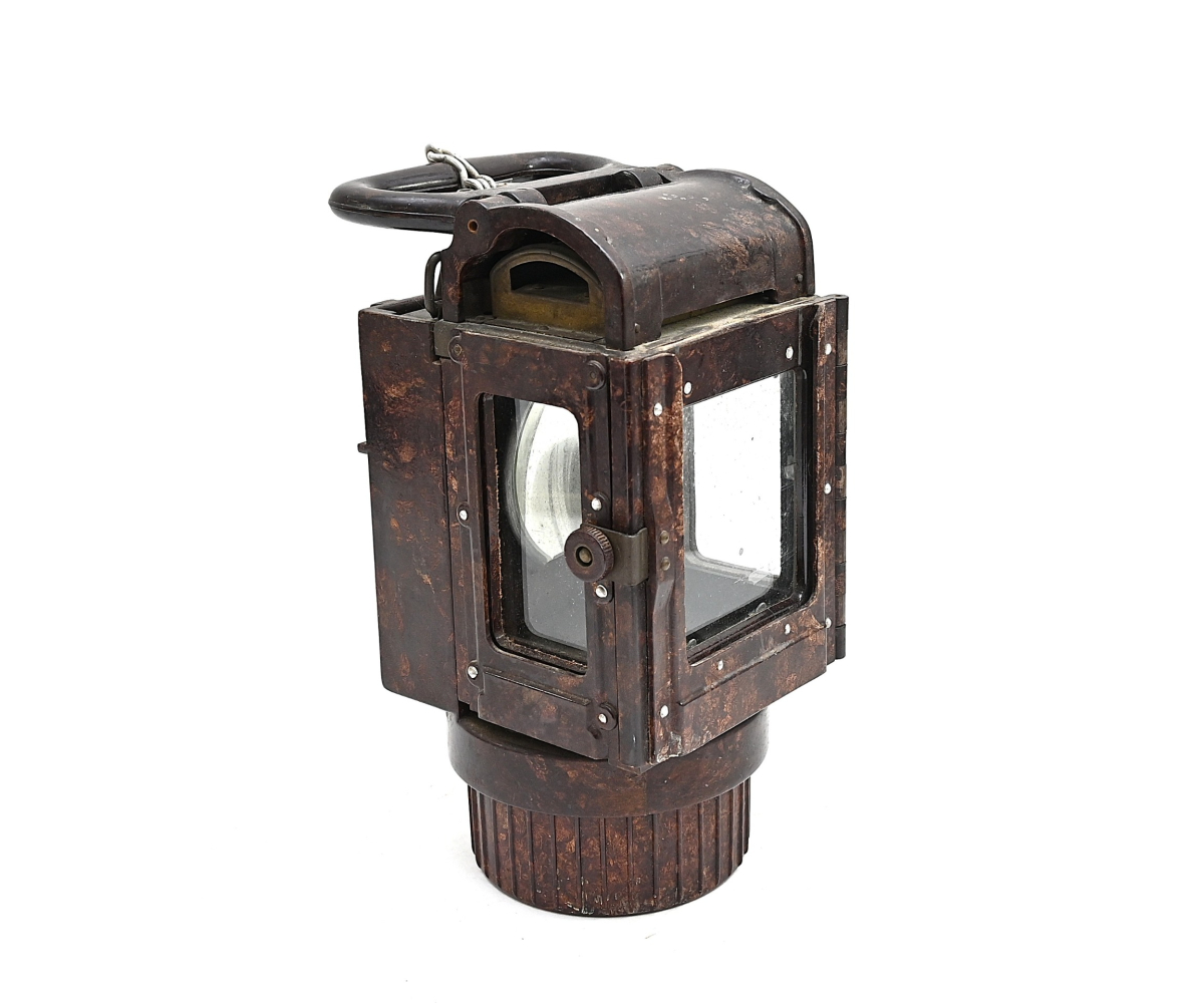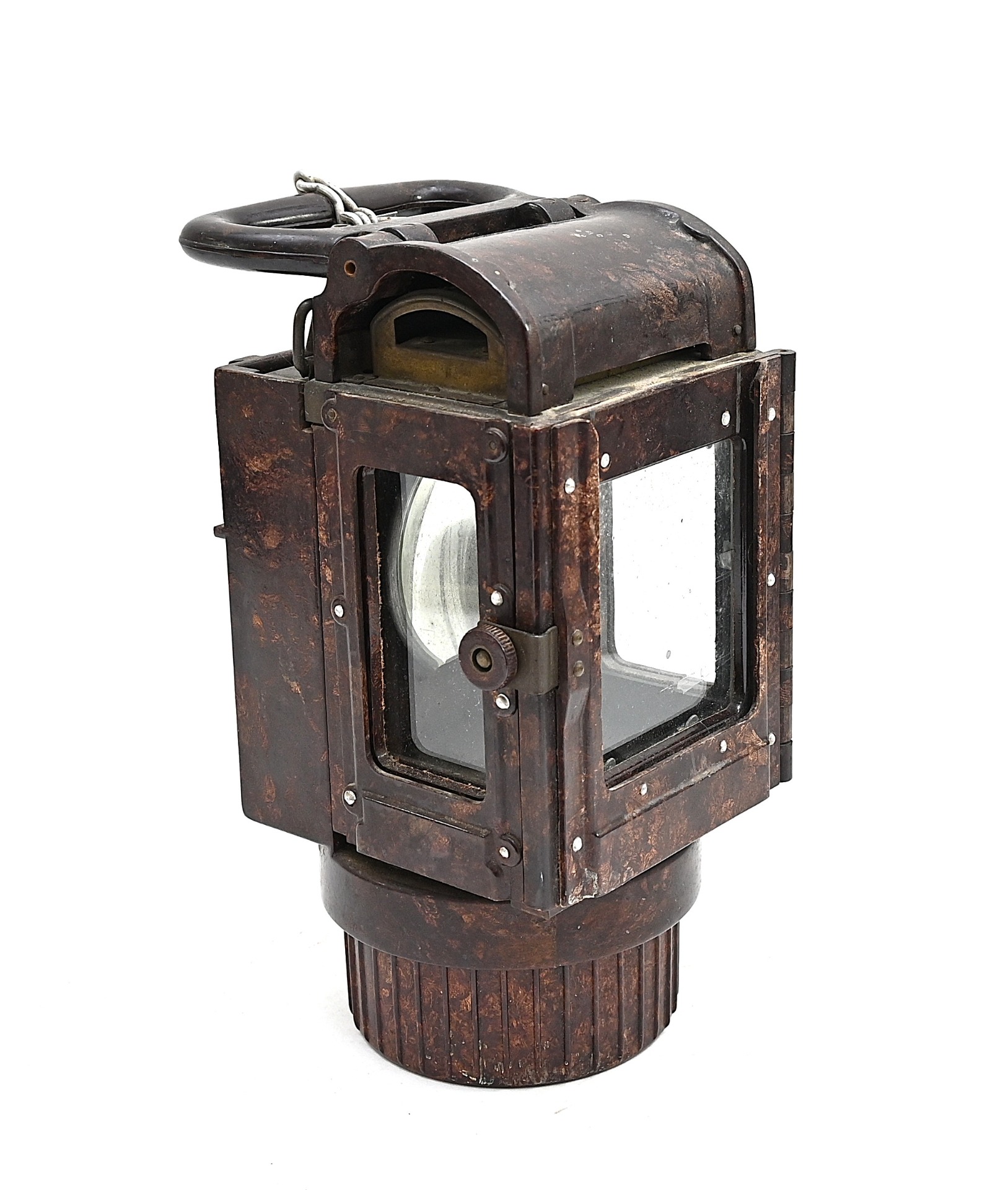 The lantern shows overall signs of wear. All windows are present and intact. Complete with chain and hook. Windows and mirror are intact, small hairline crack on the inside. Marked on the back with a WaA marking. The spring and other parts are also present in the lower part.