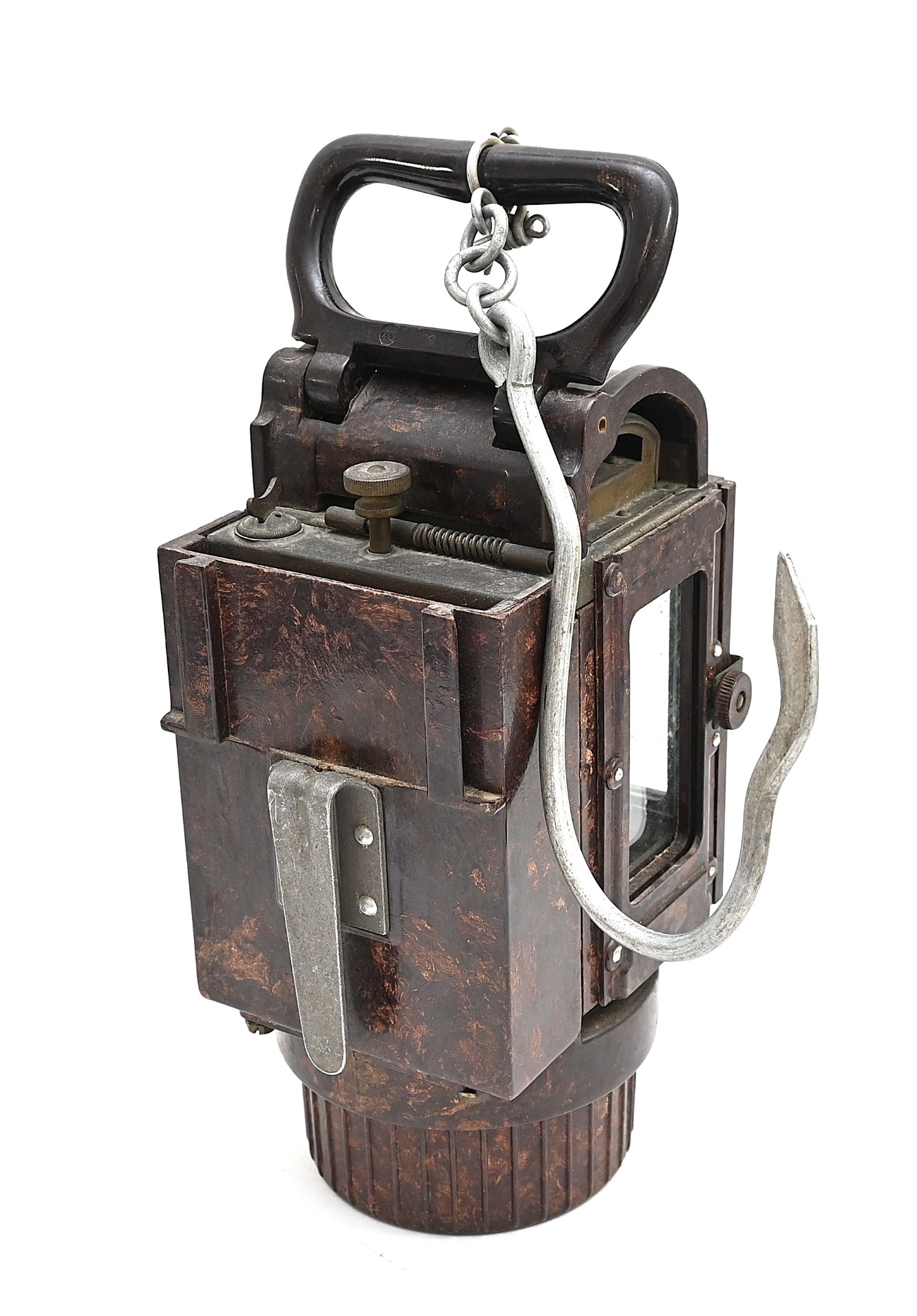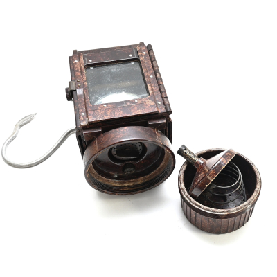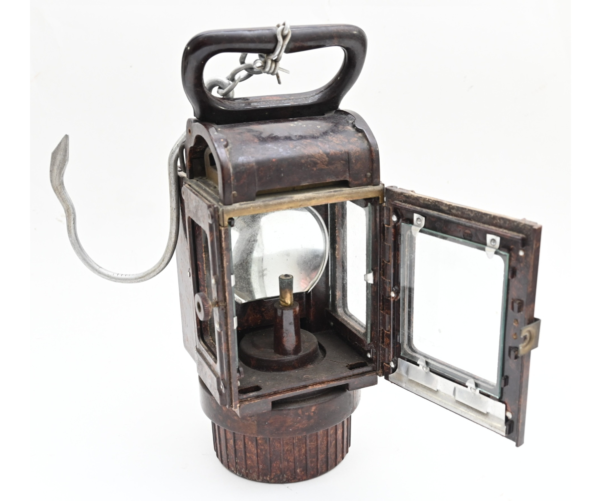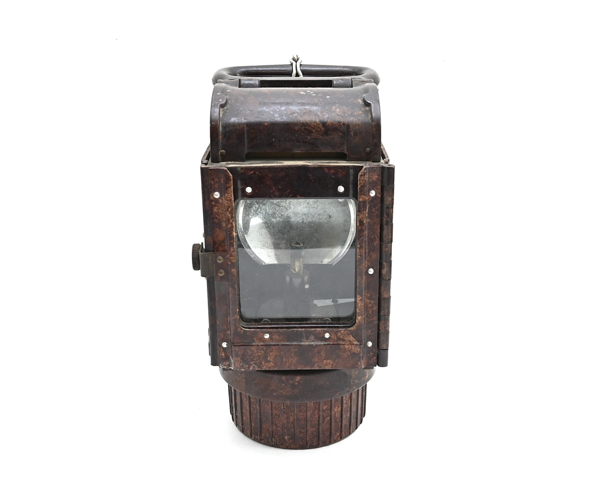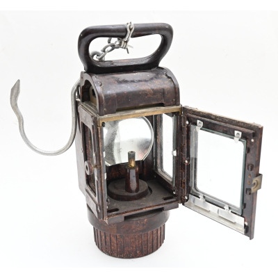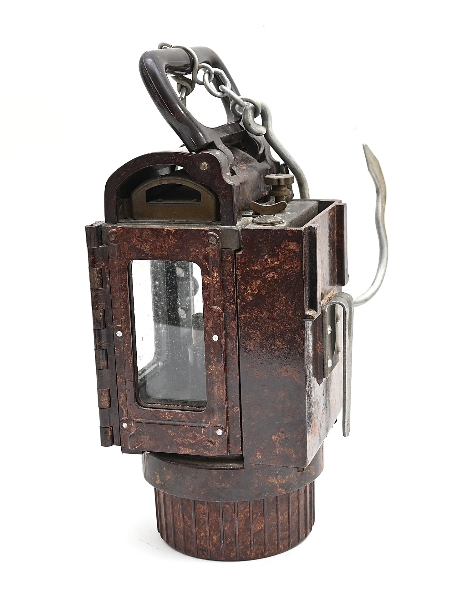 The lantern shows overall signs of wear. All windows are present and intact. Complete with chain and hook. Windows and mirror are intact, small hairline crack on the inside. Marked on the back with a WaA marking. The spring and other parts are also present in the lower part.