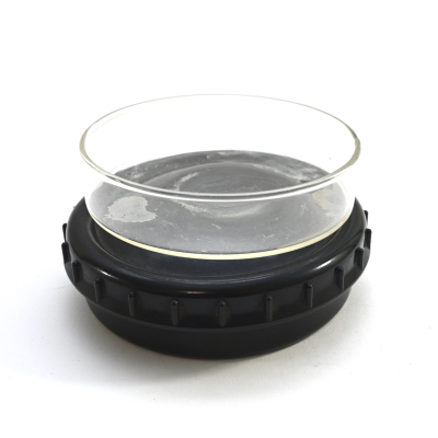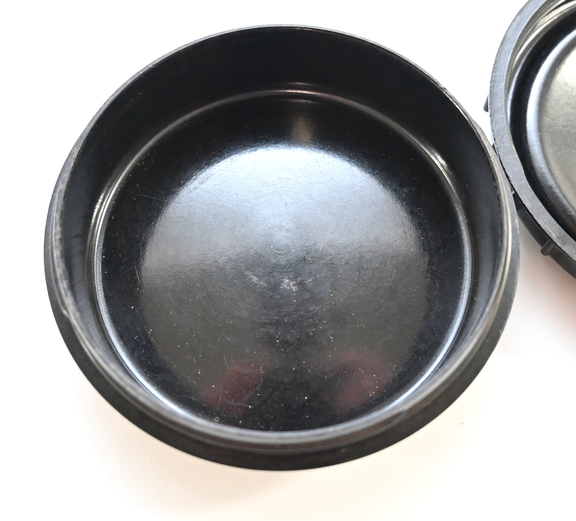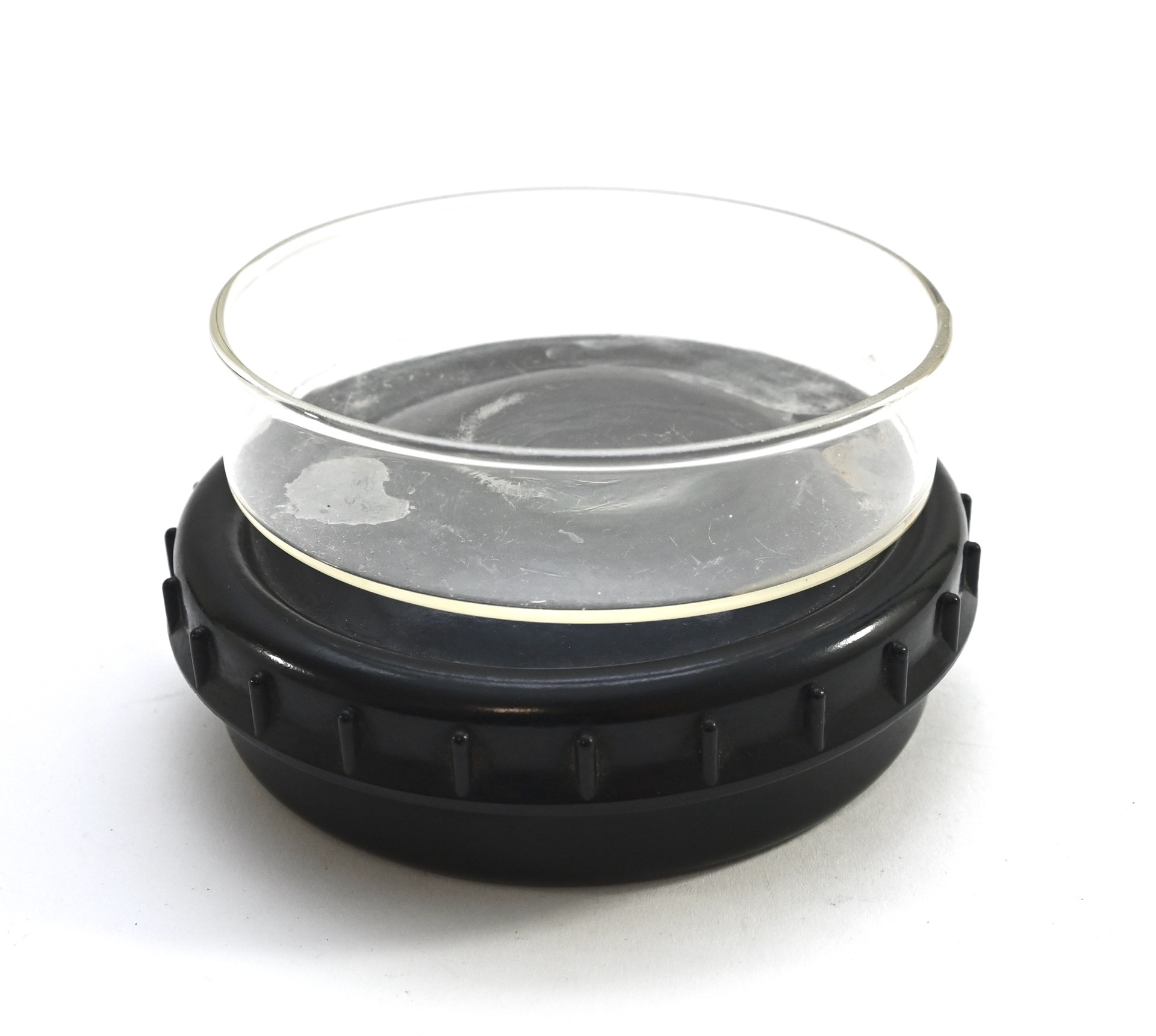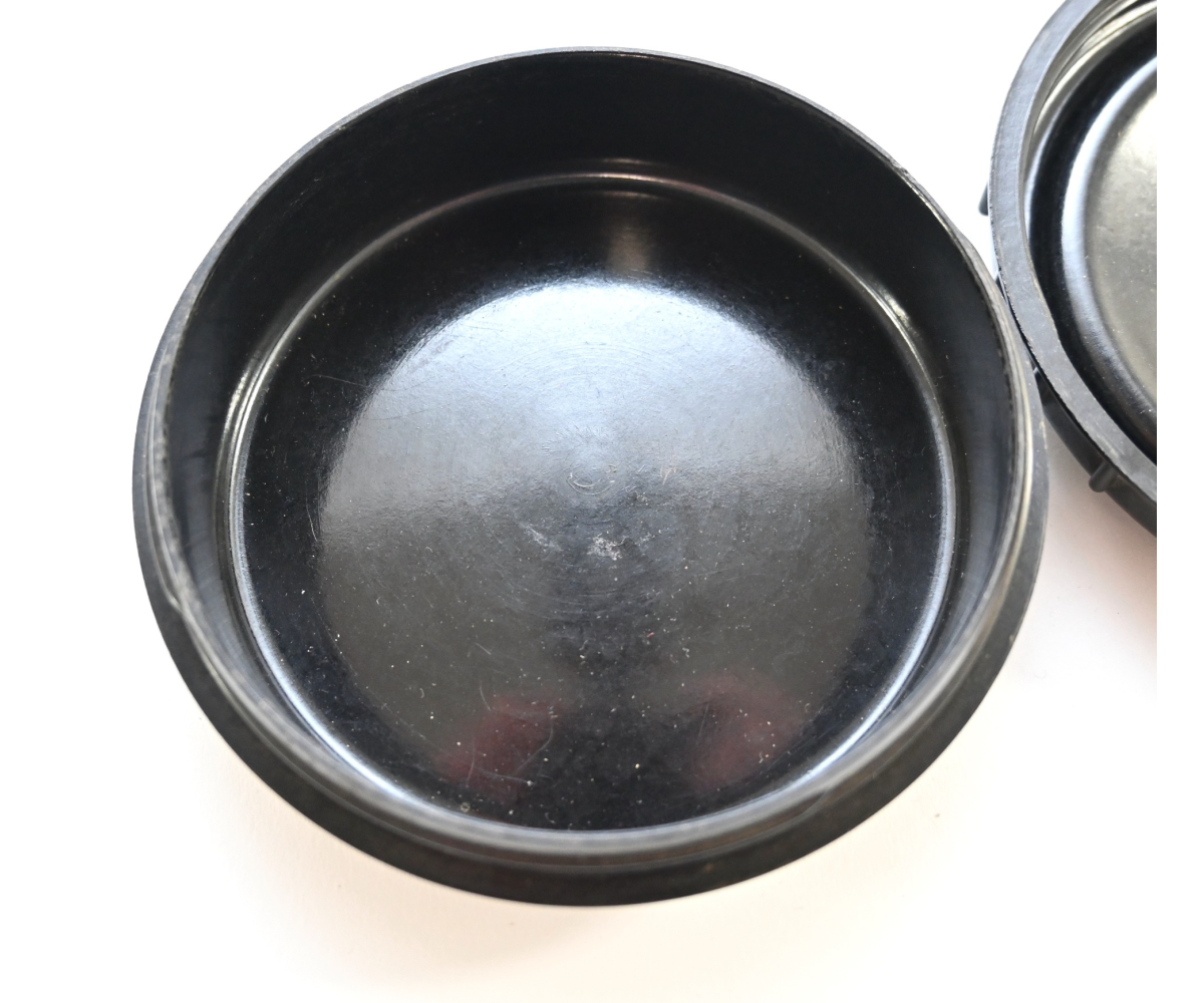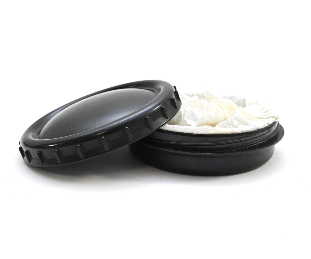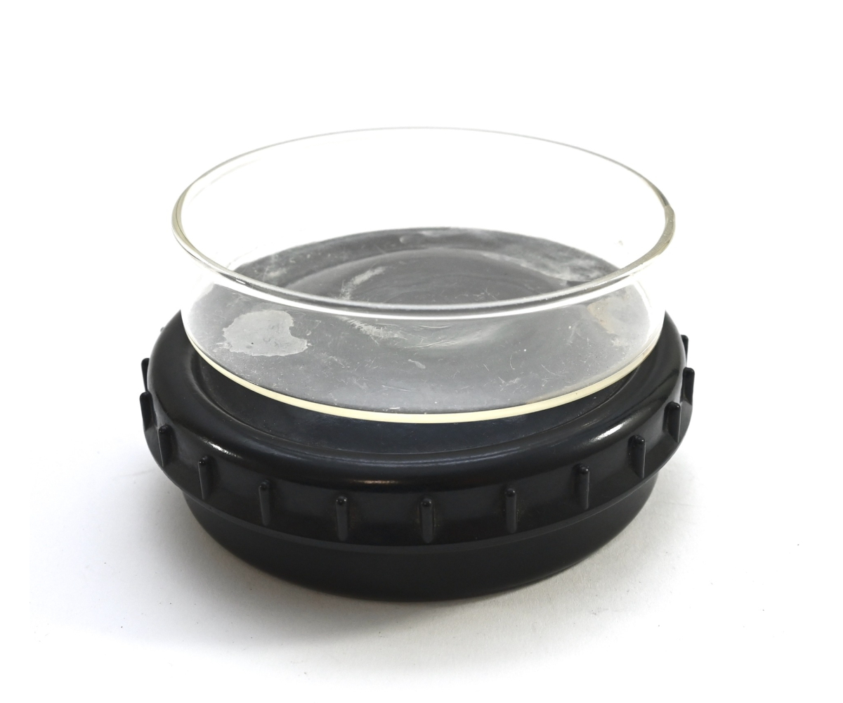 The container shows overall minor signs of use. Both parts are made out of black bakelite and marked on the inside. The glass insert is most likely private purchased. The container opens by 1/4th of a turn like it should.
