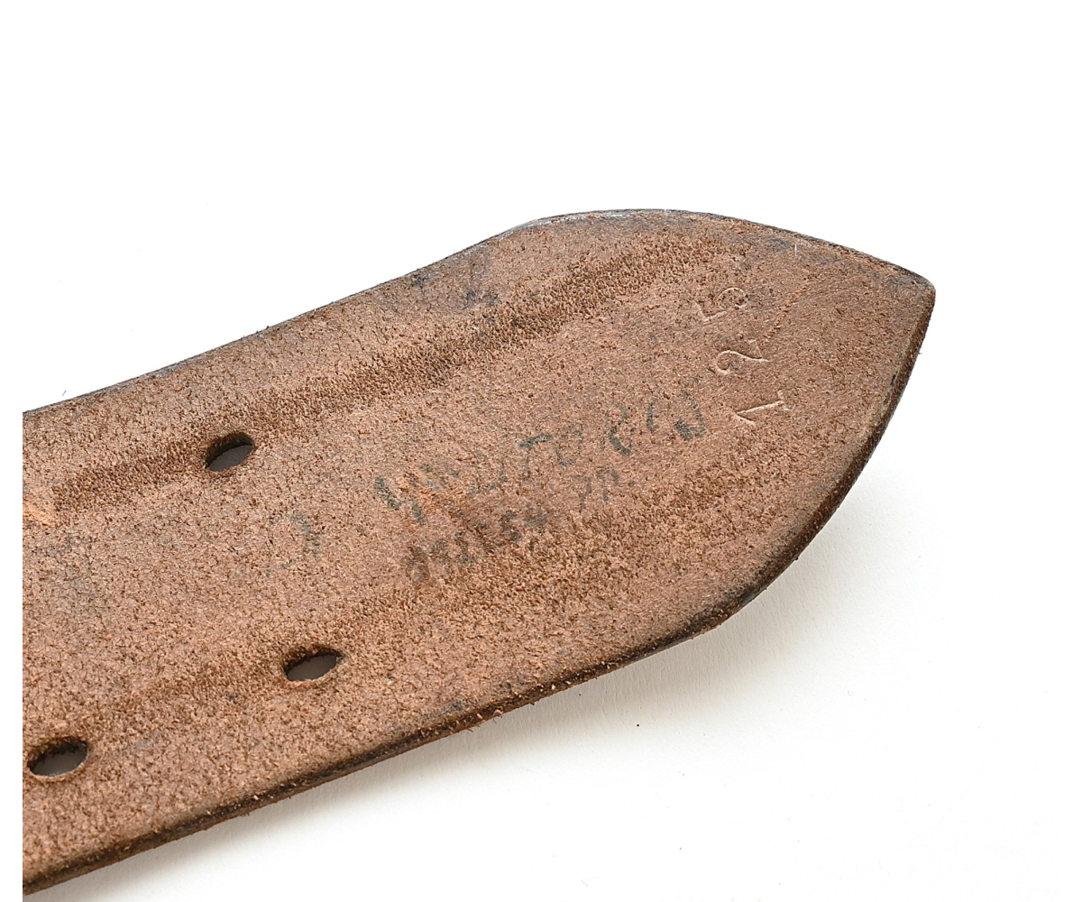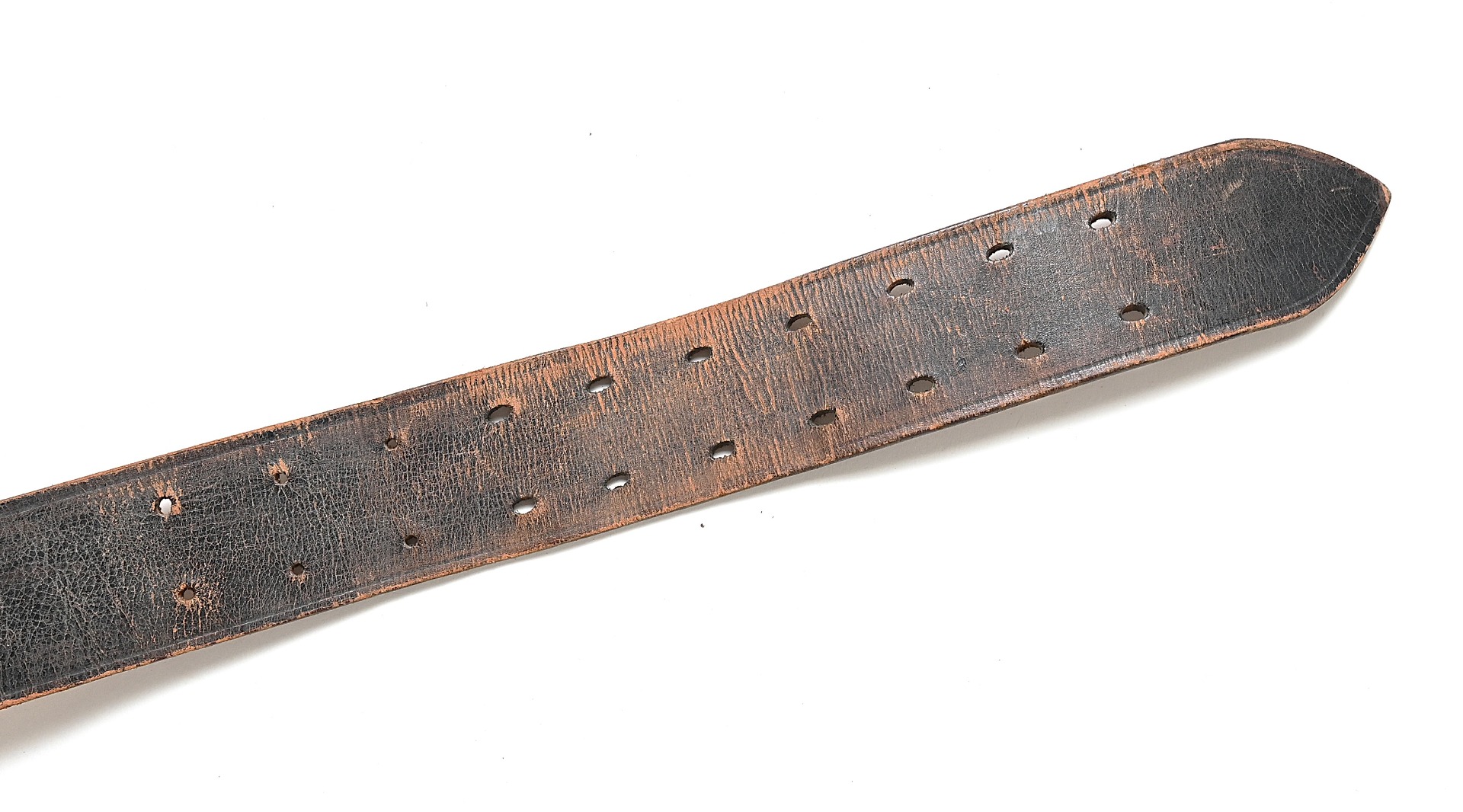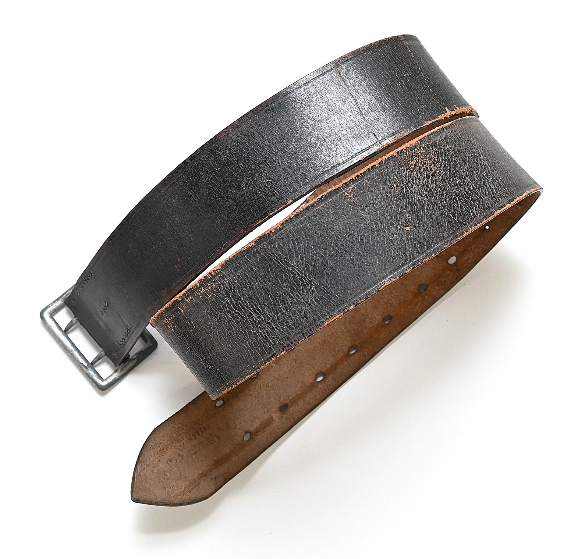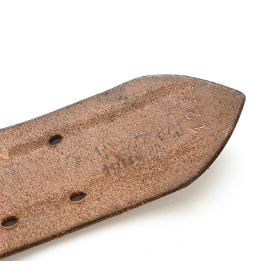 The belt shows overall normal signs of wear. The leather is supple and solid. Its named near the tip, but too vague to read.